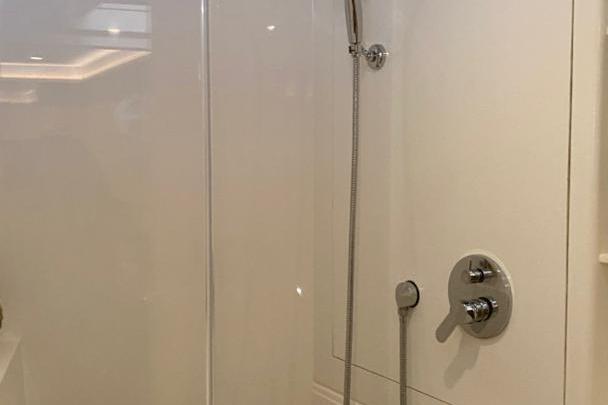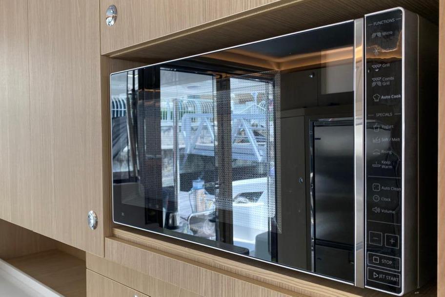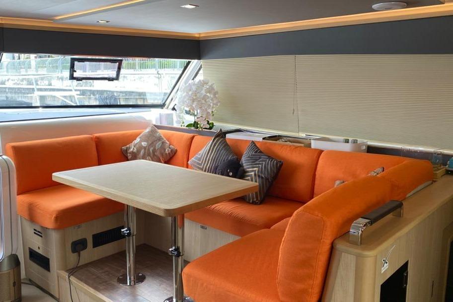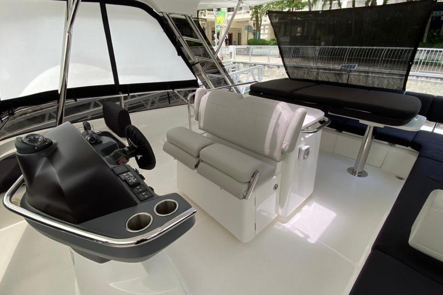 Above, the flybridge serves as the heart of social life on board, an entertainer’s dream featuring a spacious layout complete with a wet bar, built-in BBQ grill, refrigerator, and generous seating. Whether it’s sunset cocktails, family brunches, or lively evening gatherings under the stars, the flybridge provides an inviting setting for unforgettable moments. With an unobstructed view of the horizon, it also doubles as the ideal helm station, giving the captain superb visibility and control. The Fusion sound system extends across both the flybridge and saloon, providing a rich, immersive audio experience that sets the mood throughout the yacht. Whether cruising along scenic coastlines or anchored in a serene bay, the carefully tuned system ensures that every song sounds crystal clear and perfectly balanced.