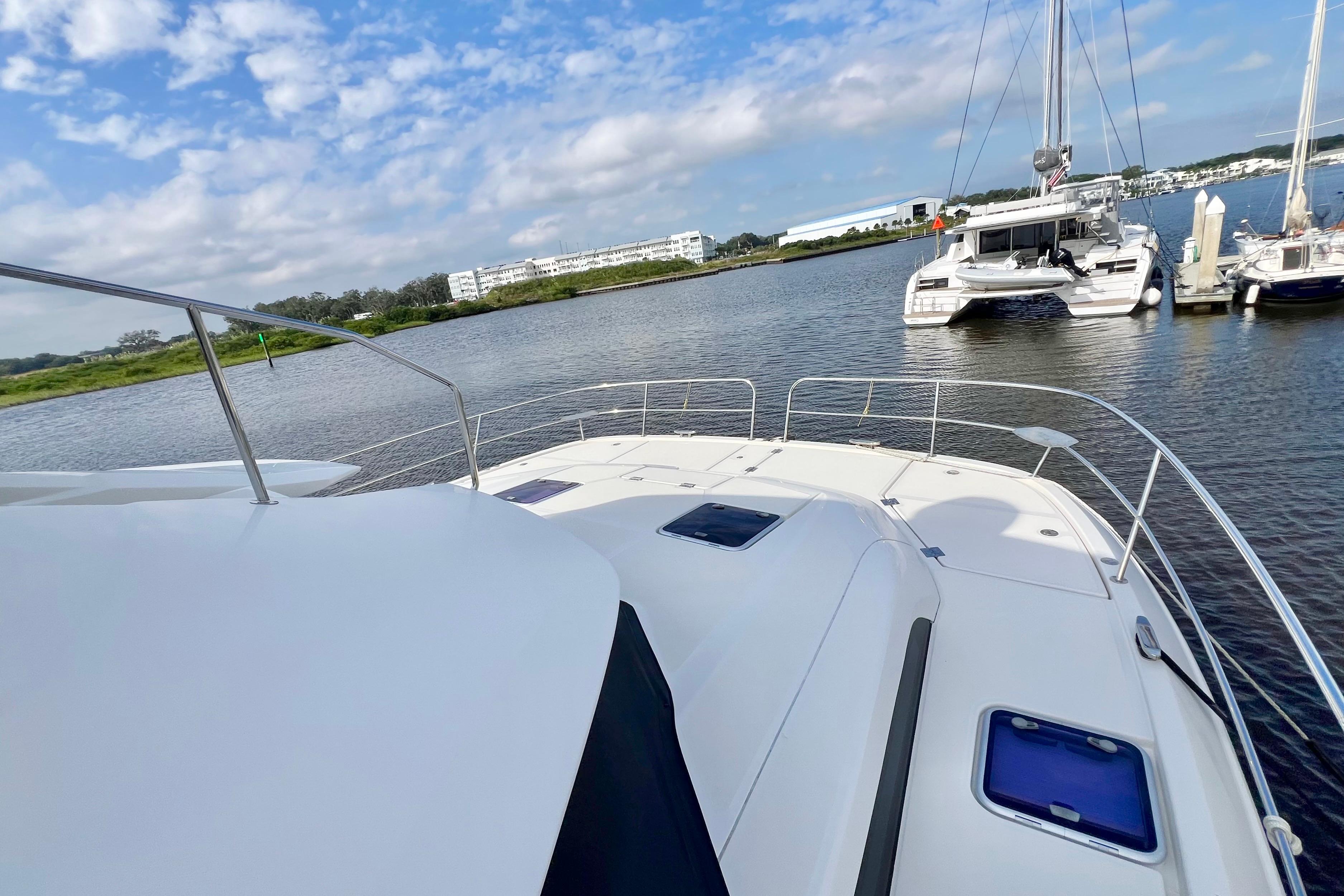 With her twin 370hp Yanmar 8LV-370 turbo diesel engines, Tonga Time achieves a top speed of 24kts. The upgraded 440gal fuel capacity allows her the range to comfortably cruise from FL to Nassau at a steady 18kts.