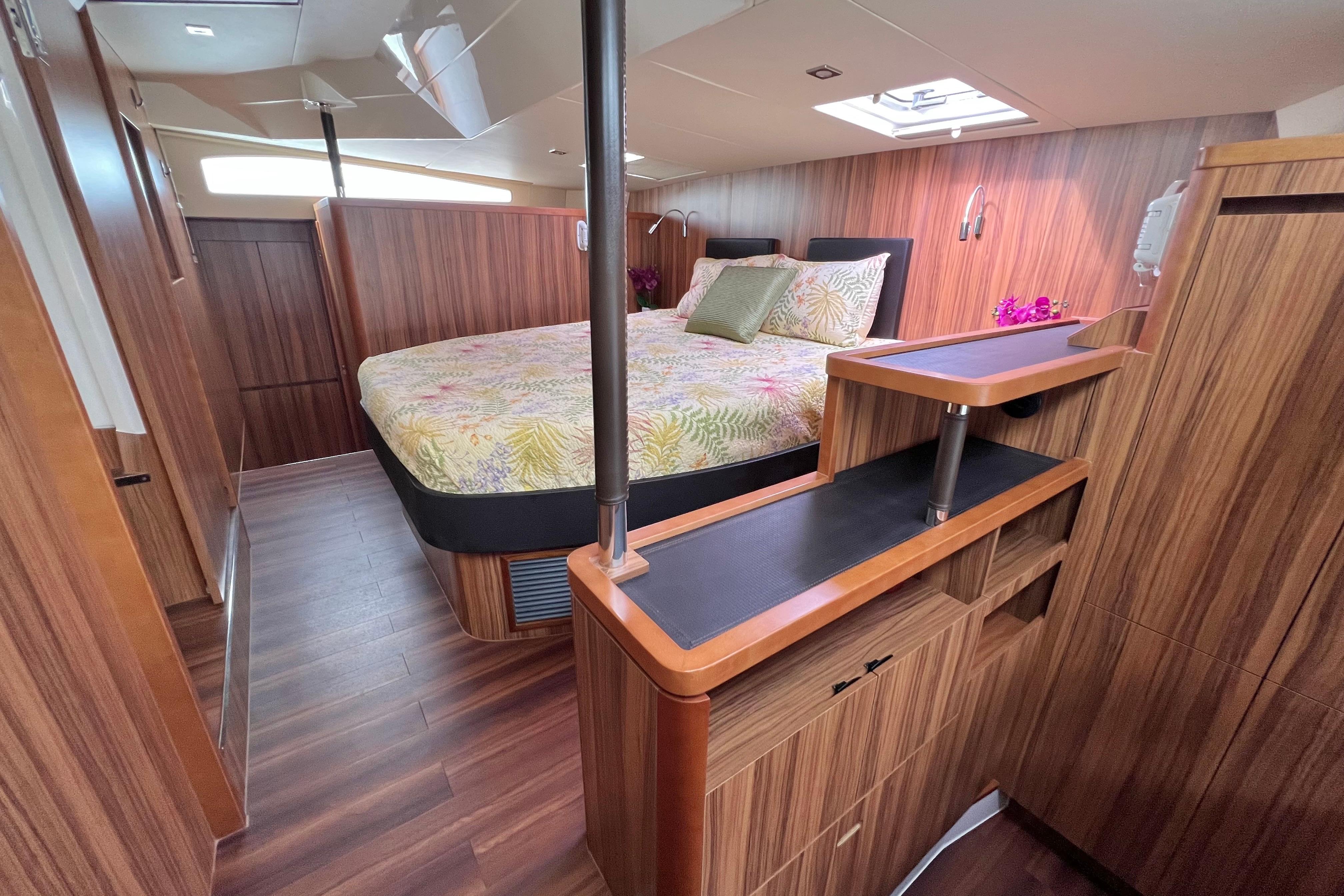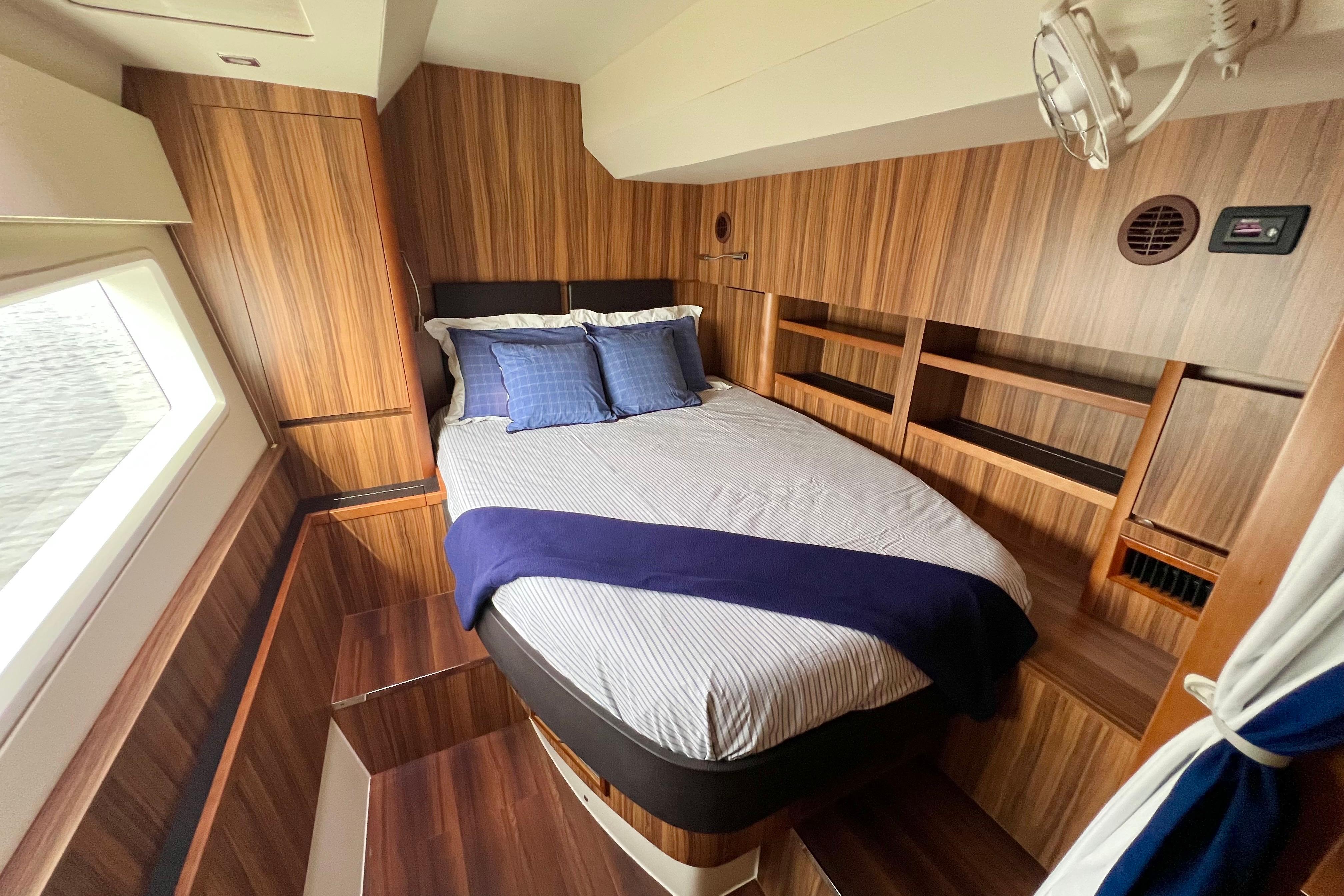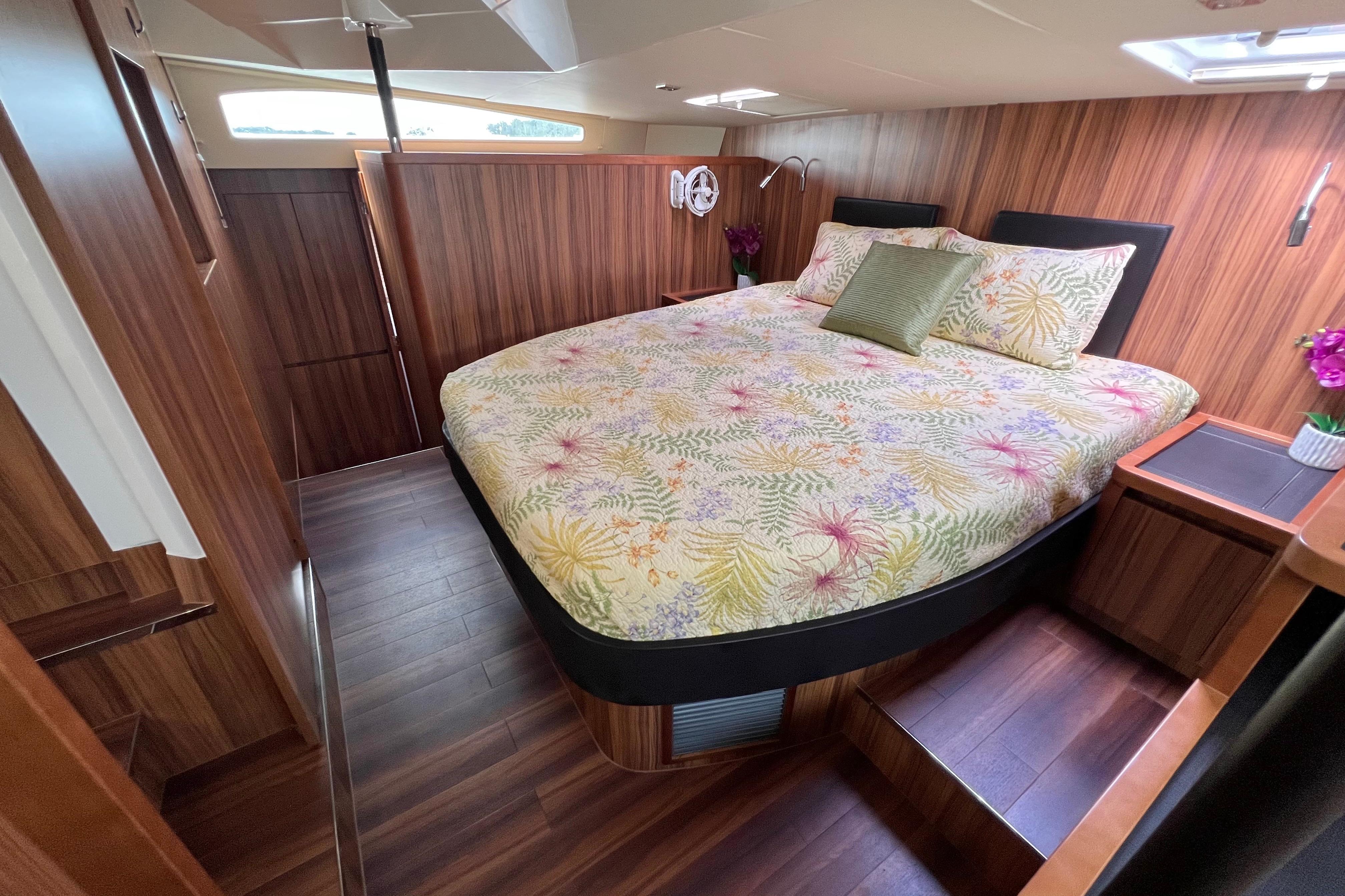 Tonga Time has a 2-cabin layout featuring a full-beam master cabin and workshop / office / work out room. The master includes ample storage and hanging lockers, a full size desk and hanging lockers, and a built in TV mounting area. The master head is spacious and bright with a large walk-in shower. A king bed with upgraded mattress ensures that youll always have a restful nights sleep. The guest berth to port features a queen bed with en suite head that includes a dedicated vanity, porcelain sink, electric toilet, and large separate shower stall. The starboard workshop is designed for ample tools storage or can be used as a dedicated office space with a fold down desk. The attached laundry room features full sized washer and vented dryer, a sink, and easy access to the Spectra watermaker which was repositioned from its standard location in the engine compartment for ease of maintenance. In the common areas, the open concept design offers a fantastic flow between exterior cockpit into the galley and salon. The space features a large folding glass door and a swing up window opening up to a fold down bar and fixed bar stools making a wonderful entertaining area. This open concept design combines with numerous overhead, side, and forward opening hatches to offer fantastic ventilation throughout the boat.