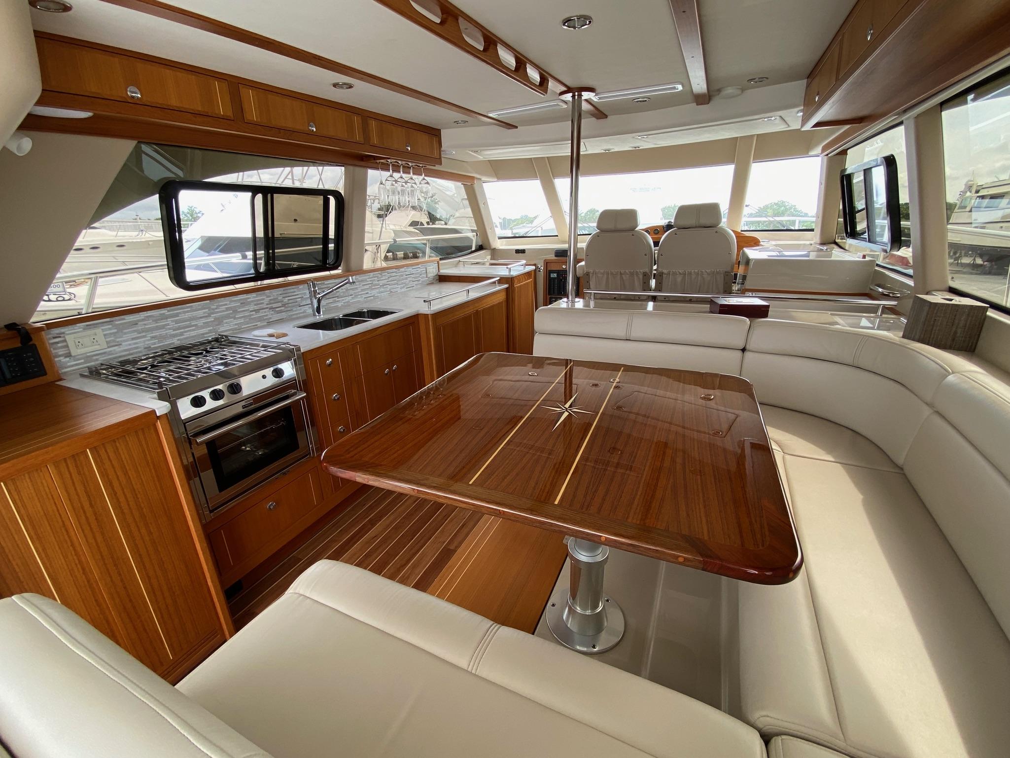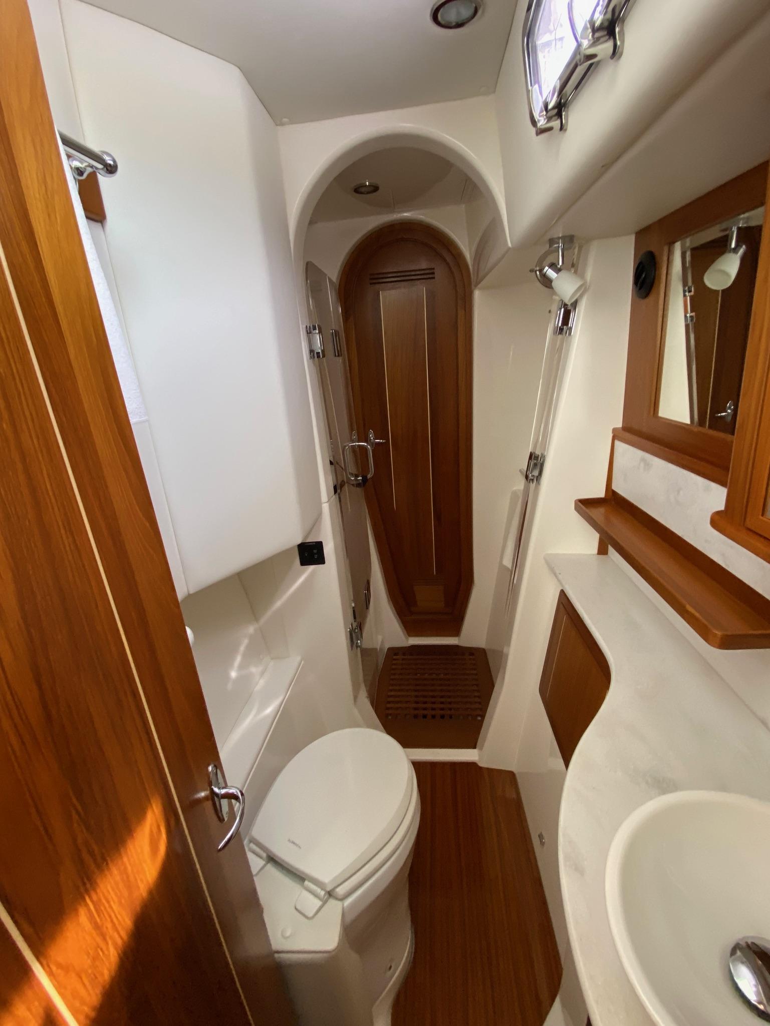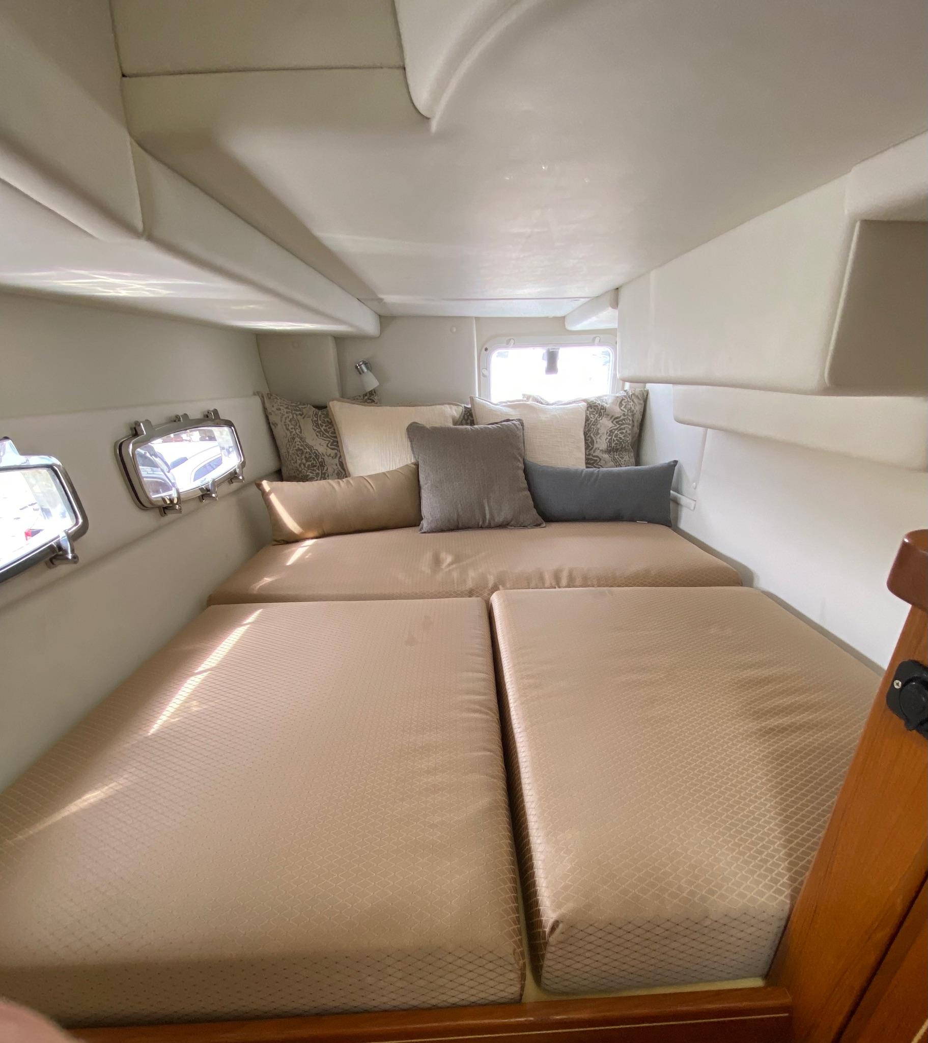 The modern design starts in the salon with an amazing open window layout that brings the grand outdoors right to you. Enjoy Mother Nature in all of her glory with a 360 degree view from every seat! Each hull has a first class head with a shower and large vanity. Below the dinette is a queen size guest stateroom, complete with hanging locker, portlights, and reading lights. Below the galley is a 2nd guest stateroom with a twin bed, portlights, and reading lights. Forward is the absolutely grand, full width, King Island Master stateroom; unheard of in a 40’er. This stateroom includes port & starboard hanging lockers, drawer sets, starboard vanity.