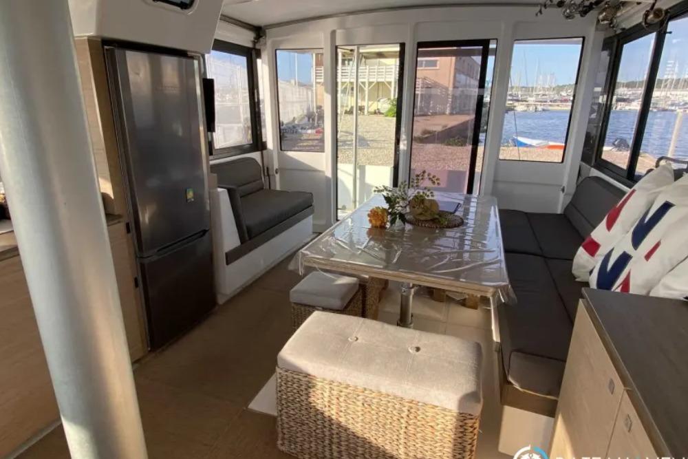 Grâce à son design unique, ce Bali 4.0 offre une circulation fluide entre le cockpit et le carré intérieur, sans séparation, créant un véritable espace de vie ouvert, baigné de lumière naturelle. L’ensemble est conçu pour offrir une ambiance chaleureuse, conviviale et résolument tournée vers l’extérieur, avec une vue panoramique sur la mer depuis le carré. Le pont avant, entièrement rigide, ajoute une surface de détente idéale, prolongée par un bain de soleil intégré, parfait pour profiter des mouillages.