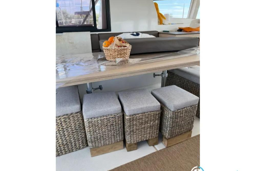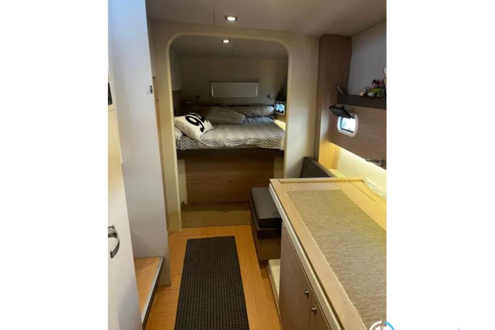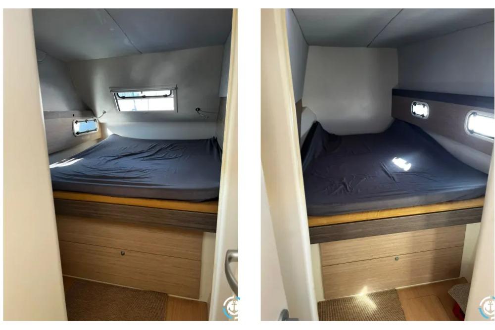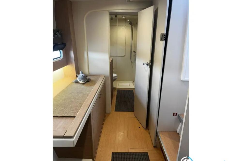 Ce catamaran propose quatre cabines doubles confortables, pouvant accueillir jusqu’à huit personnes dans un cadre raffiné. Trois salles d’eau modernes avec WC électriques assurent un confort optimal, même lors de longues navigations. À l’intérieur, on retrouve une climatisation installée dans trois cabines, un dessalinisateur, une cuisine équipée avec réfrigérateur, four et réchaud 3 feux gaz, ainsi qu’un système audio Hi-Fi et une télévision, pour le confort et le divertissement à bord.