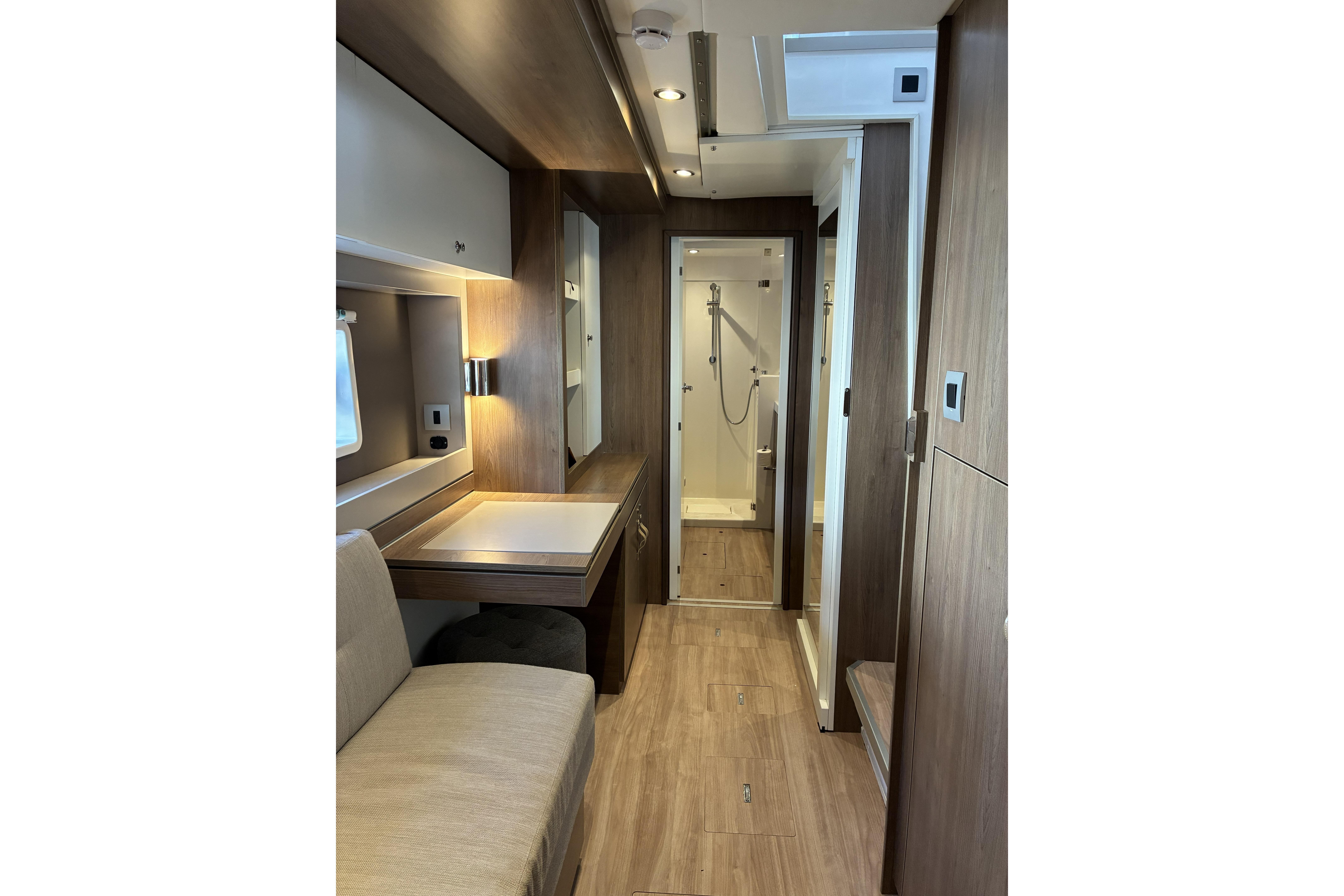 Salon: chart table reading light in leather, folding seat for chart table, salon table with bar, design standing lights with dimmer, padded salon upholstery with armrests, and electric rear bay lift system assisted by hydraulic cylinders.