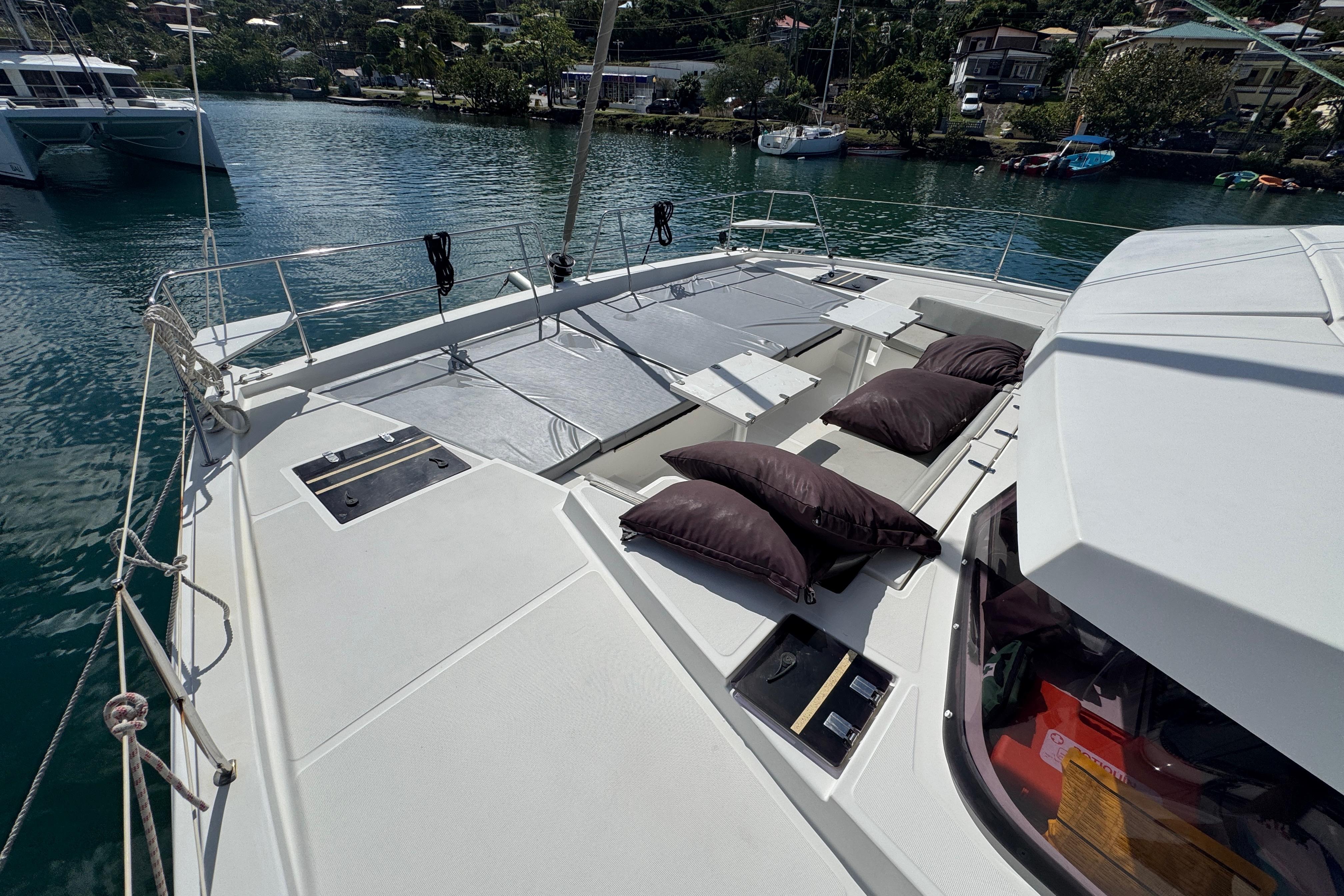 Forward deckThe forward deck has another large cockpit with two removable tables and large sun-loungers. This “marine terrace” provides a great friendly spot whether at anchor or underway. The overhang over the windows on the cabin top provides much needed shade and prevents rainwater from dripping into the saloon.