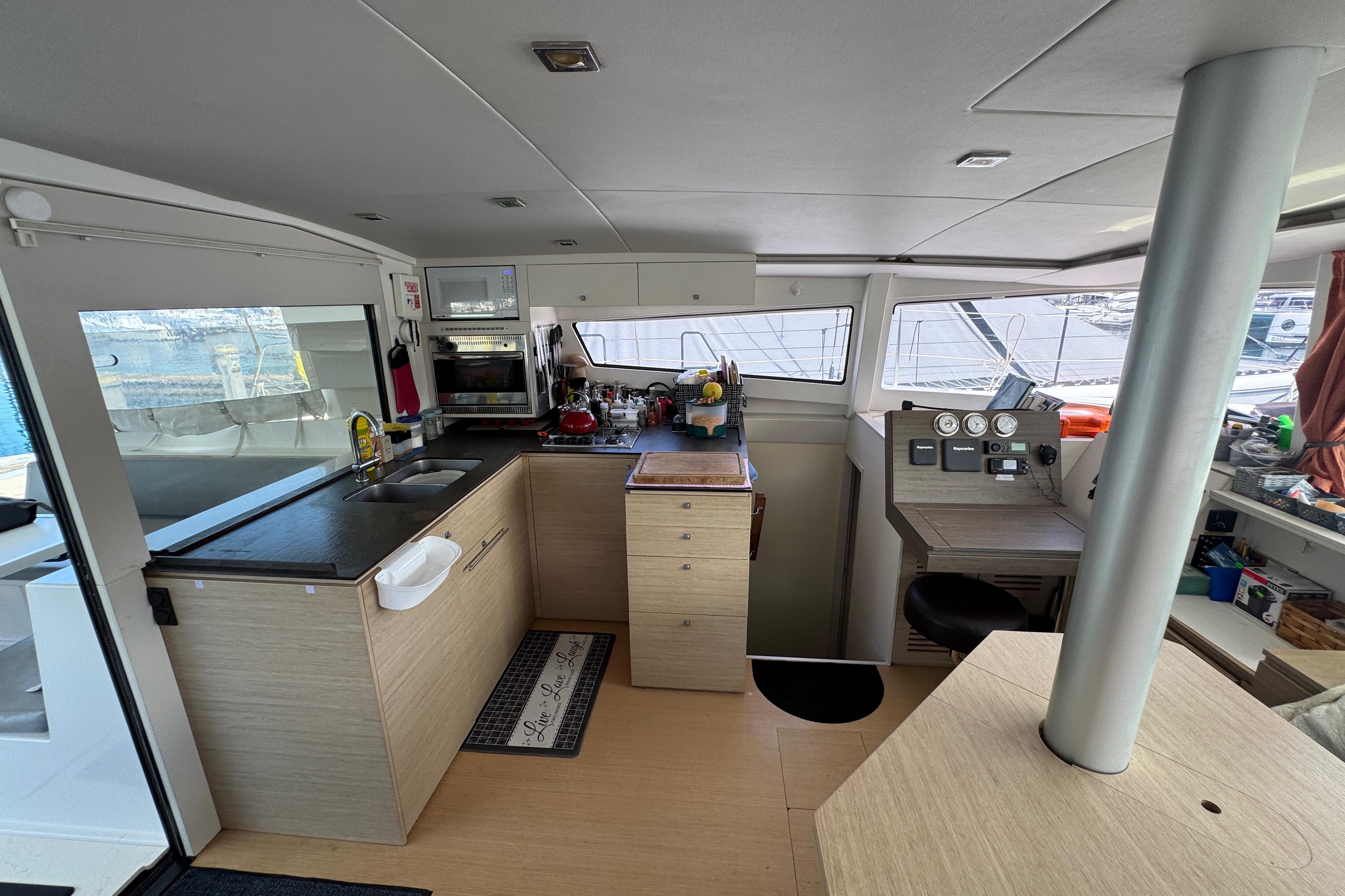 Salon The L-shaped kitchen is positioned in the rear left area of the dinette and has a large window overlooking the aft cockpit. The salon has a Modern interior design with washable vinyl headliners while the the seats and cushions are in an off-white and brown leatherette. The navigation station is forward on the port side of the main cabin. LED lights and Hella-turbo grilled and Caframo’s grill-free, whisper-quiet 12V fans enhance the living space. There is a lot of storage throughout galley and the salon. The oven and microwave are at eye level, which makes cooking much safer and easier while underway. The kitchen is equipped with a gas oven and an American-style fridge.