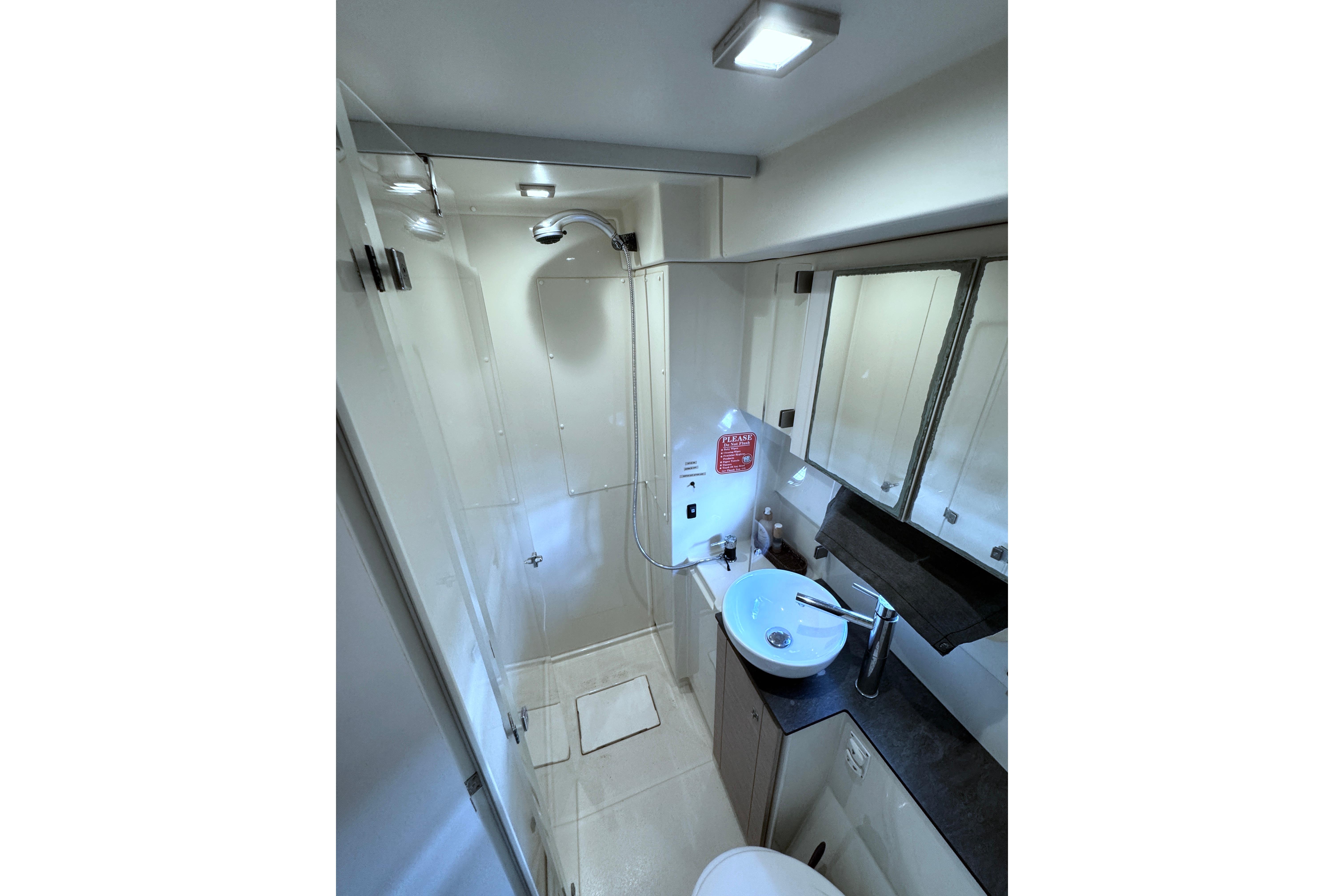 CabinsEach hull has two large cabins with queen-sized island beds, LED lights and Hella-turbo grilled and Caframo’s grill-free, whisper-quiet 12V fans. On the port-side each cabin has its own ensuite bathroom while the starboard-side share a larger bathroom with walk-in shower. Each bathroom has a porcelain sink, shower and electric fresh/saltwater flush toilet. This boat has an additional crew cabin.