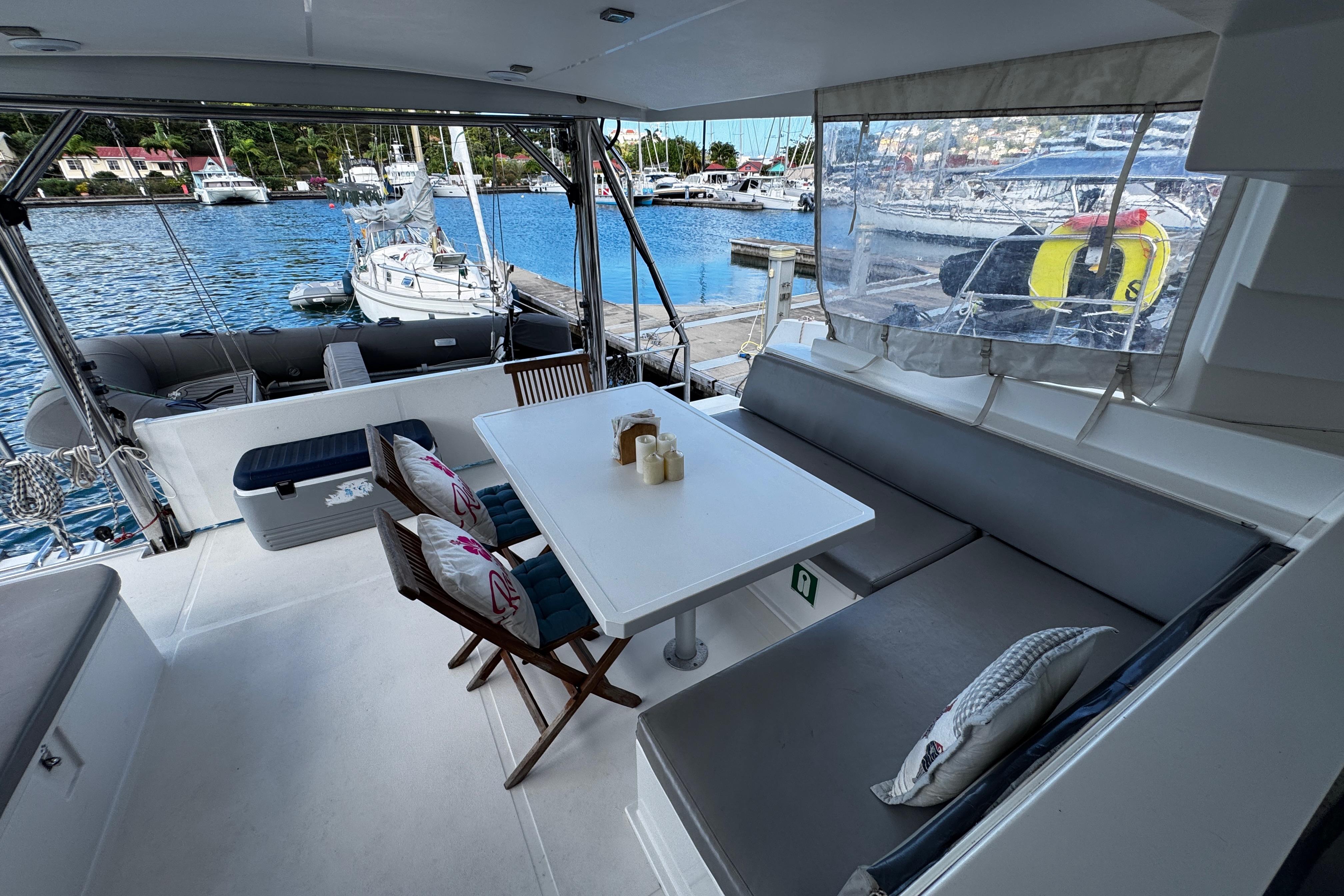 Cockpit The aft cockpit has a large dining table that can easily seat 6-8 people. The L-shaped bench-seat can seat 4 people with an additional 4 chairs. The bench seat can also serve as a watch-keepers bunk during a passage. Once the dinghy is lowered, the “gate” folds down to become a passerelle down to the water or to the dock, which extends the cockpit a further 2ft and gives it the “infiniti pool” look into the ocean.