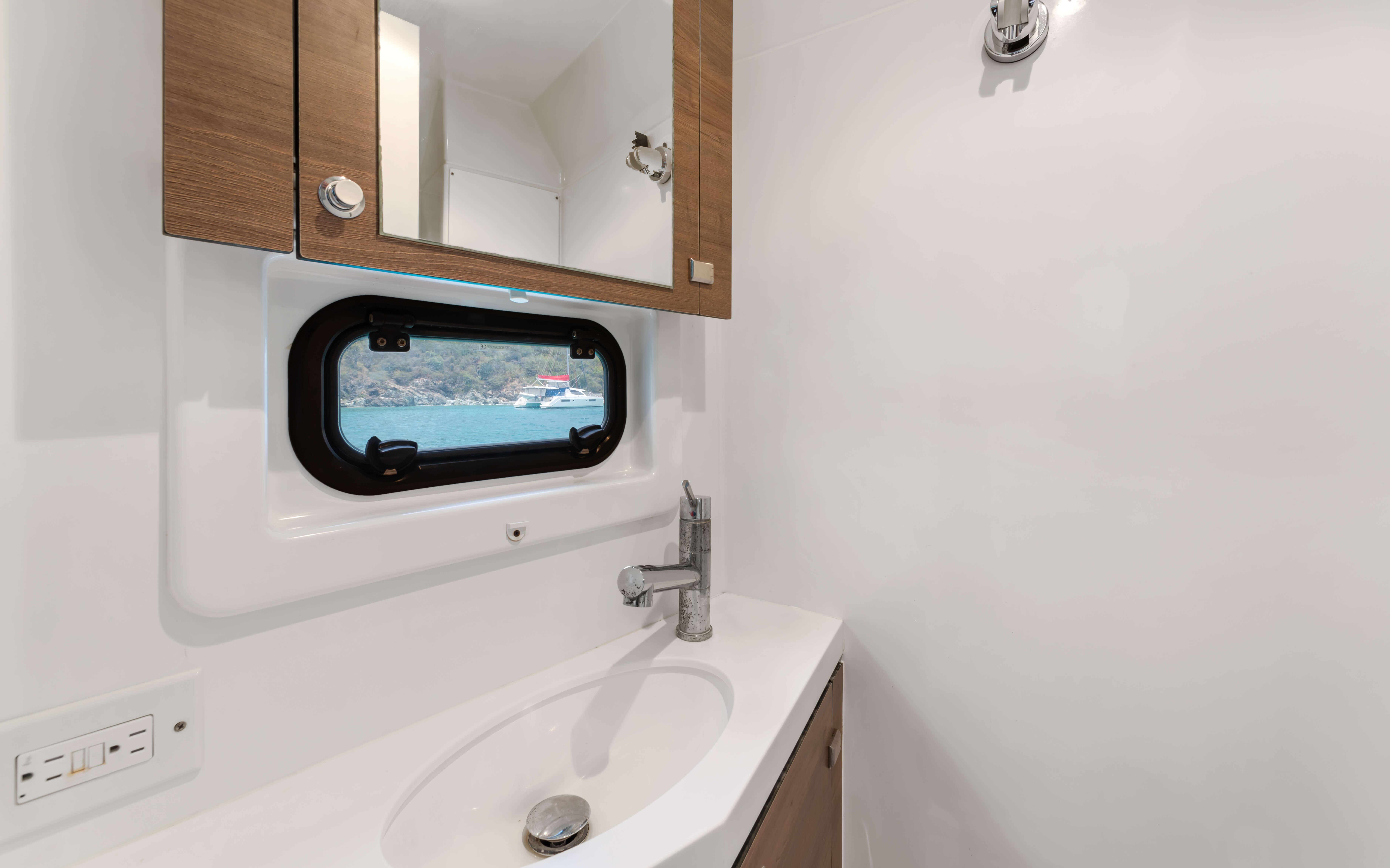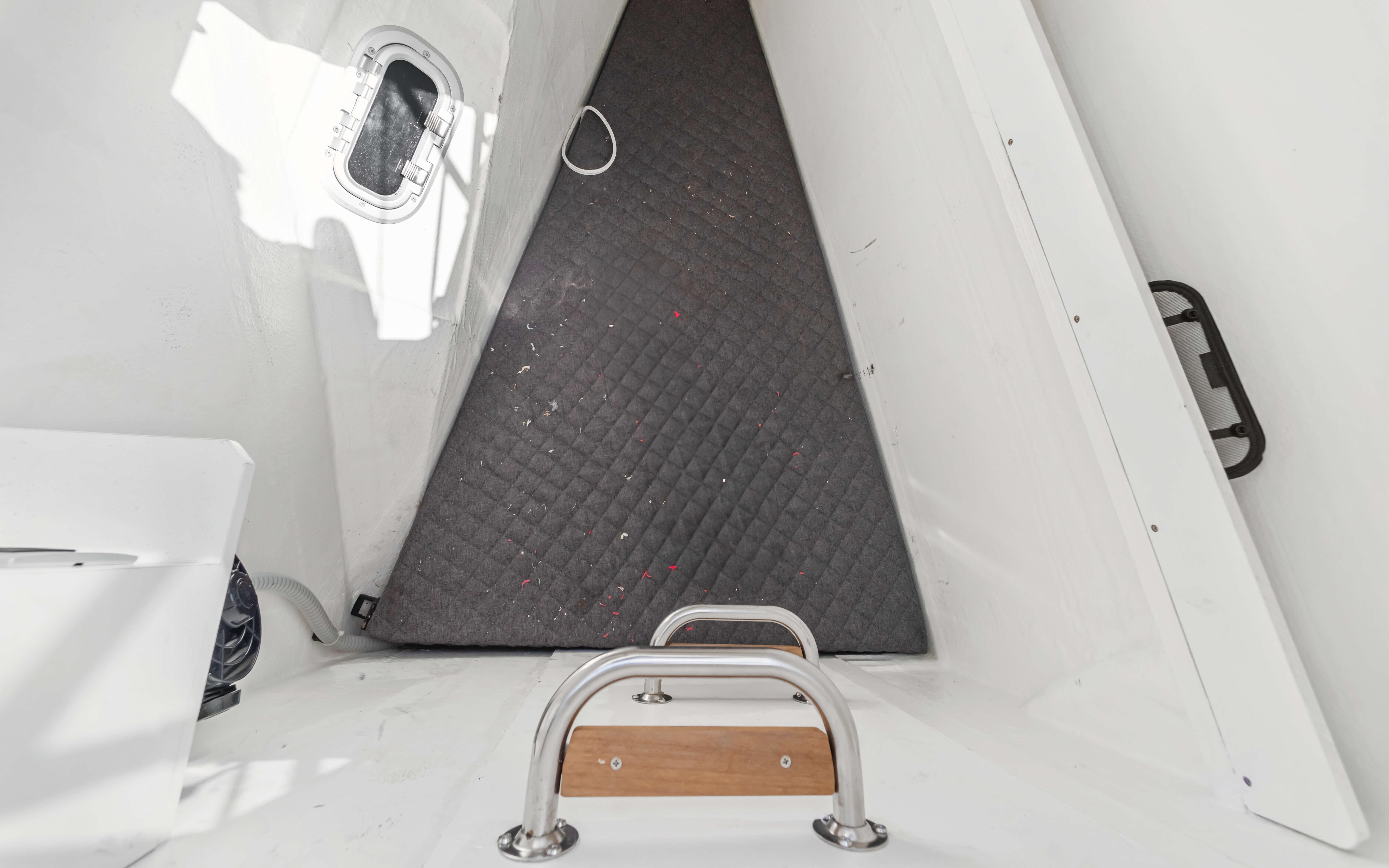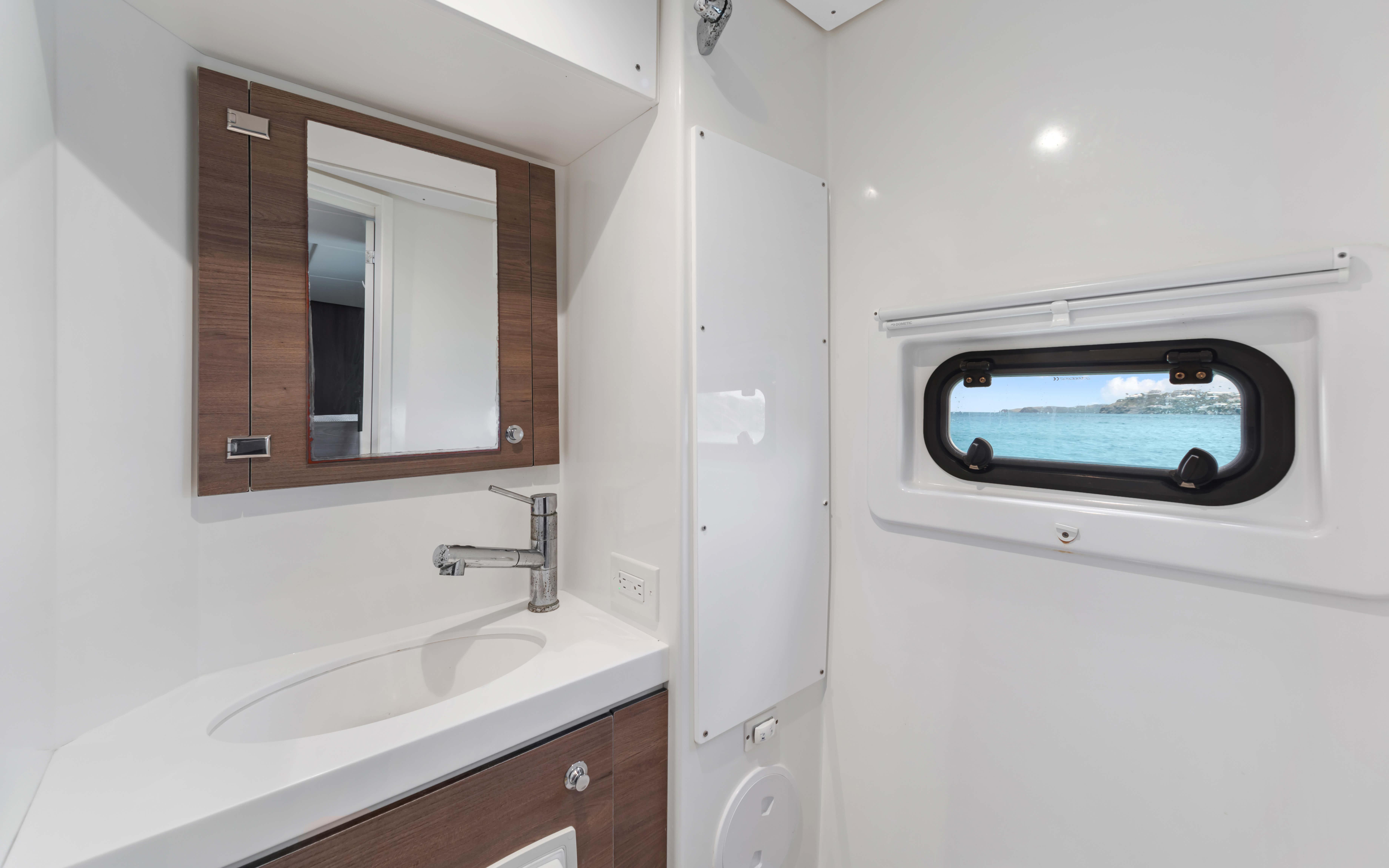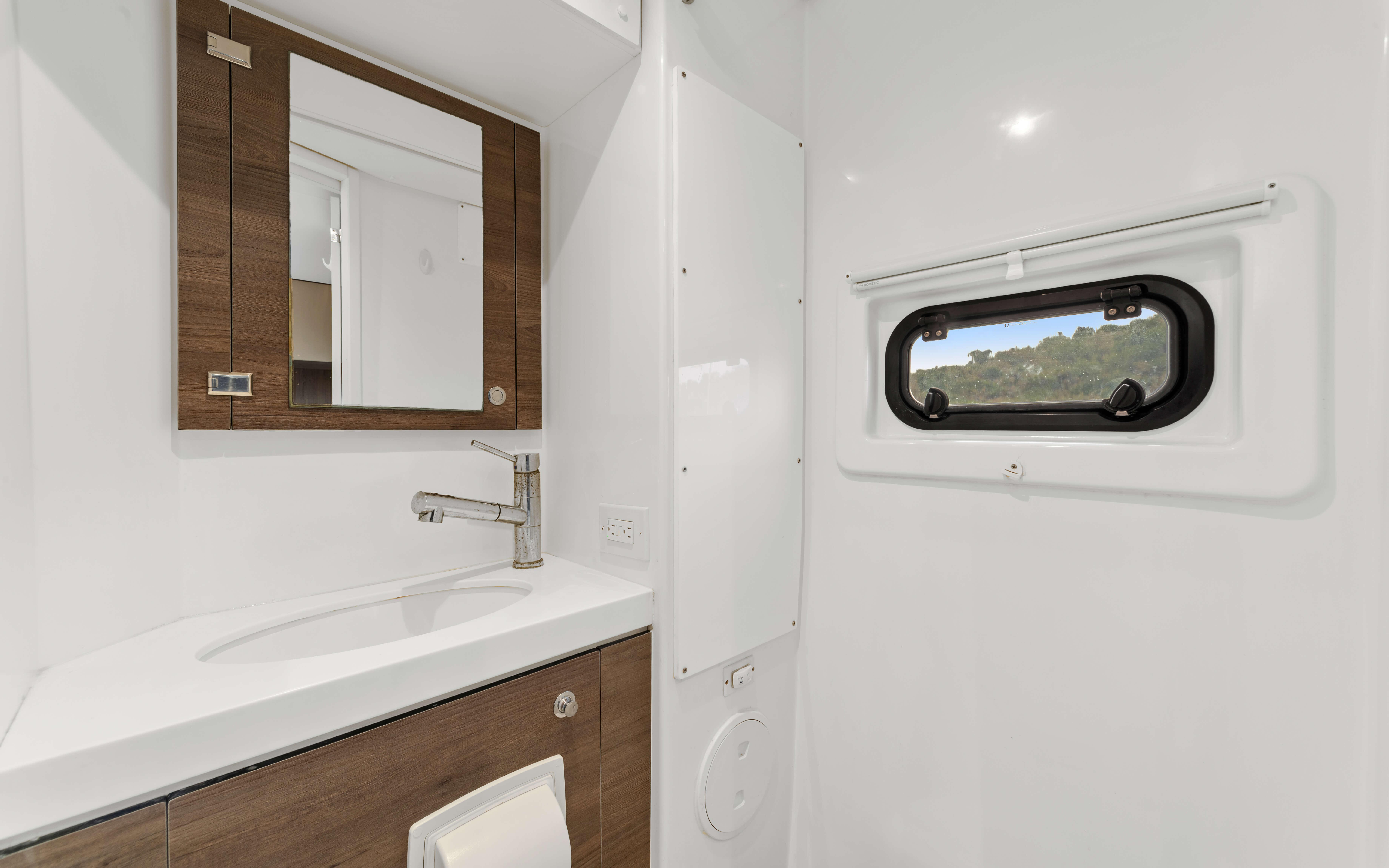 Plexiglass blackout pleated blinds, porthole and aft cabin access bay floats