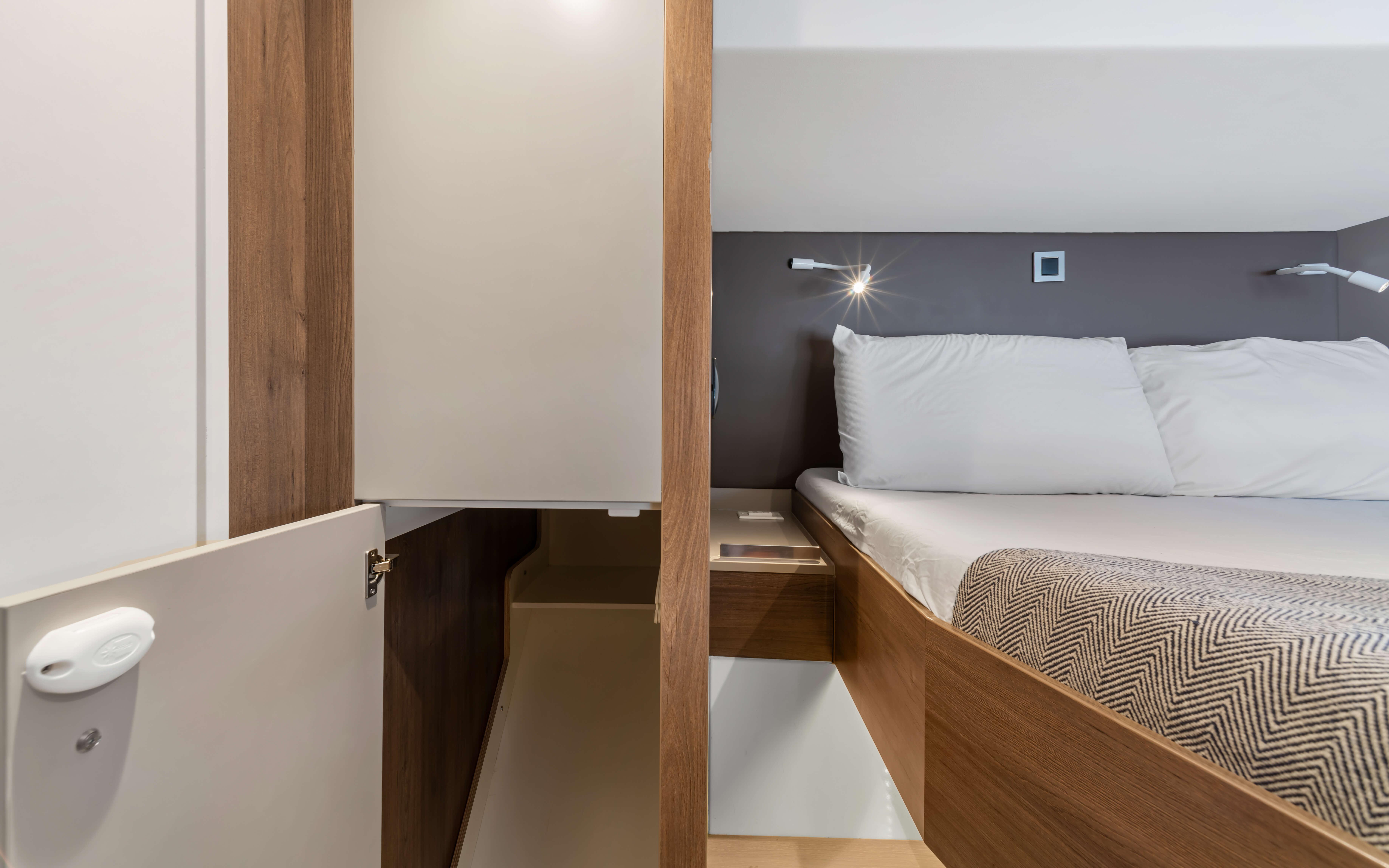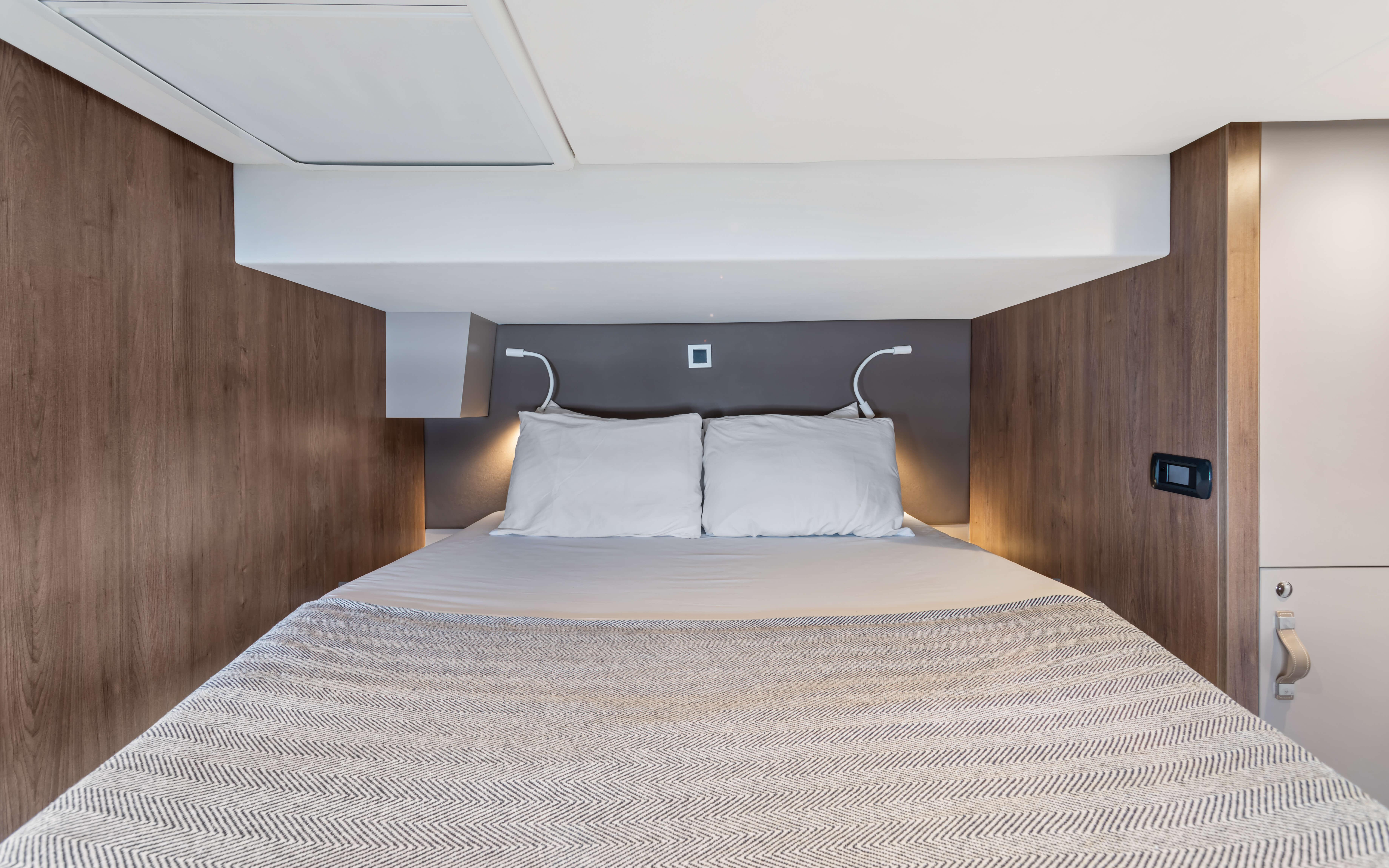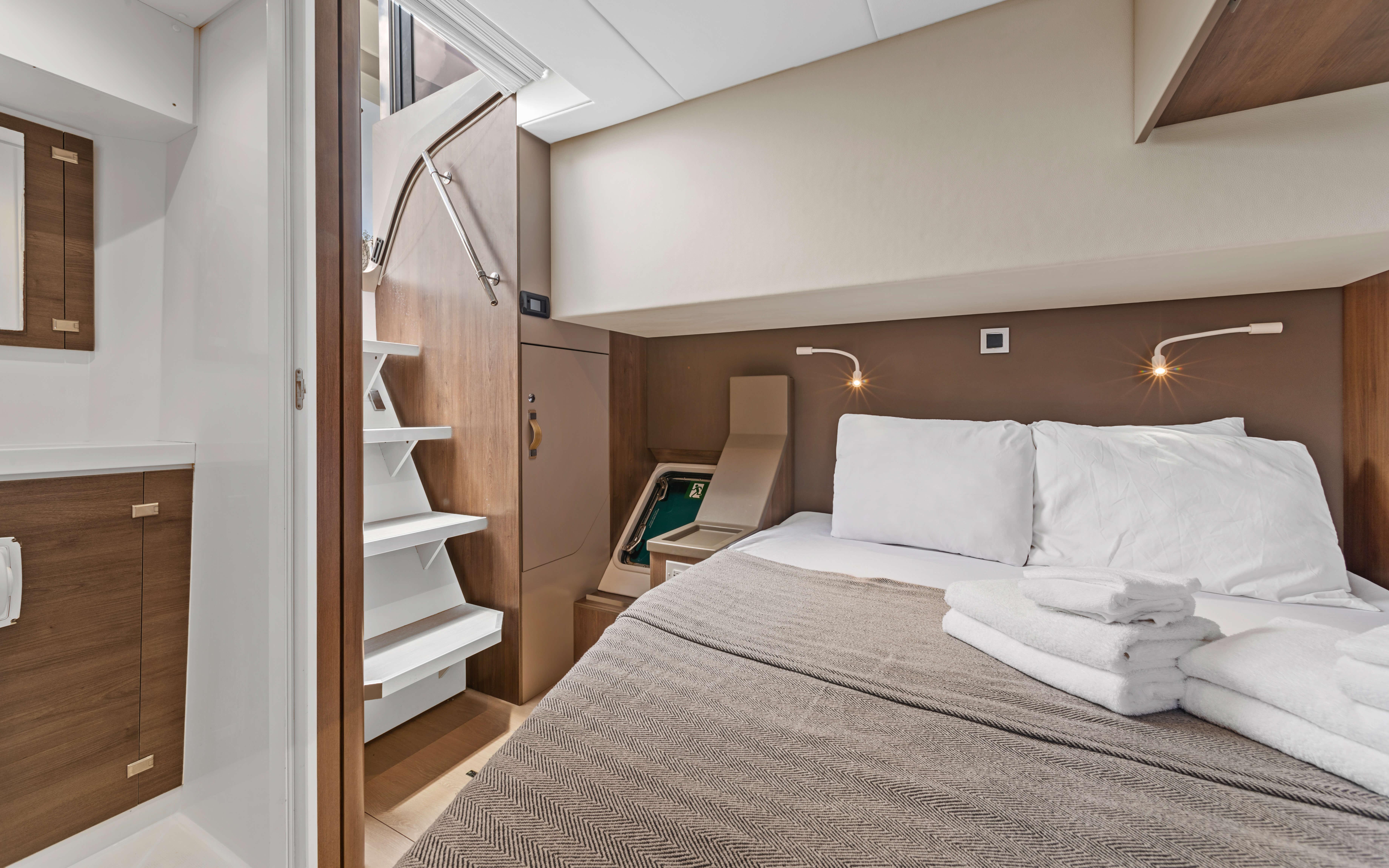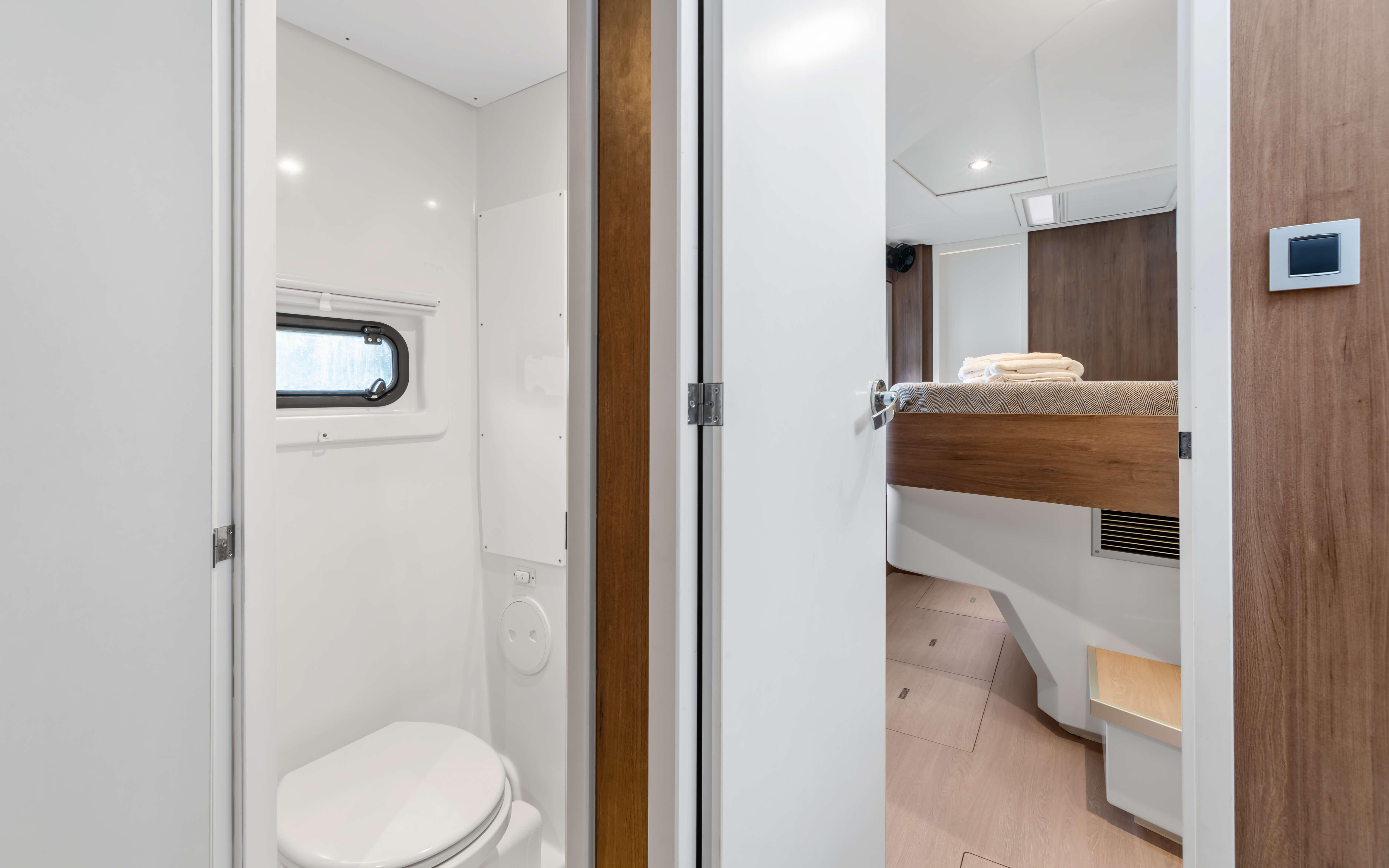 She features a rare six-cabin, six-ensuite layout, offering outstanding space, comfort, and flexibility, perfect for accommodating large families, groups of friends, or guests on extended voyages. Expansive living areas flow seamlessly from interior to exterior, with panoramic sliding windows, a garage-style aft door, and direct walk-through access to the forward cockpit lounge with dining and sunbeds.