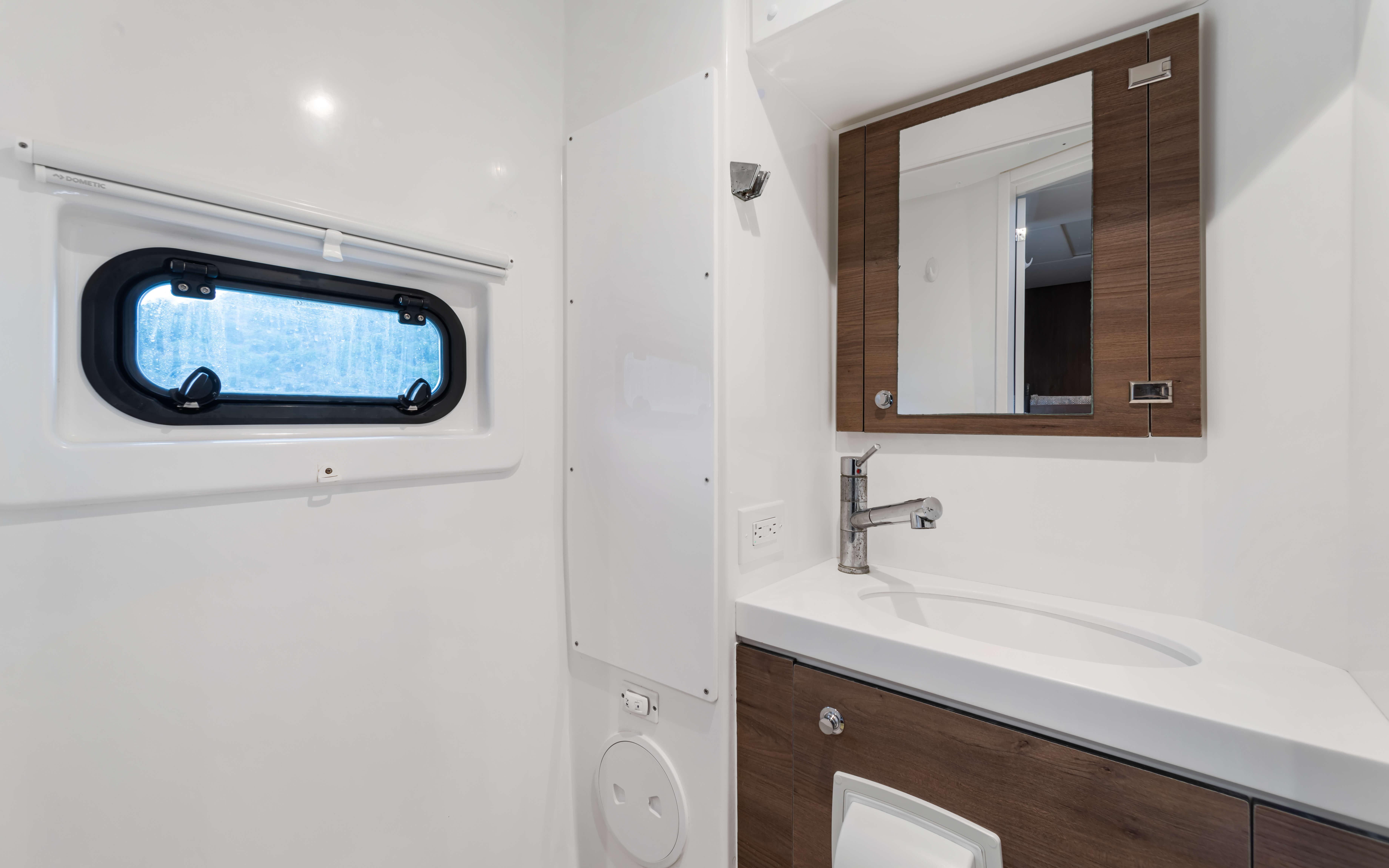 The open-concept interior includes a full-size galley with a 615-liter fridge and freezer, water and ice dispenser, and a generous salon dining space that seats twelve. A finished forepeak adds a captains cabin with an additional head, while the flybridge offers panoramic sea views in a tranquil setting.