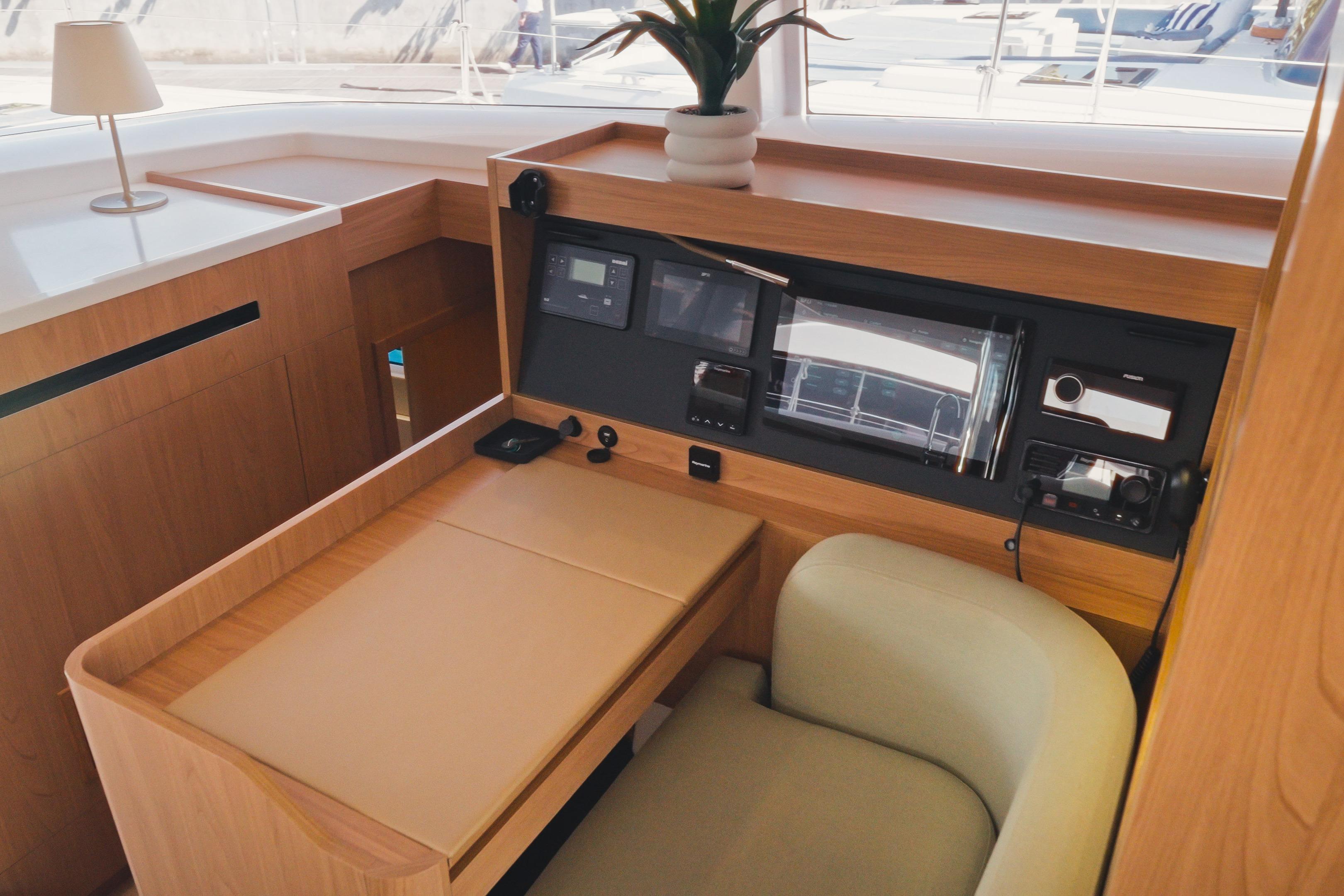 chart table + combined VHF RAY MIC at the helm station, AIS transceiver, AXIOM 12″ plotter screen at the helm station