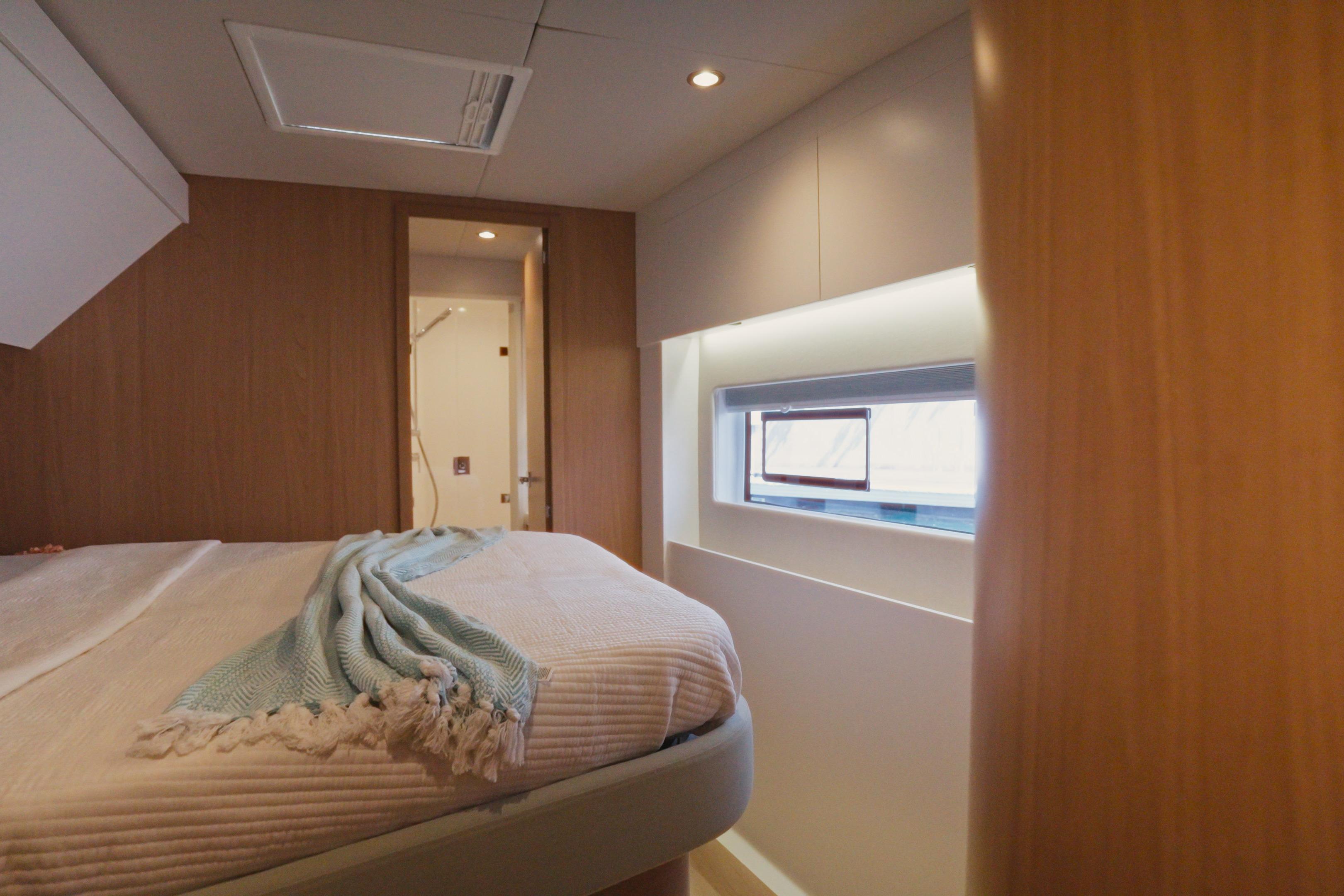 Blackout pleated blinds for hull windows and a glass door for aft cabin hull access