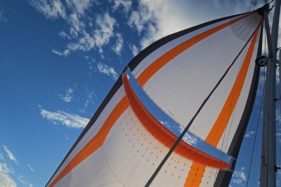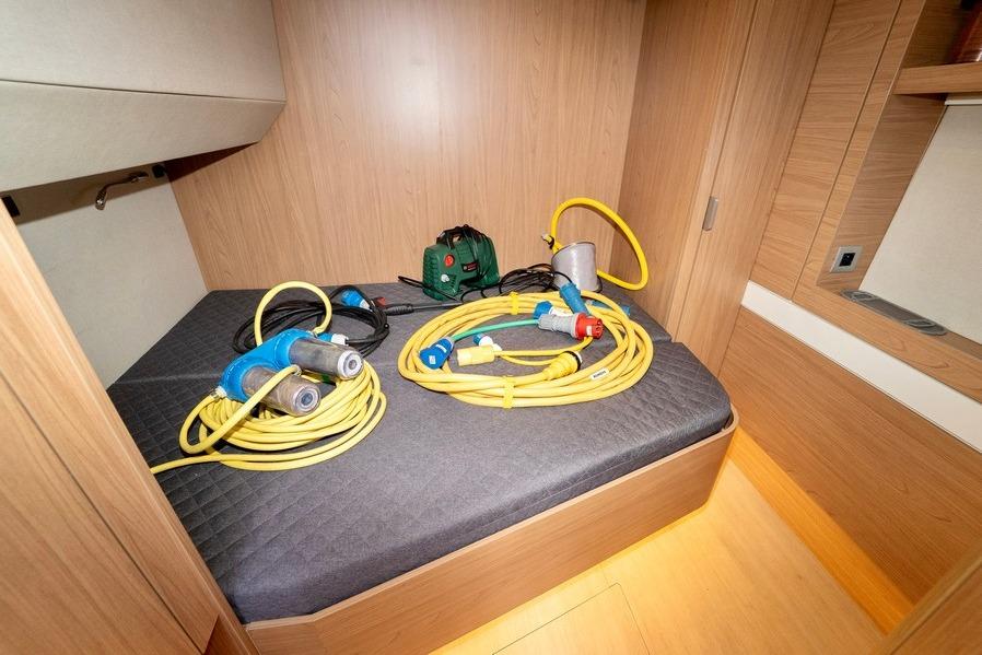 The owners have set the boat up really nicely for sailing. She features a large sail area with a square-top mainsail and furling solent, complemented by an excellent downwind sail package: a Code 0 on furler and a 222 m² Parasailor with easy snuffer system.