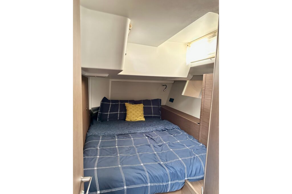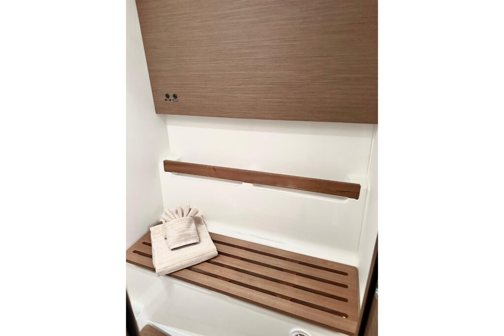 The interior is designed to maximize space and offer a bright and airy feel while maintaining separation of different living spaces. The boat has 3 separate hull side windows plus additional ports for light. And her Alpi woodwork adds a luxurious touch to her accommodations