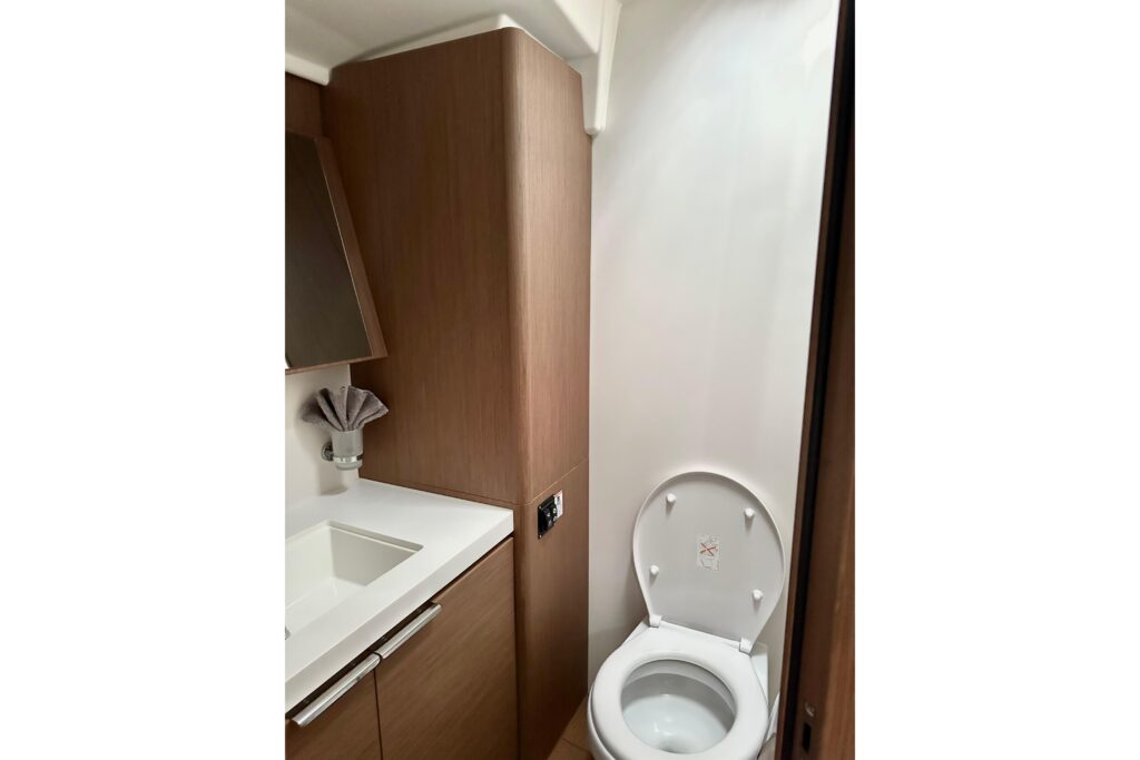 Forward is the Master Cabin, with a queen size island berth, twin hanging lockers allowing for storage space, and a separate shower room to port. To starboard is the separate head compartment, with an electric quiet flush toilet with the ability to use sea or fresh water.