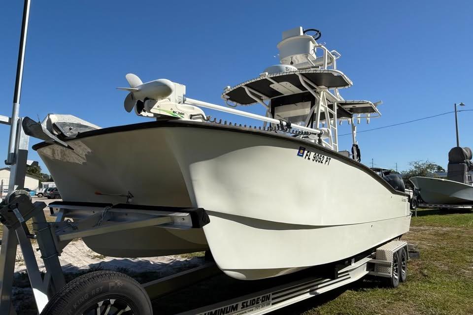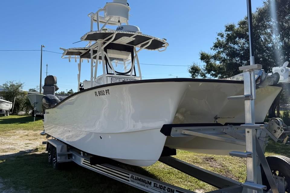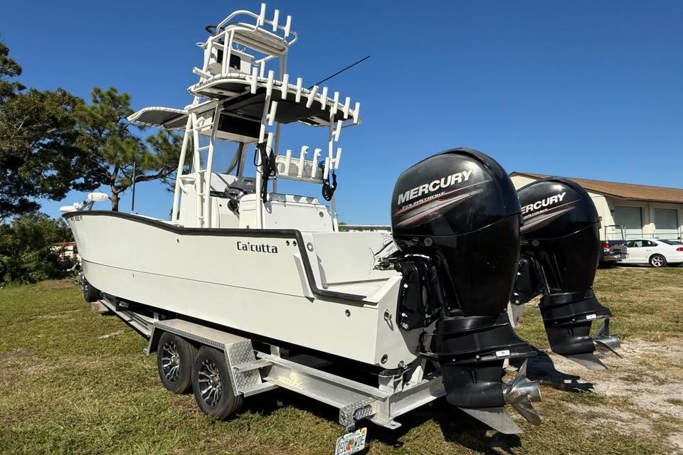This 2015 Calcutta 263 is a serious offshore performer that blends fishability, efficiency, and versatility. Powered by twin 2018 Mercury 150s with electronic controls and just over 500 hours each, this cat is turnkey and fully equipped with everything you need for serious fishing or family cruising.Kept in excellent condition with constant upgrades, including new MarineMat throughout, full Simrad electronics suite, lithium batteries, and a Rhodan trolling motor. A 2016 Rolls Axle aluminum tandem trailer is included.