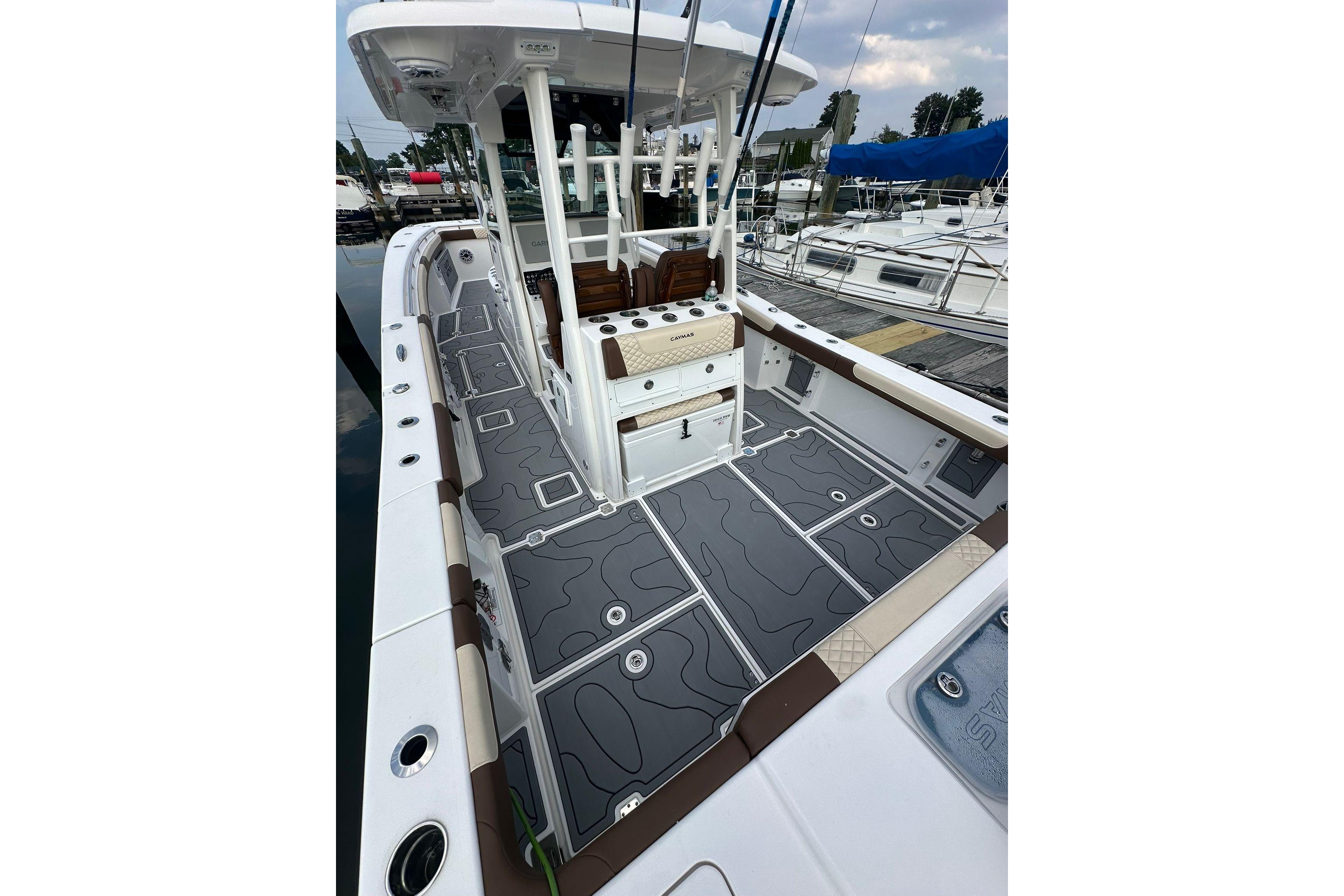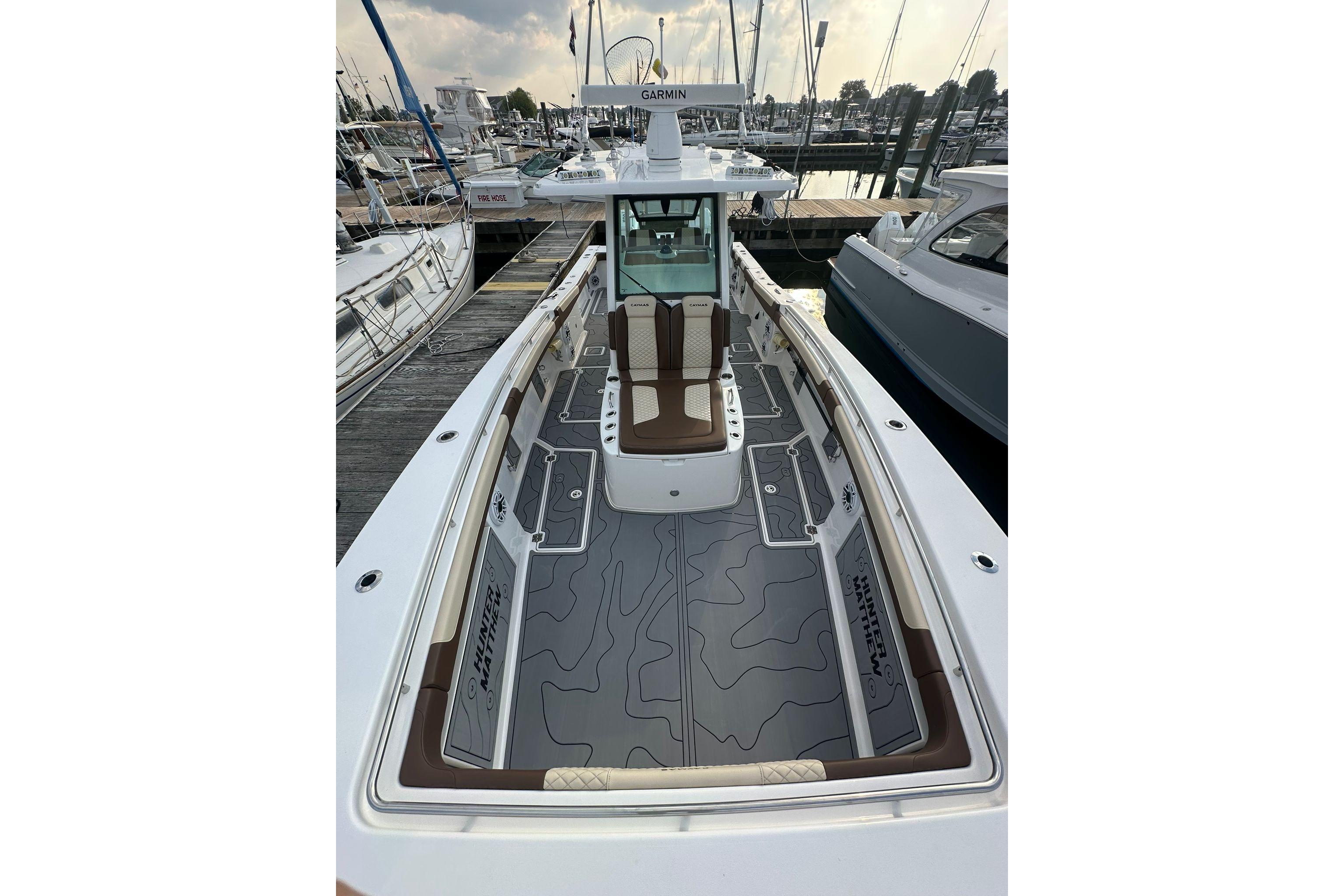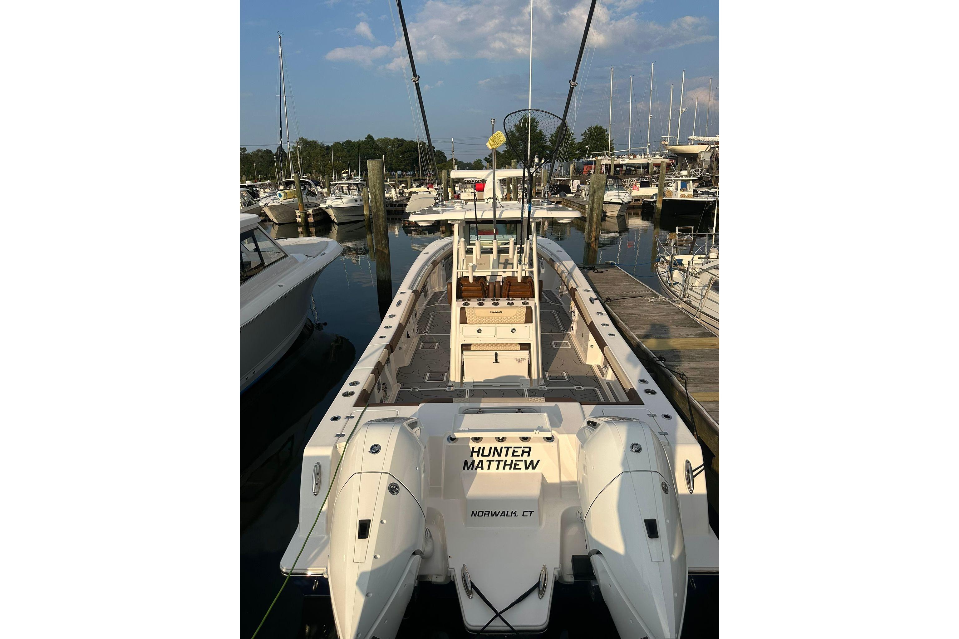 All additional info: Double-stepped, semi-asymmetric cat hull · Beam 10 ft 10 in · Dual 218 gal fuel tanks (436 gal total) · Six insulated plumbed boxes (≈3,000 qt) w/ macerators: 2 fwd · 2 mid-ship · 2 cockpit · Standard 70 gal transom livewell · Options for (2) 25 gal livewells + plumbing aft boxes for total of up to 5 bait tanks · Hooker sea chest w/ Hooker electric pumps · Chaise lounge forward · Fold-down bow seating flush in gunnels · Marine head w/ holding tank · Seakeeper Ride · Wind & spray curtains · Full-boat canvas · Life raft & EPIRB · Bottom paint