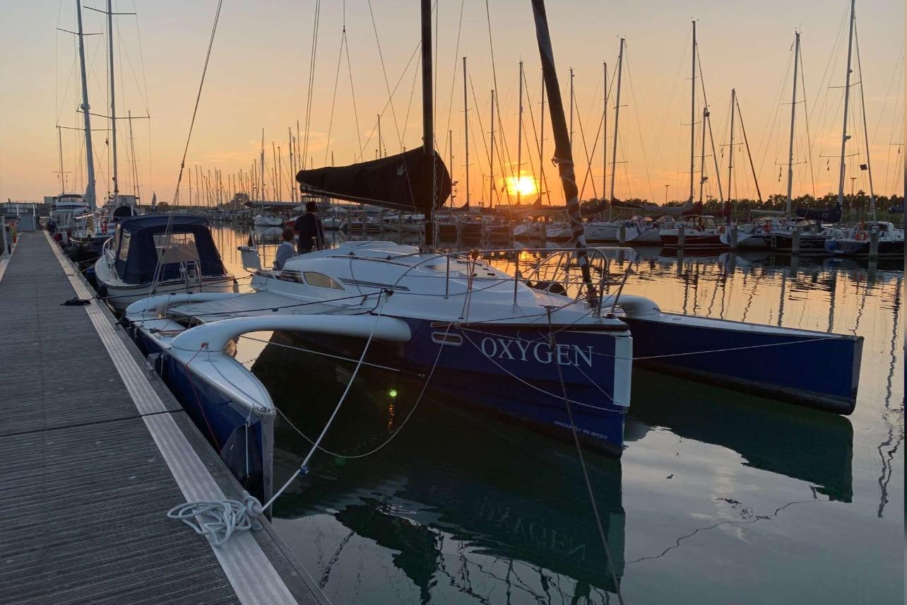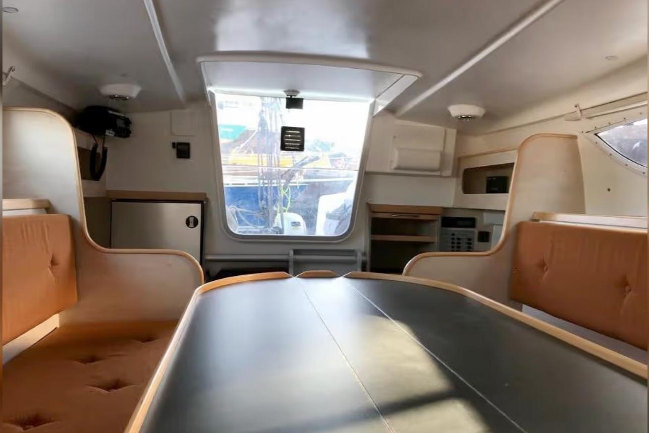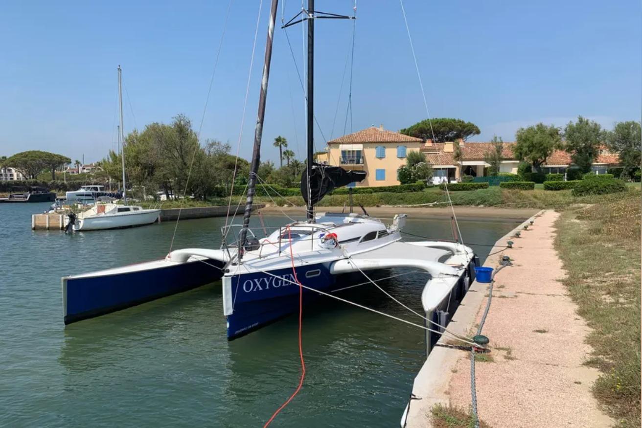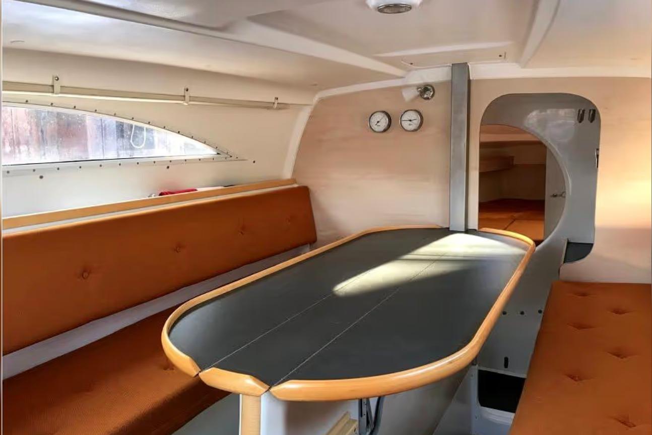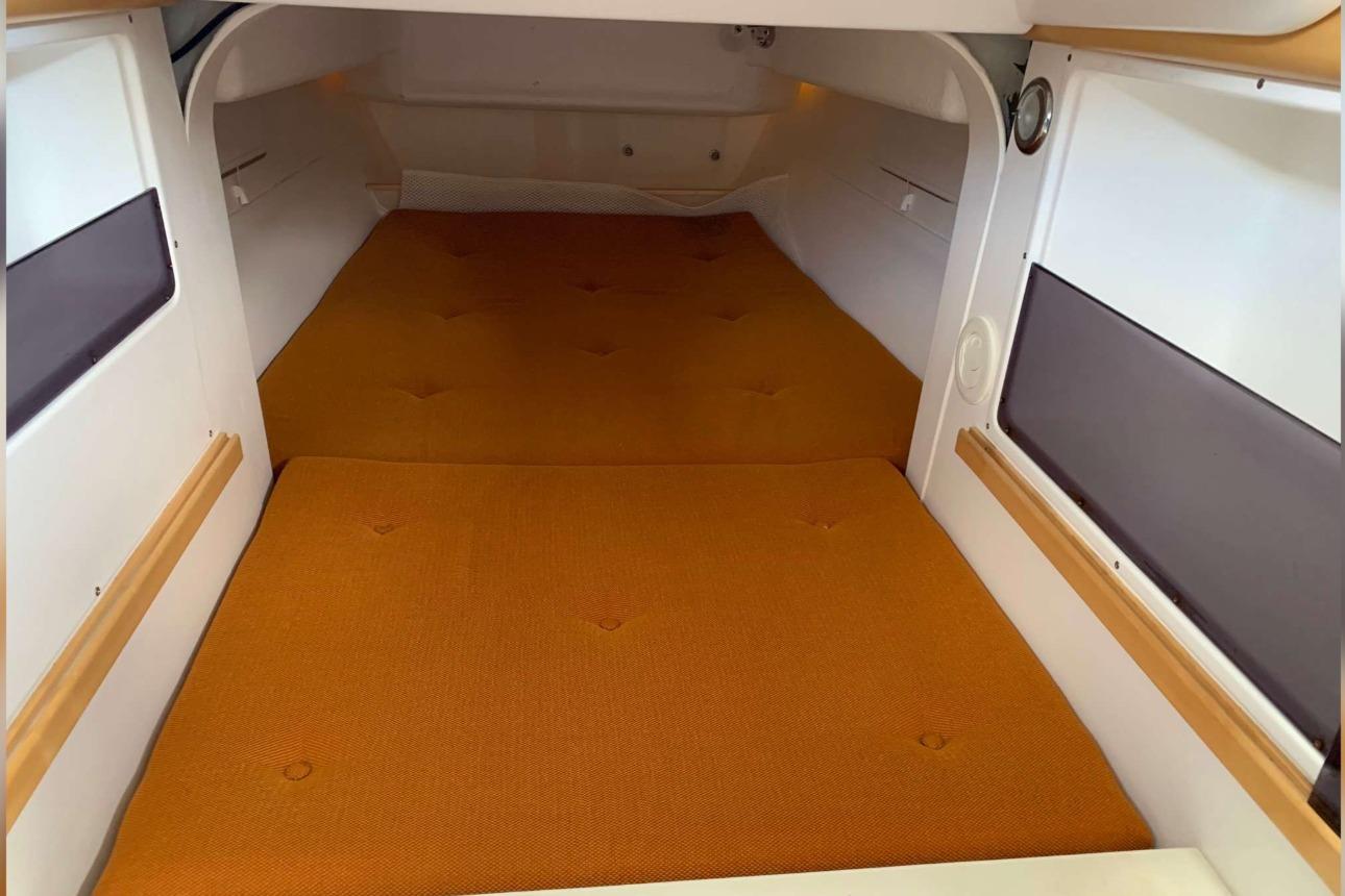 1 cabine double à l’avant, 1 cabine d’appoint à l’arrière. Code 0 de 2021, Grand-voile + génois de 2016. Trampolines de 2021. Remorque de route Khuz. Tridata Raymarine (3 ST60, loch/ sondeur/ girouette anémomètre), autopilot Raymarine ST6002 et GPS Raymarine C90W.
