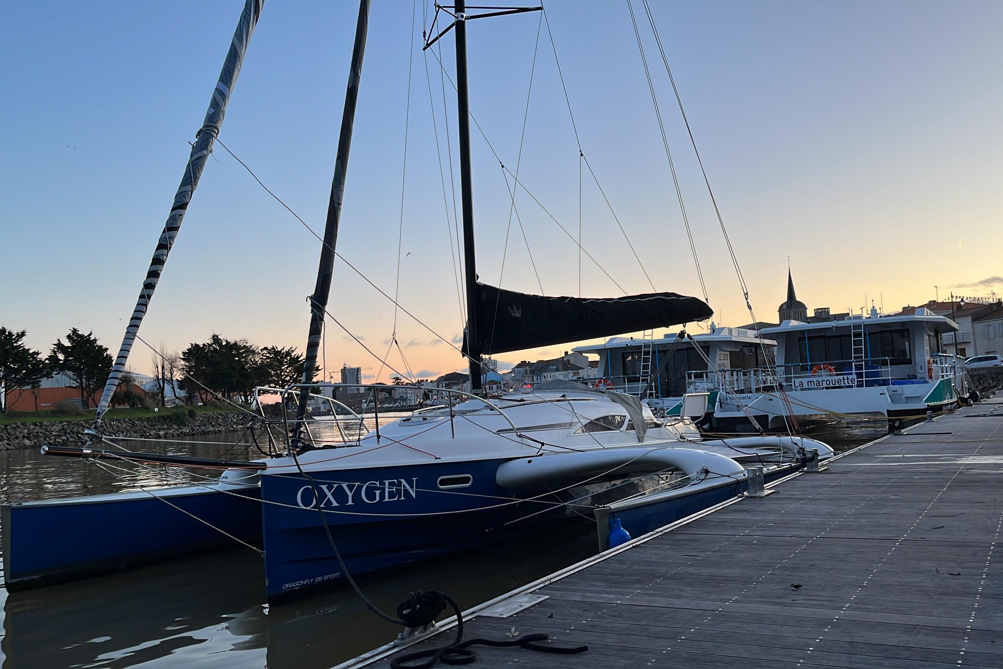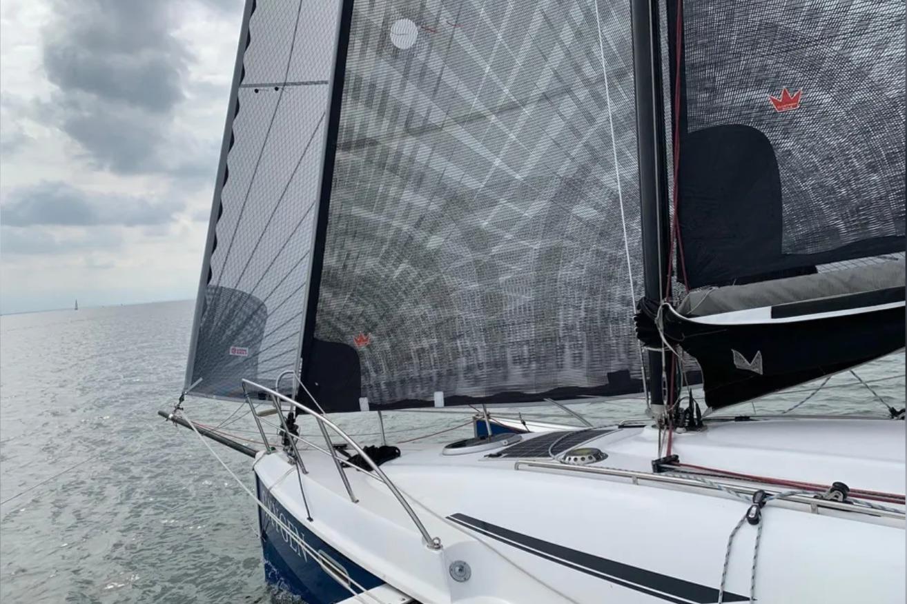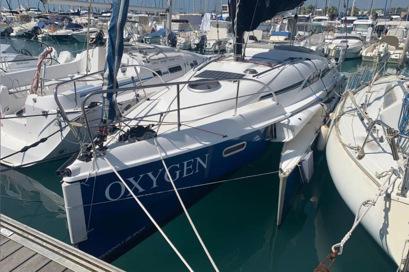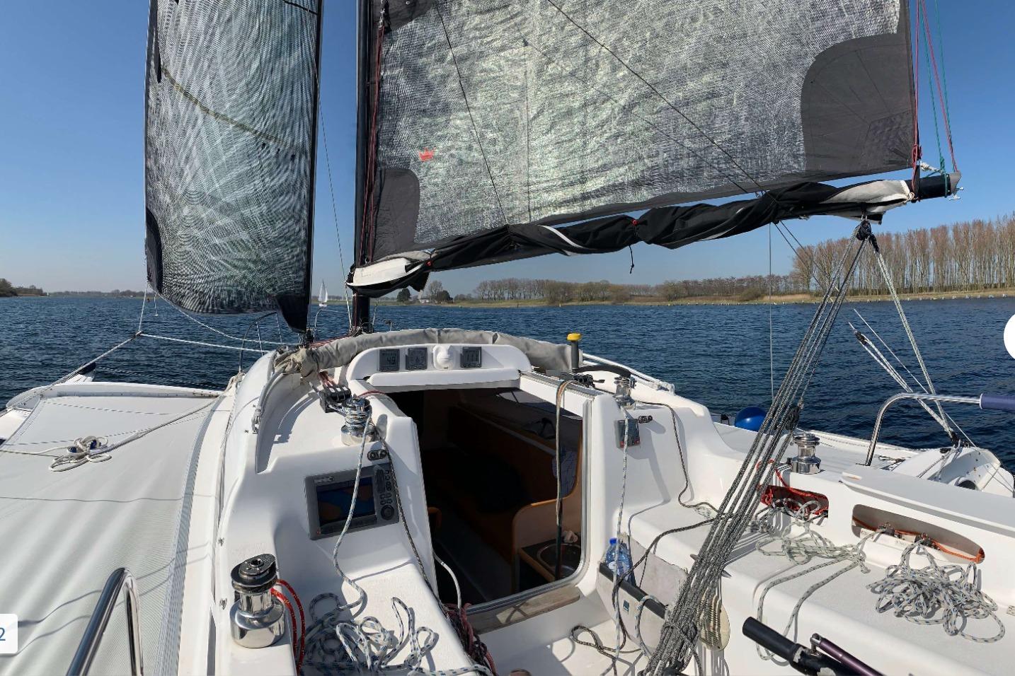 1 cabine double à l’avant, 1 cabine d’appoint à l’arrière. Code 0 de 2021, Grand-voile + génois de 2016. Trampolines de 2021. Remorque de route Khuz. Tridata Raymarine (3 ST60, loch/ sondeur/ girouette anémomètre), autopilot Raymarine ST6002 et GPS Raymarine C90W.