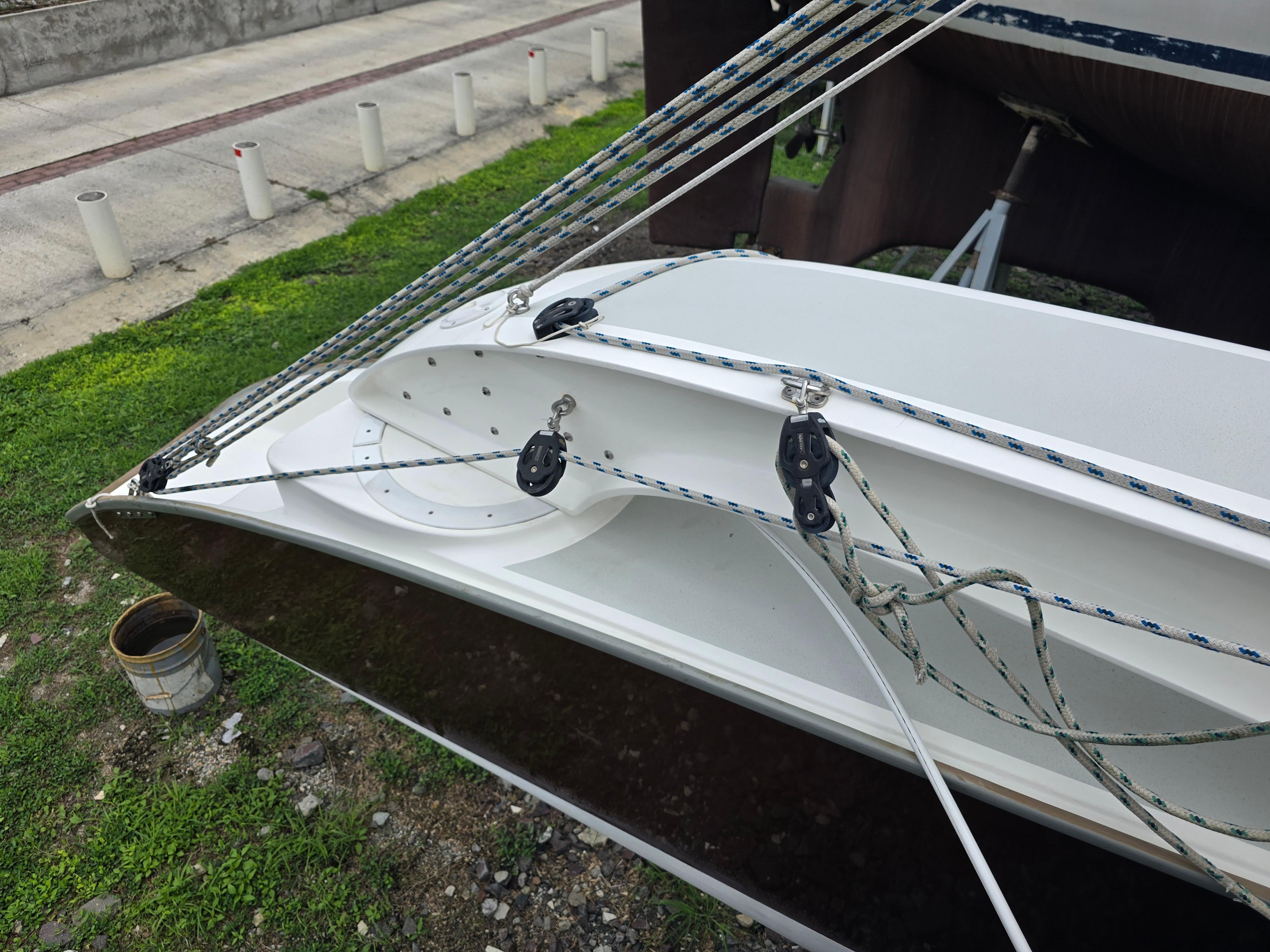 Spinnaker gear with blocks, sheets, cleats, and fastening points