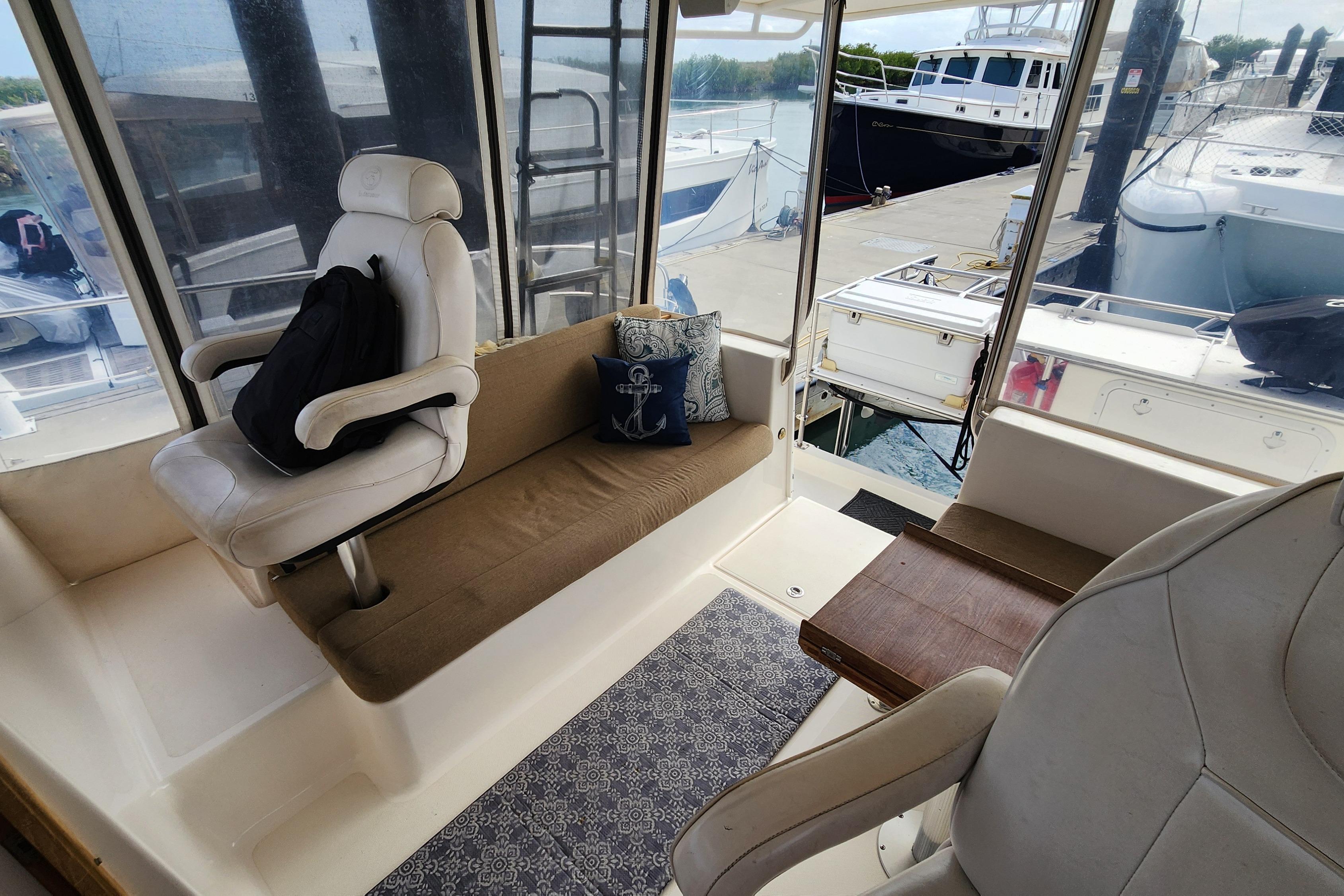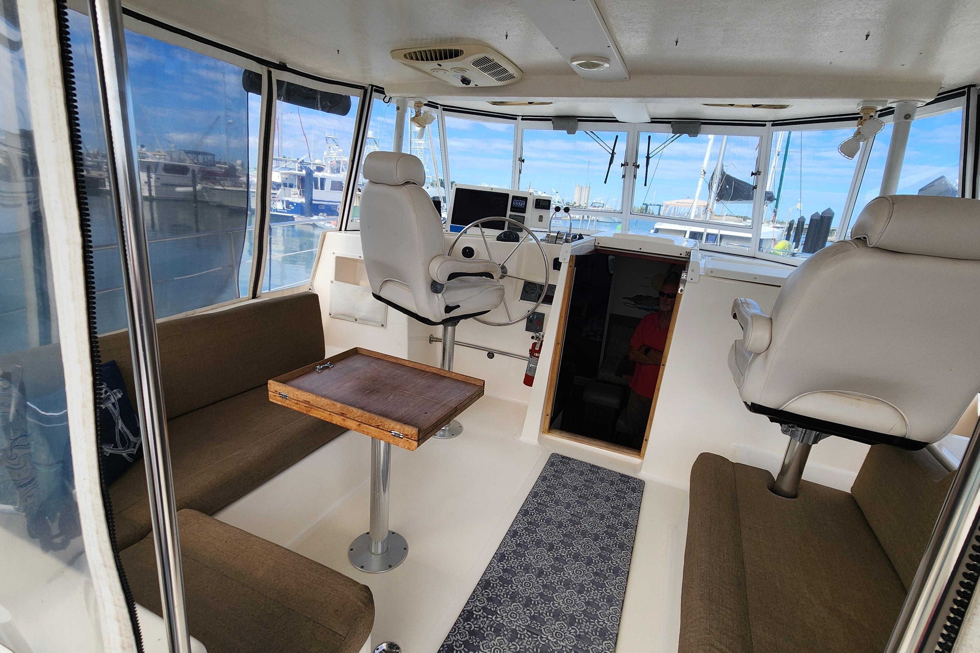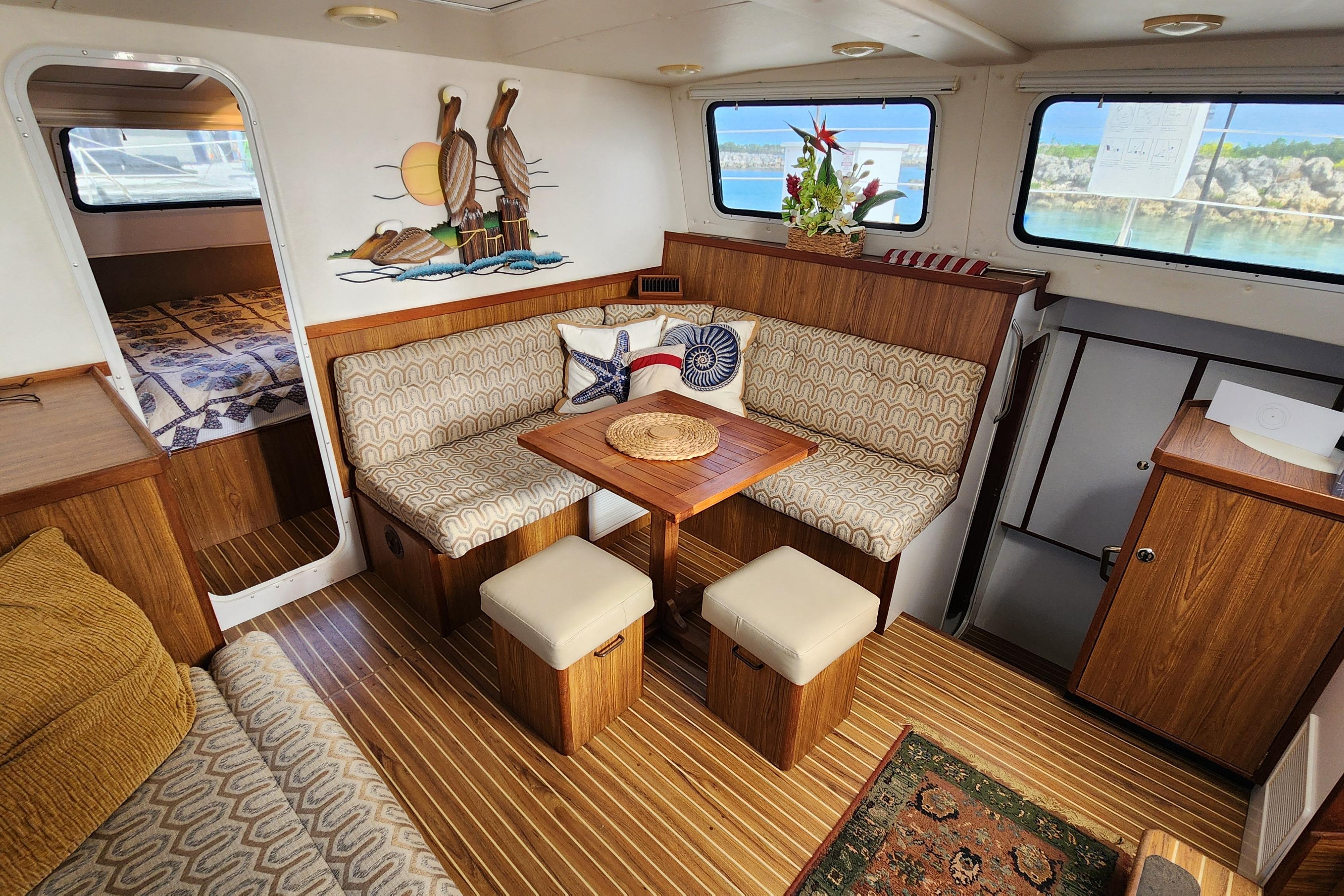 Plenty of room, Easy to maneuver, Great for Entertaining, Lots of Storage and outside walk around area for handling lines. The spacious enclosed helm gives you a 360 degree view. She handles well in the Locks on the Loop. She can also Get up and Go when needed or desired.