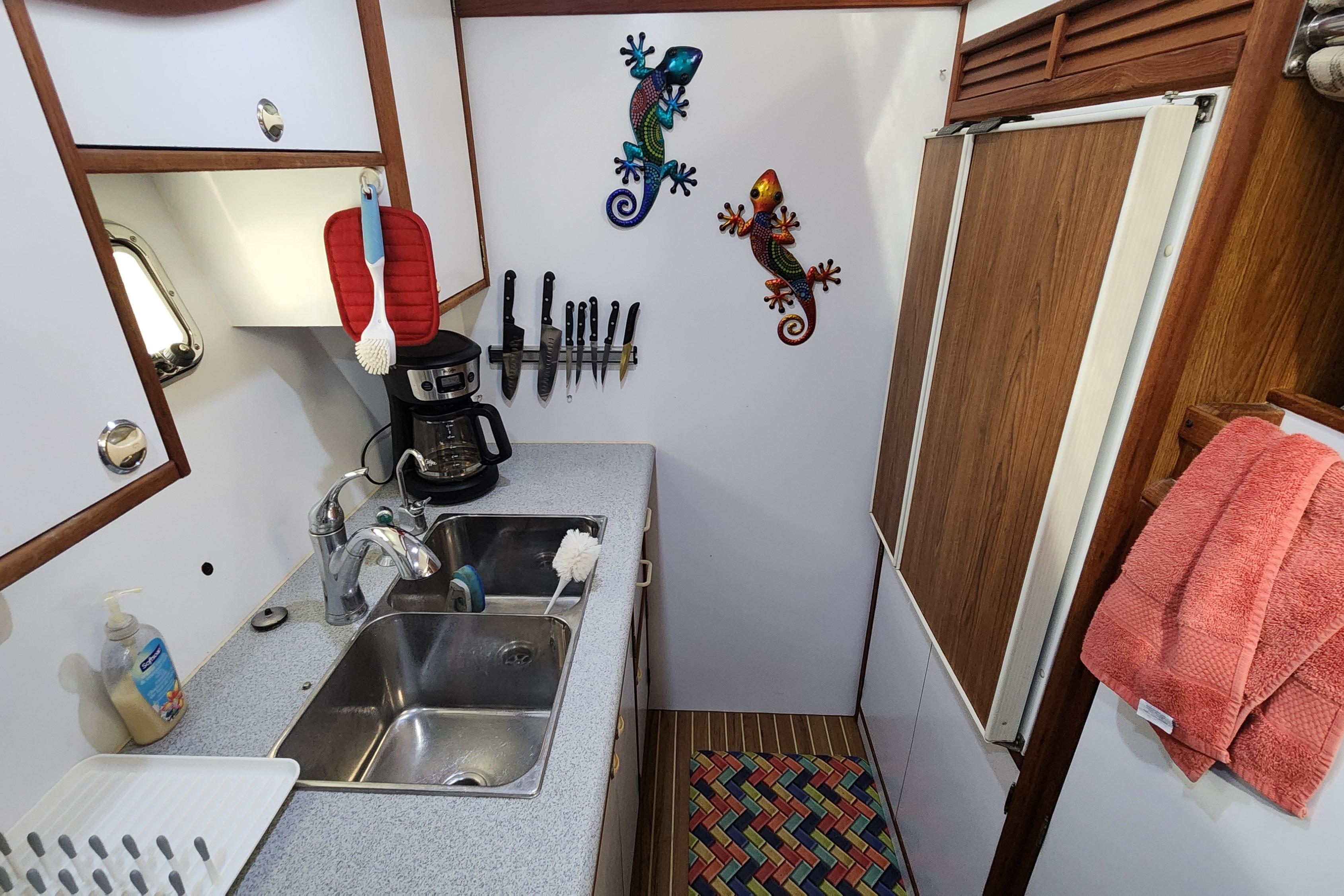 The Galley is wide with lots of light and view of the Salon so you don’t feel separated. It also has plenty of room for provisions. The additional Freezer and Ice Maker are great for Cruising. She also has a Washer/Dryer combo.