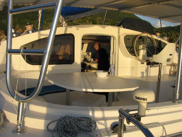 Between the hulls there is a spacious outdoor cockpit area covered by a large custom bimini. Inside, the roomy salon and galley are bright and airy with wrap-around windows and two forward opening hatches. The circular dinette to port seats up to eight and is joined to the starboard galley with a service bar within easy reach for meals and entertaining.
