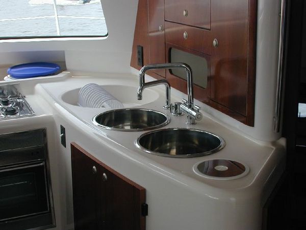 The excellent galley comes with a three-burner LPG stove and oven, microwave, blender, toaster, refrigerator/freezer (Sea Frost three holding plate system), double stainless steel sinks, pressurized freshwater and seawater faucets, pots, pans, dishes, cutlery, wine glasses, and plenty of storage and counter space.