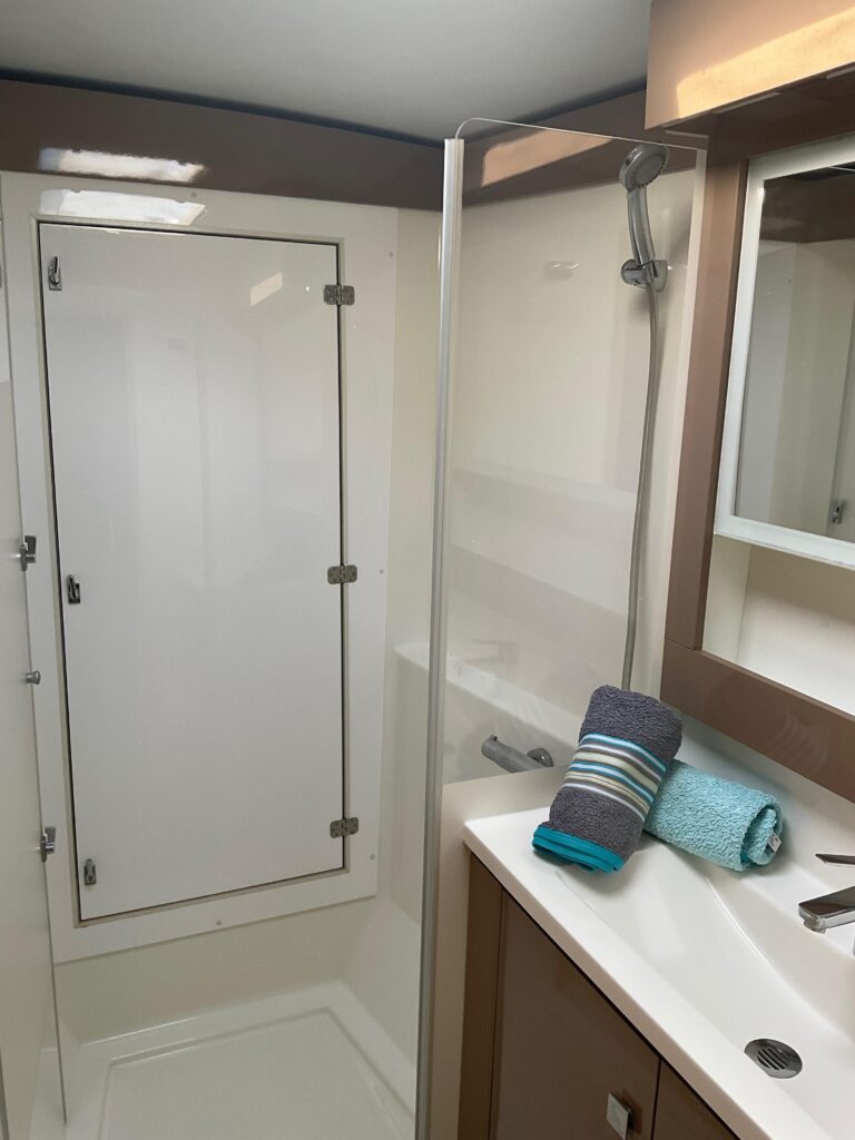 Starboard hull accommodates an office desk, master cabin and large master head. A Bosch Washer is located forward.