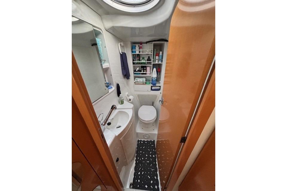 WC électrique fonctionnant sur circuit d'eau douce ou séparément avec pompe 12v sur circuit eau de mer, lavabo, rangements