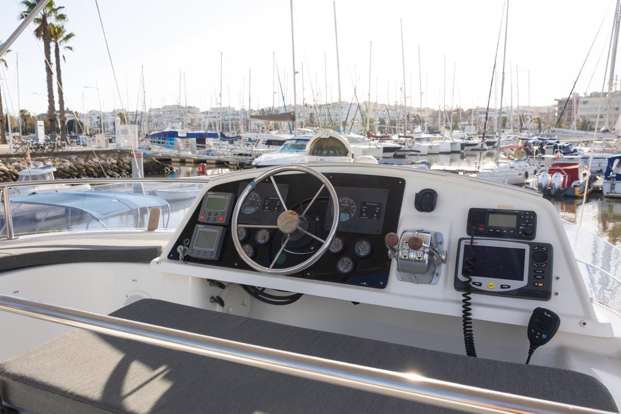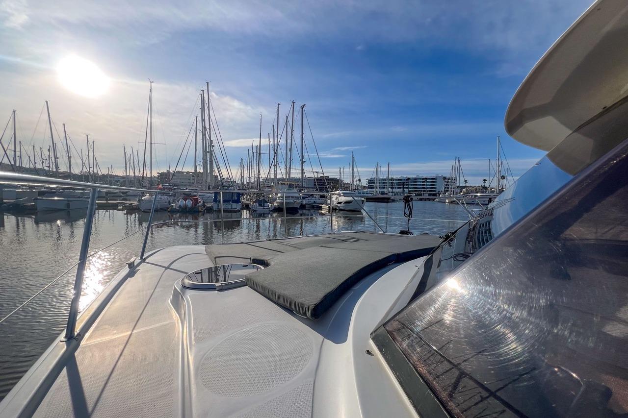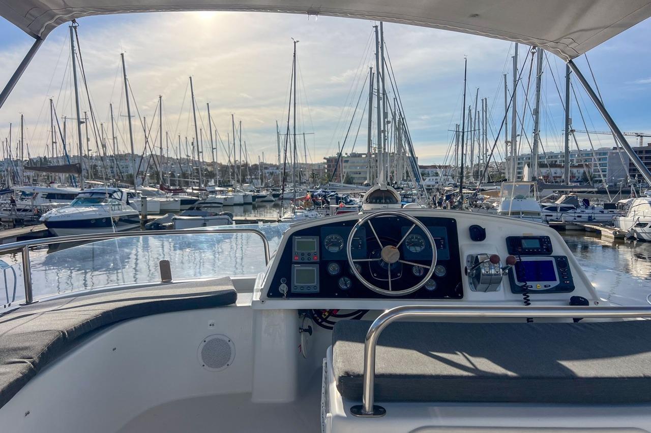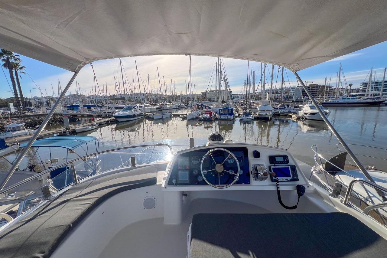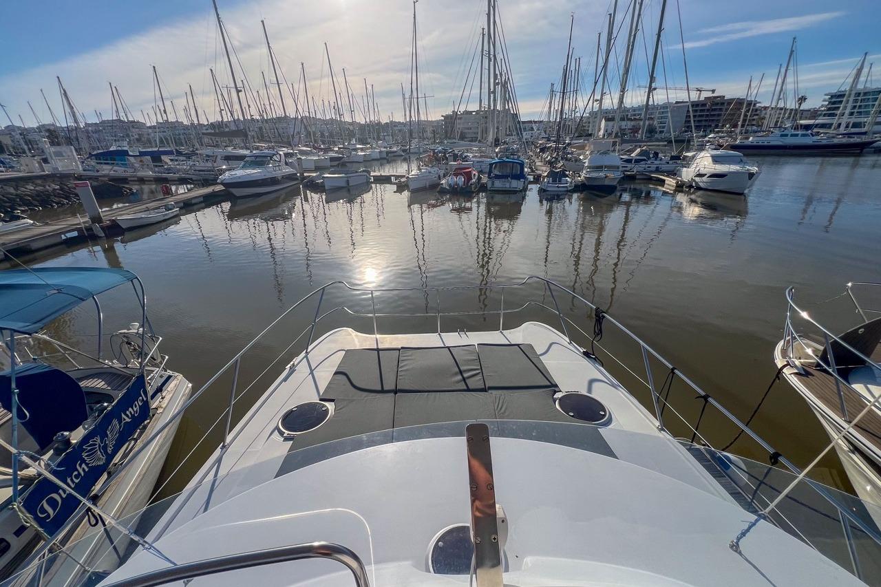 The exterior is designed for enjoyment at sea, featuring a spacious cockpit, flybridge seating, and aft sunshade, perfect for al fresco dining or relaxing on deck. Inside, upgraded cushions, modern lighting, and new fabrics create a welcoming environment, while key equipment such as autopilot, marine audio system, and Raymarine navigation ensures confidence on every journey.