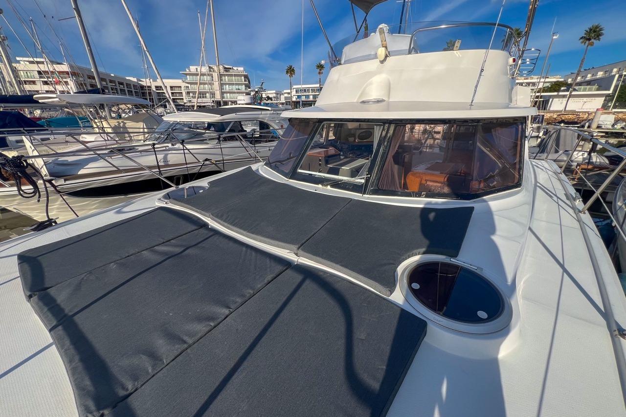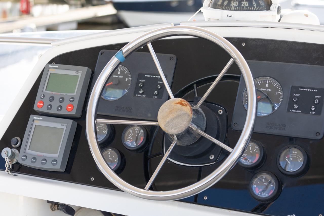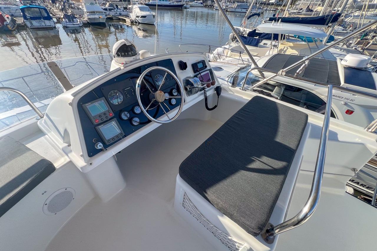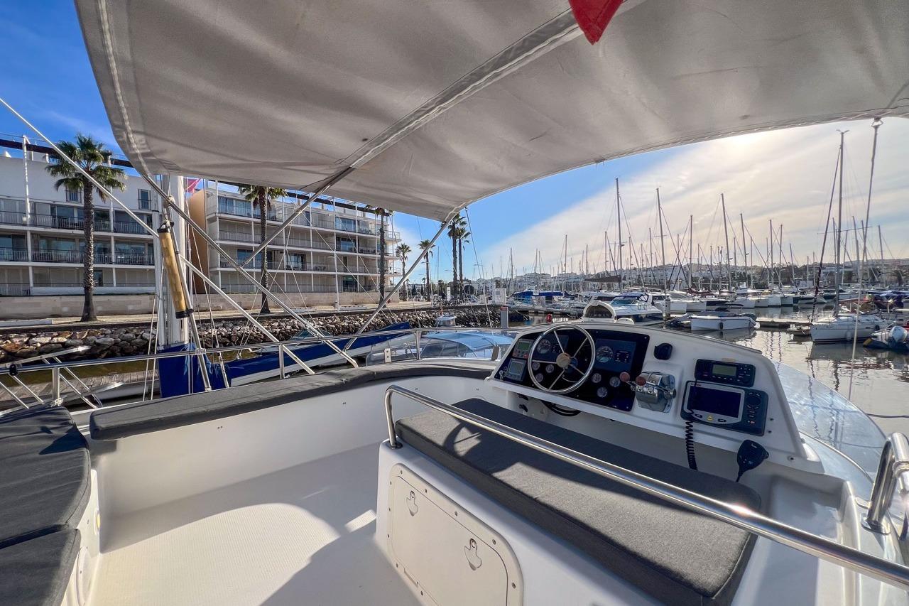 The exterior is designed for enjoyment at sea, featuring a spacious cockpit, flybridge seating, and aft sunshade, perfect for al fresco dining or relaxing on deck. Inside, upgraded cushions, modern lighting, and new fabrics create a welcoming environment, while key equipment such as autopilot, marine audio system, and Raymarine navigation ensures confidence on every journey.