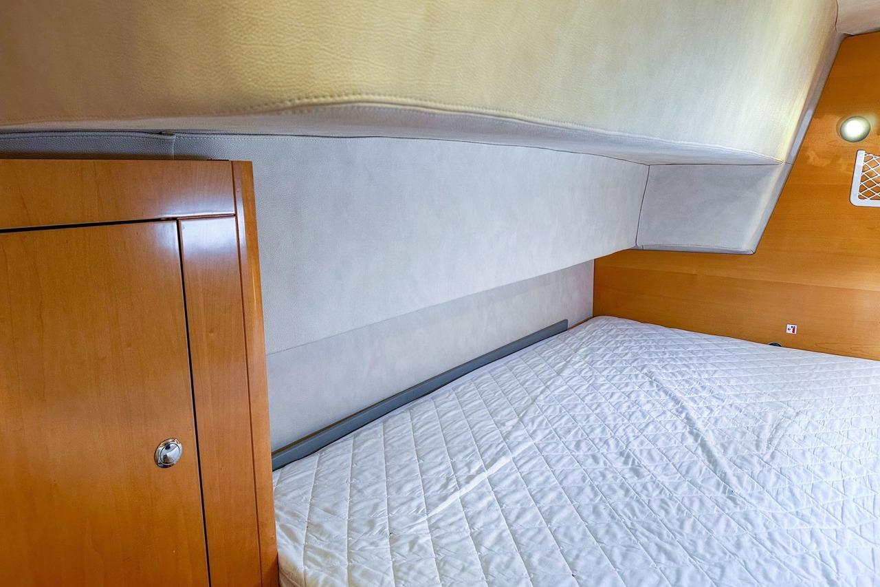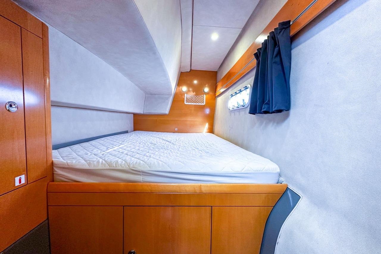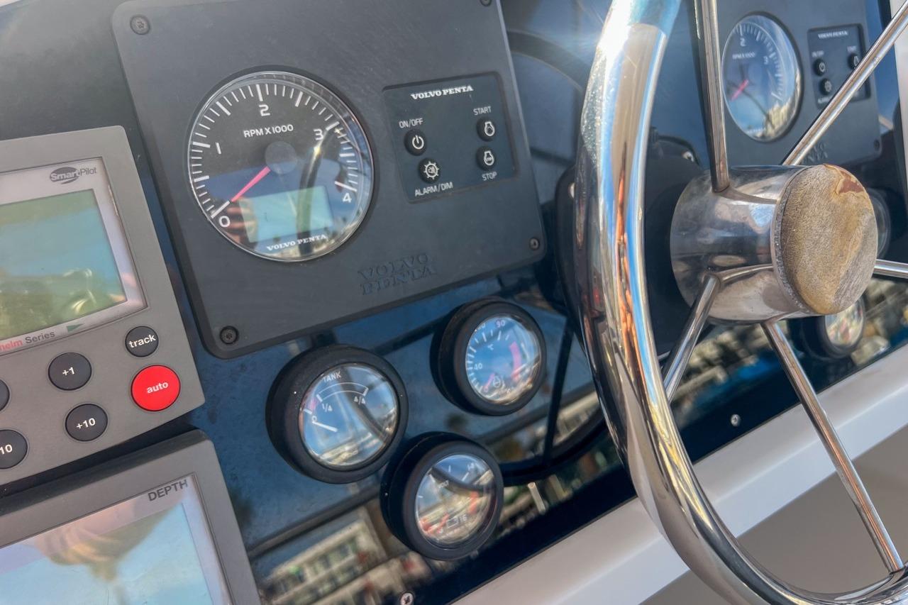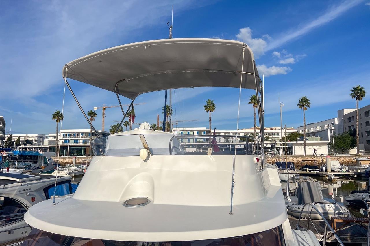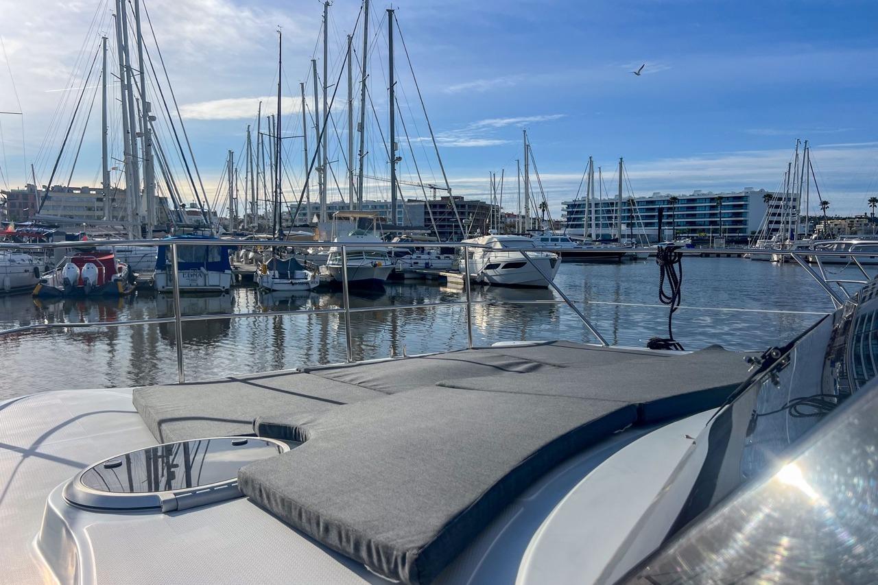 The exterior is designed for enjoyment at sea, featuring a spacious cockpit, flybridge seating, and aft sunshade, perfect for al fresco dining or relaxing on deck. Inside, upgraded cushions, modern lighting, and new fabrics create a welcoming environment, while key equipment such as autopilot, marine audio system, and Raymarine navigation ensures confidence on every journey.