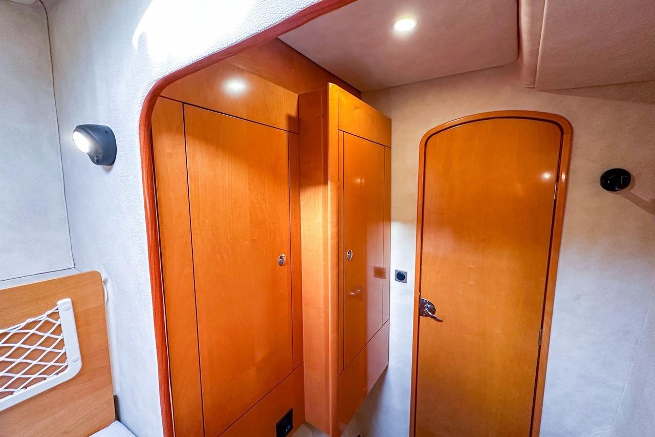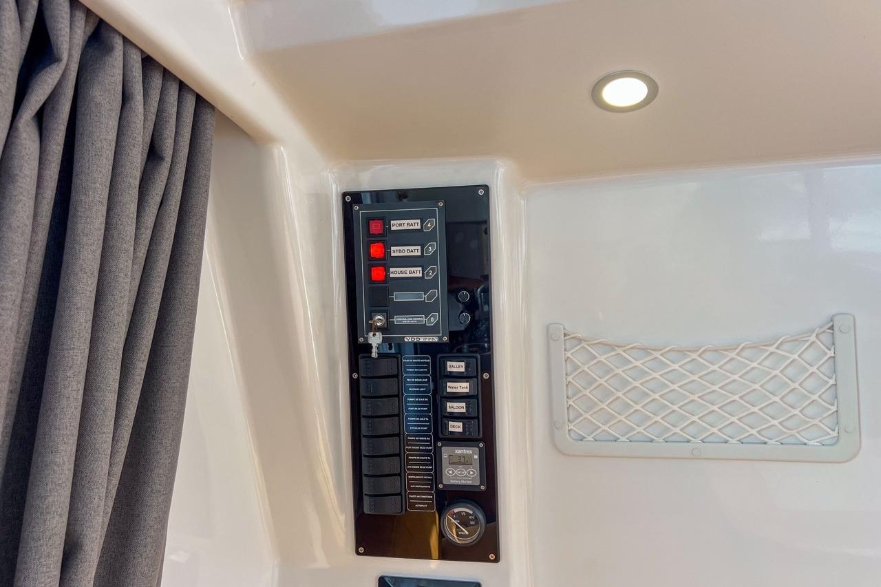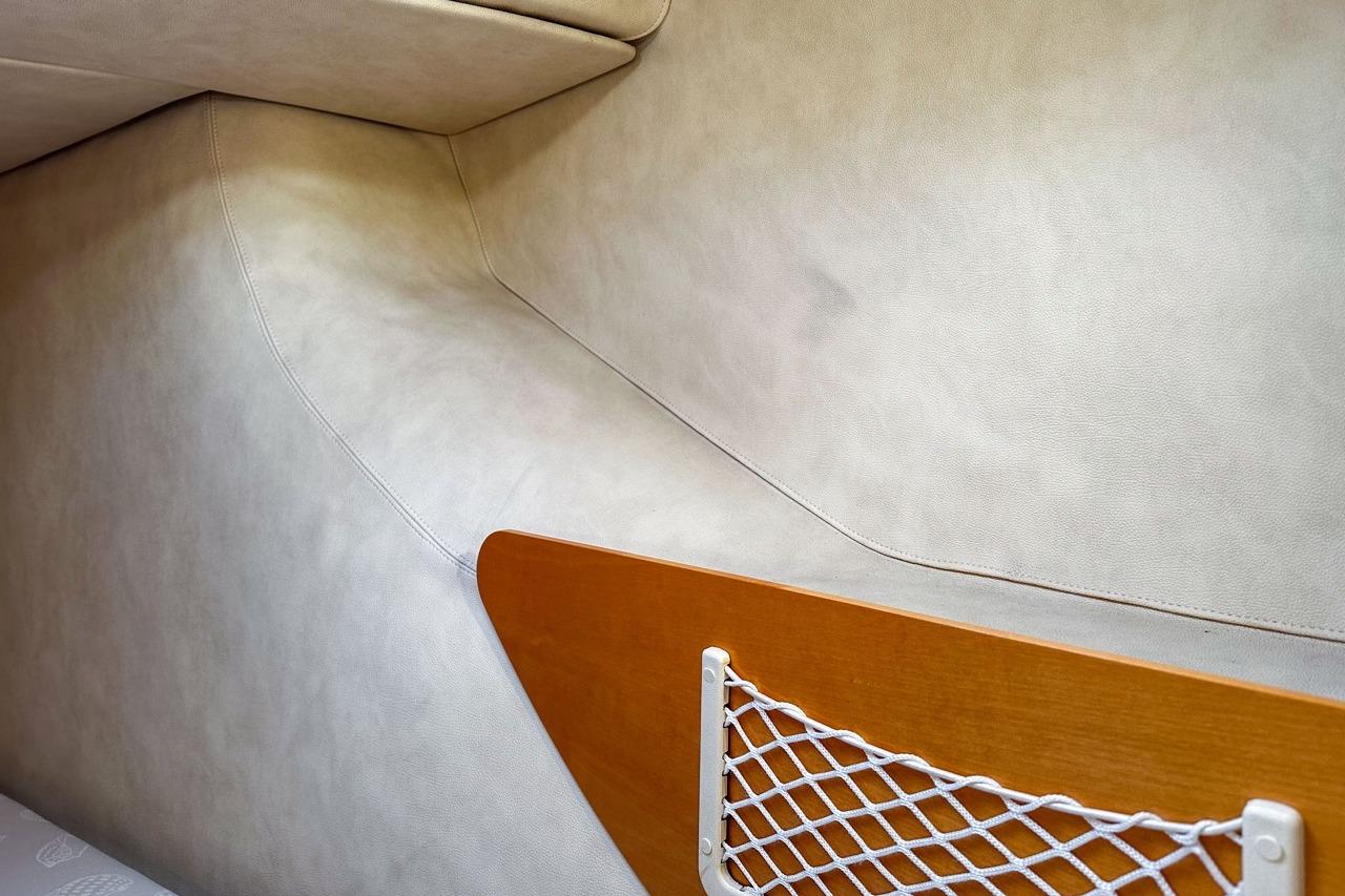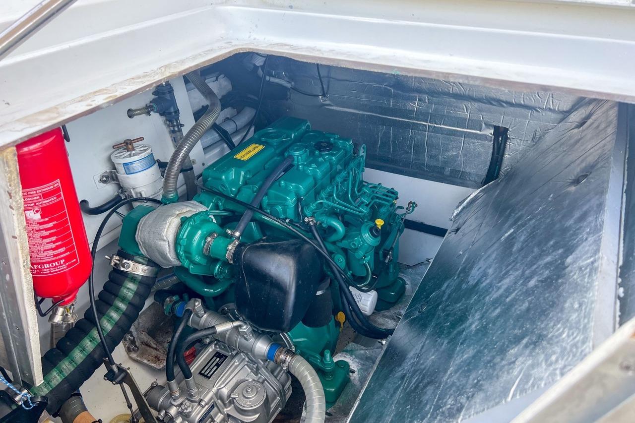 The exterior is designed for enjoyment at sea, featuring a spacious cockpit, flybridge seating, and aft sunshade, perfect for al fresco dining or relaxing on deck. Inside, upgraded cushions, modern lighting, and new fabrics create a welcoming environment, while key equipment such as autopilot, marine audio system, and Raymarine navigation ensures confidence on every journey.