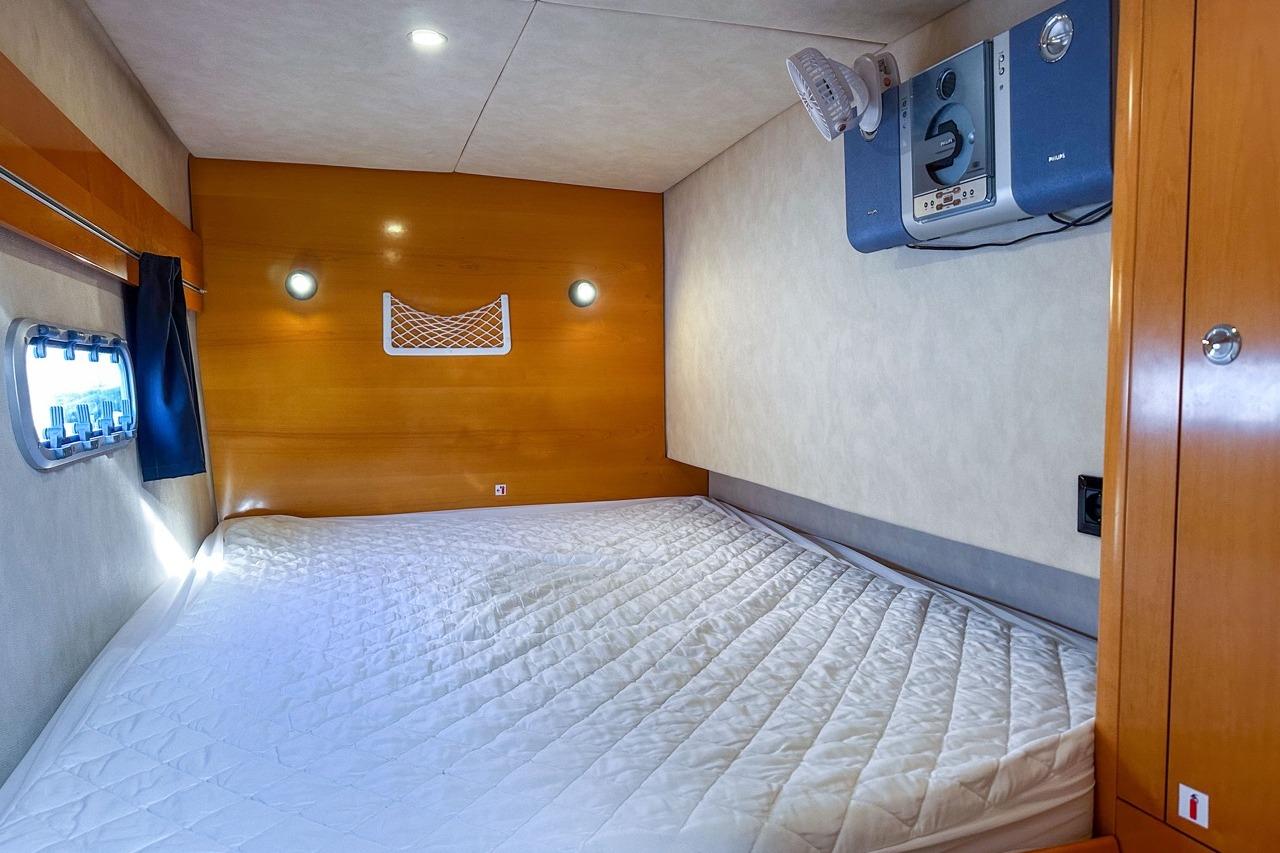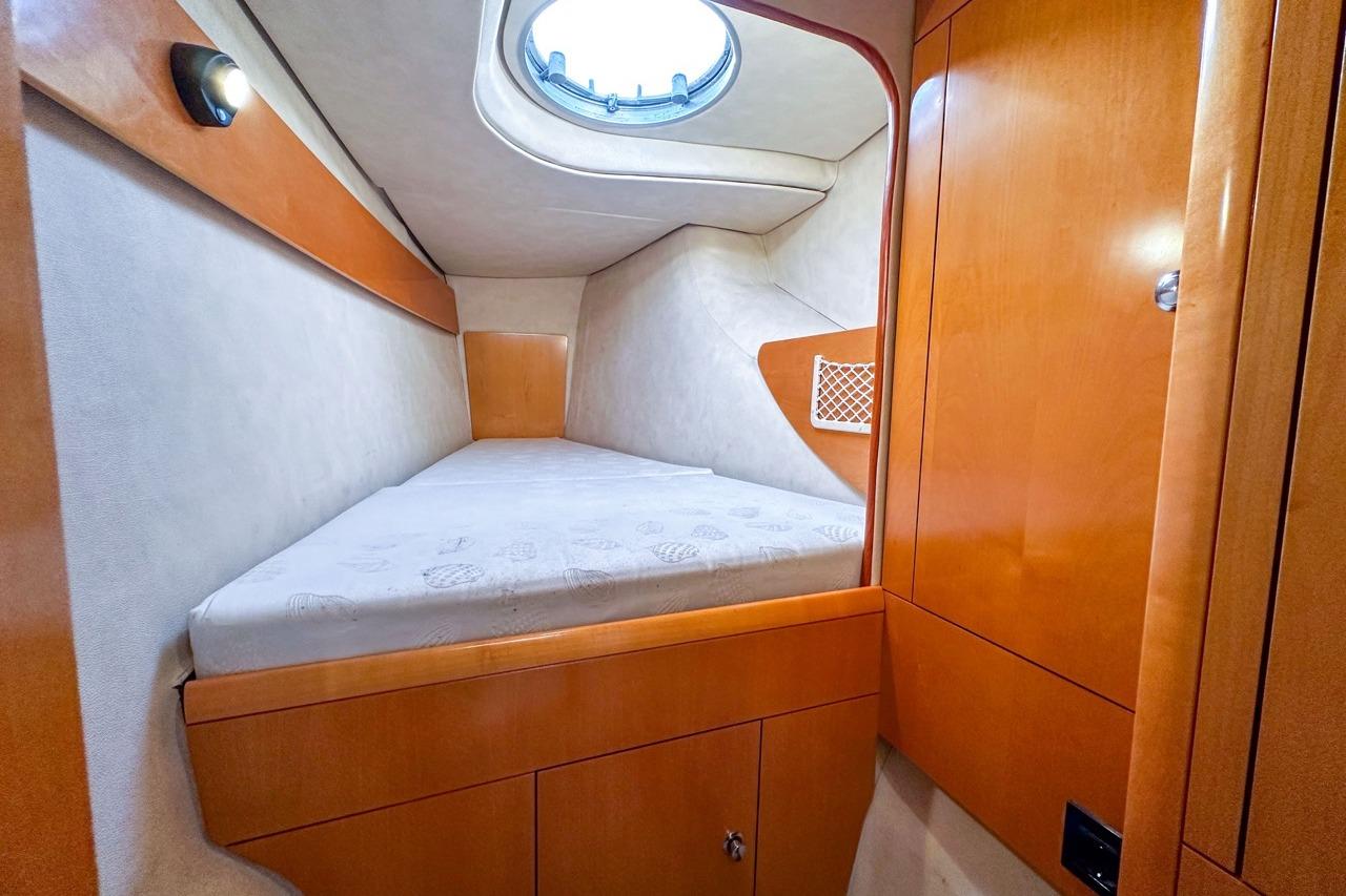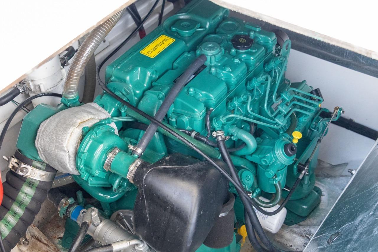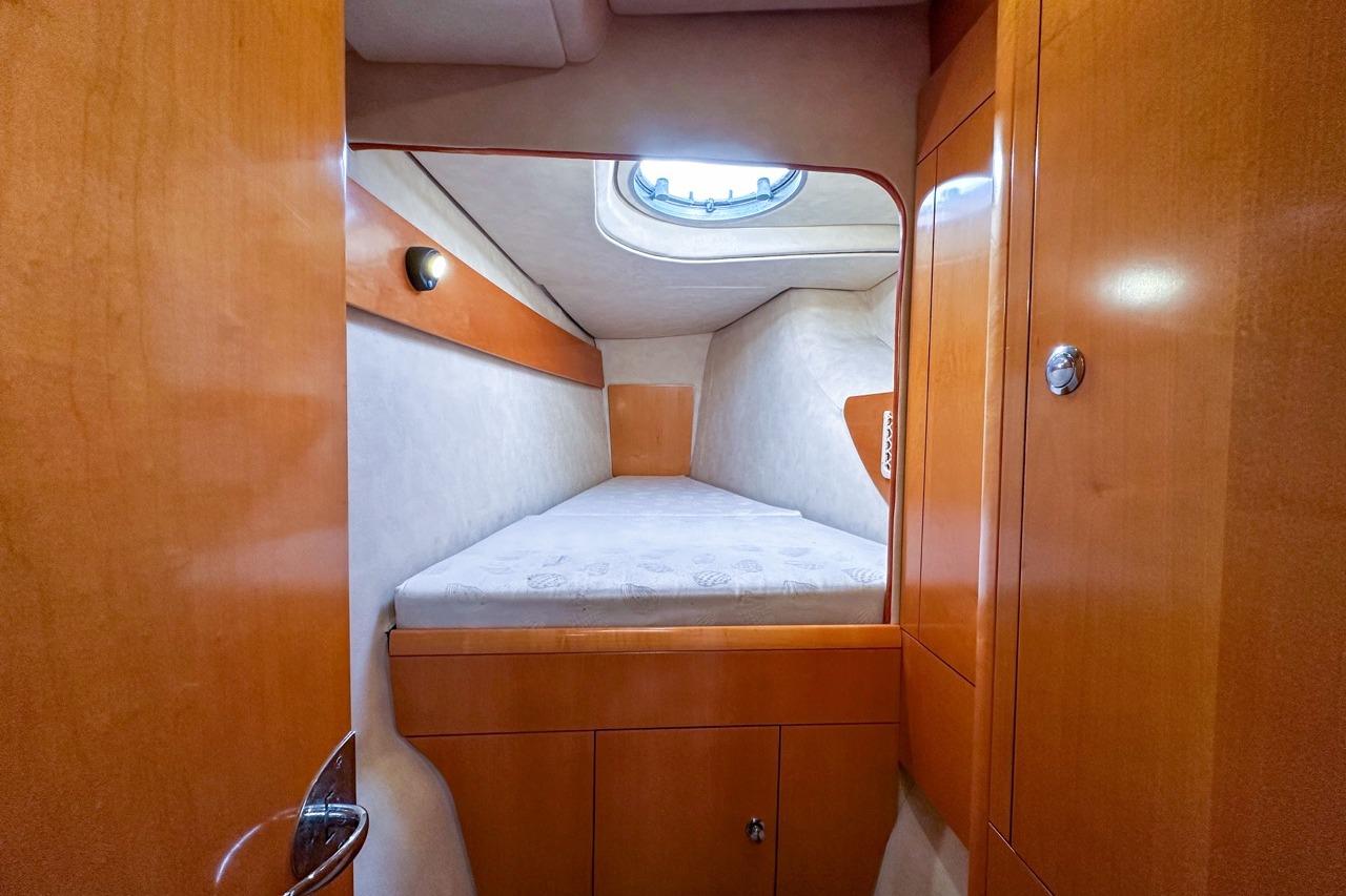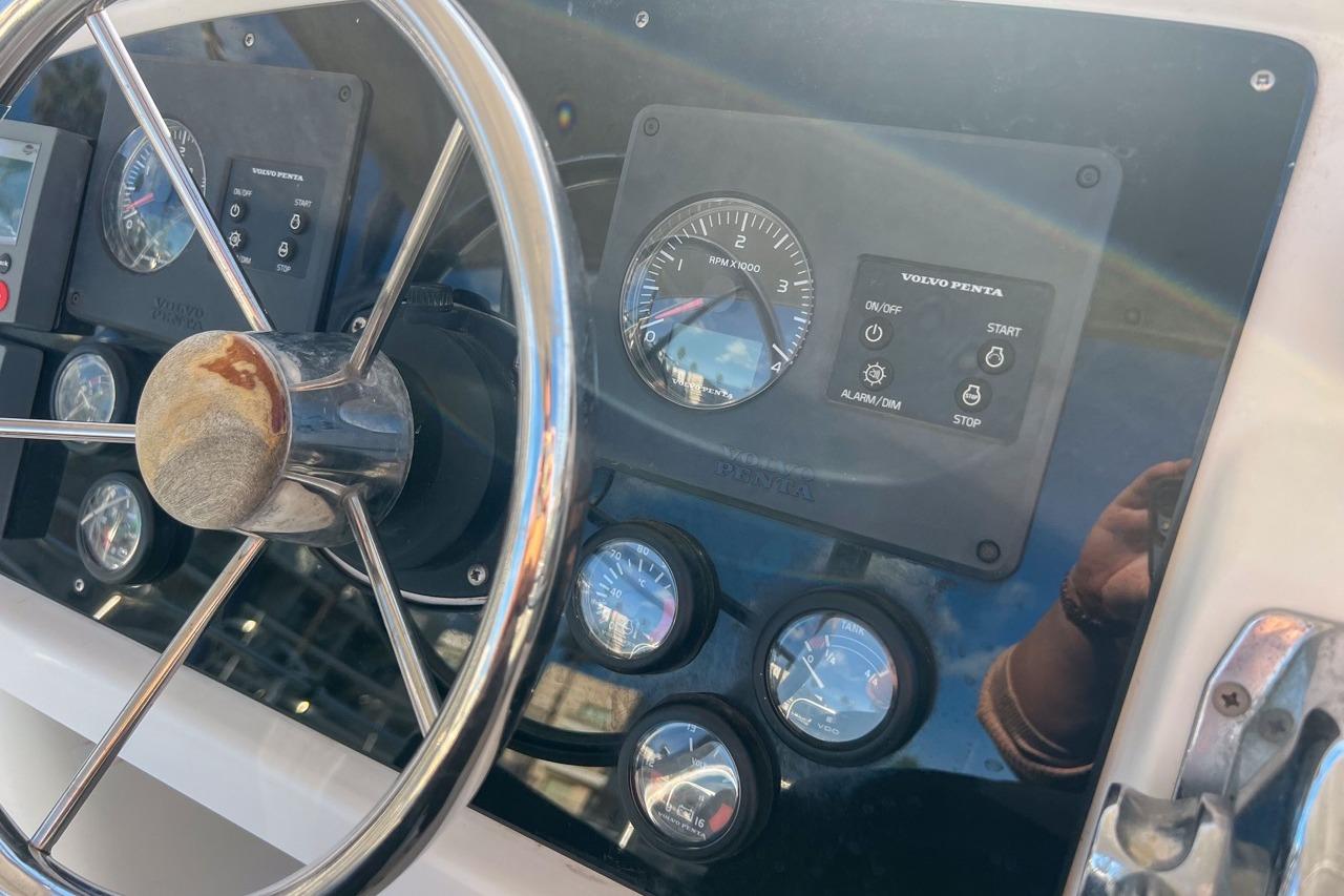 The exterior is designed for enjoyment at sea, featuring a spacious cockpit, flybridge seating, and aft sunshade, perfect for al fresco dining or relaxing on deck. Inside, upgraded cushions, modern lighting, and new fabrics create a welcoming environment, while key equipment such as autopilot, marine audio system, and Raymarine navigation ensures confidence on every journey.