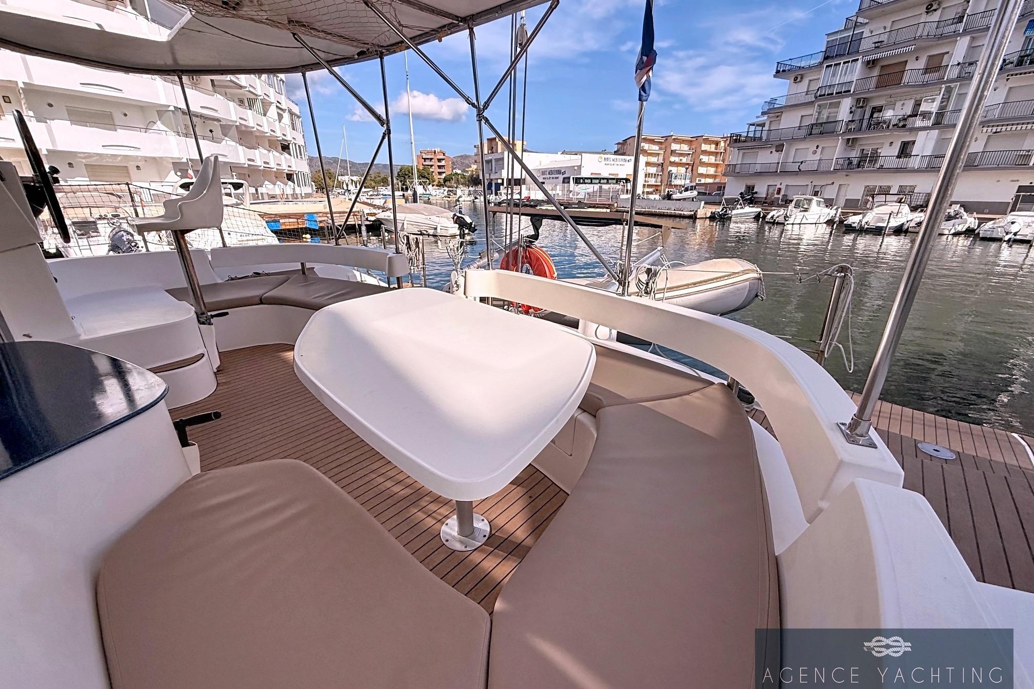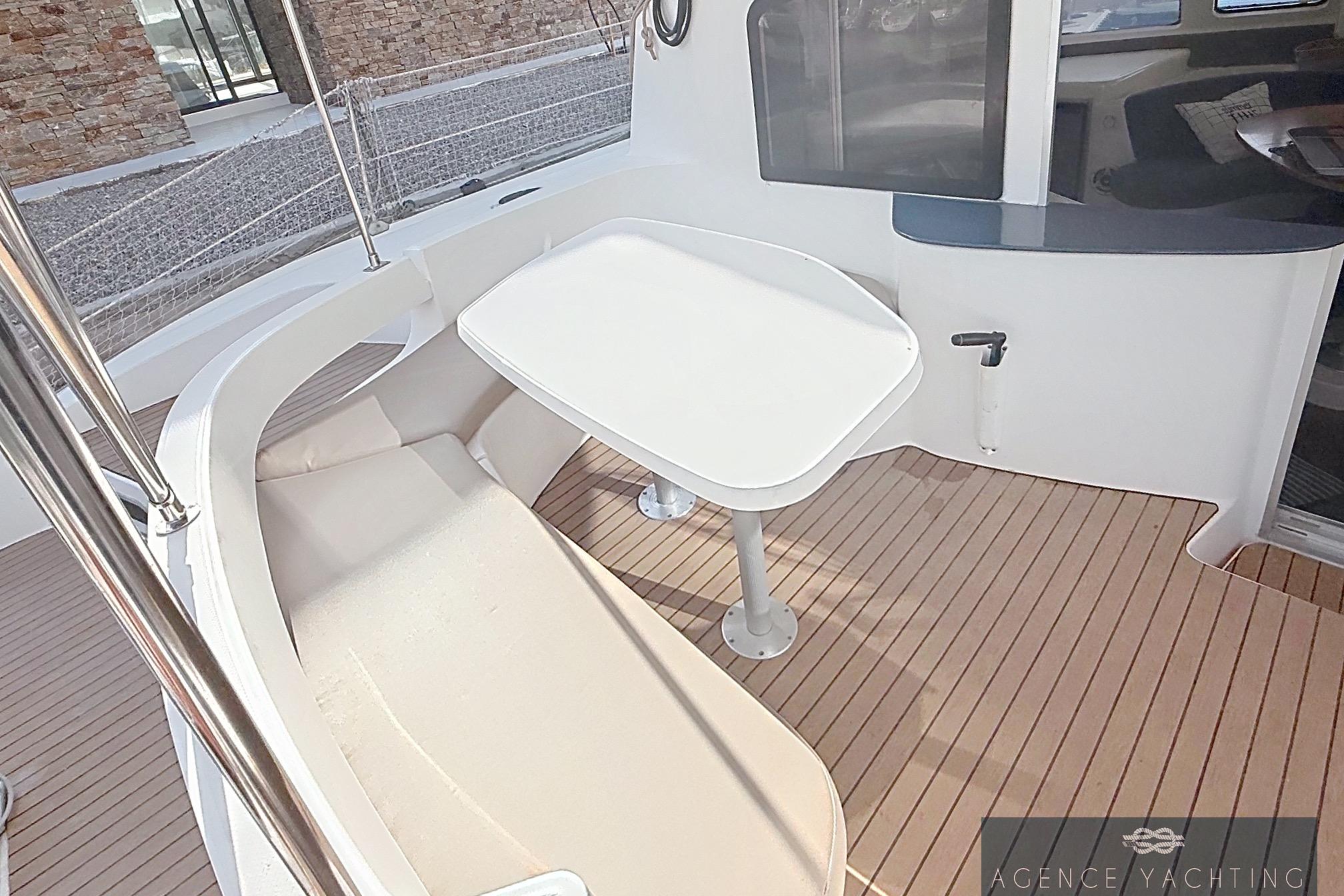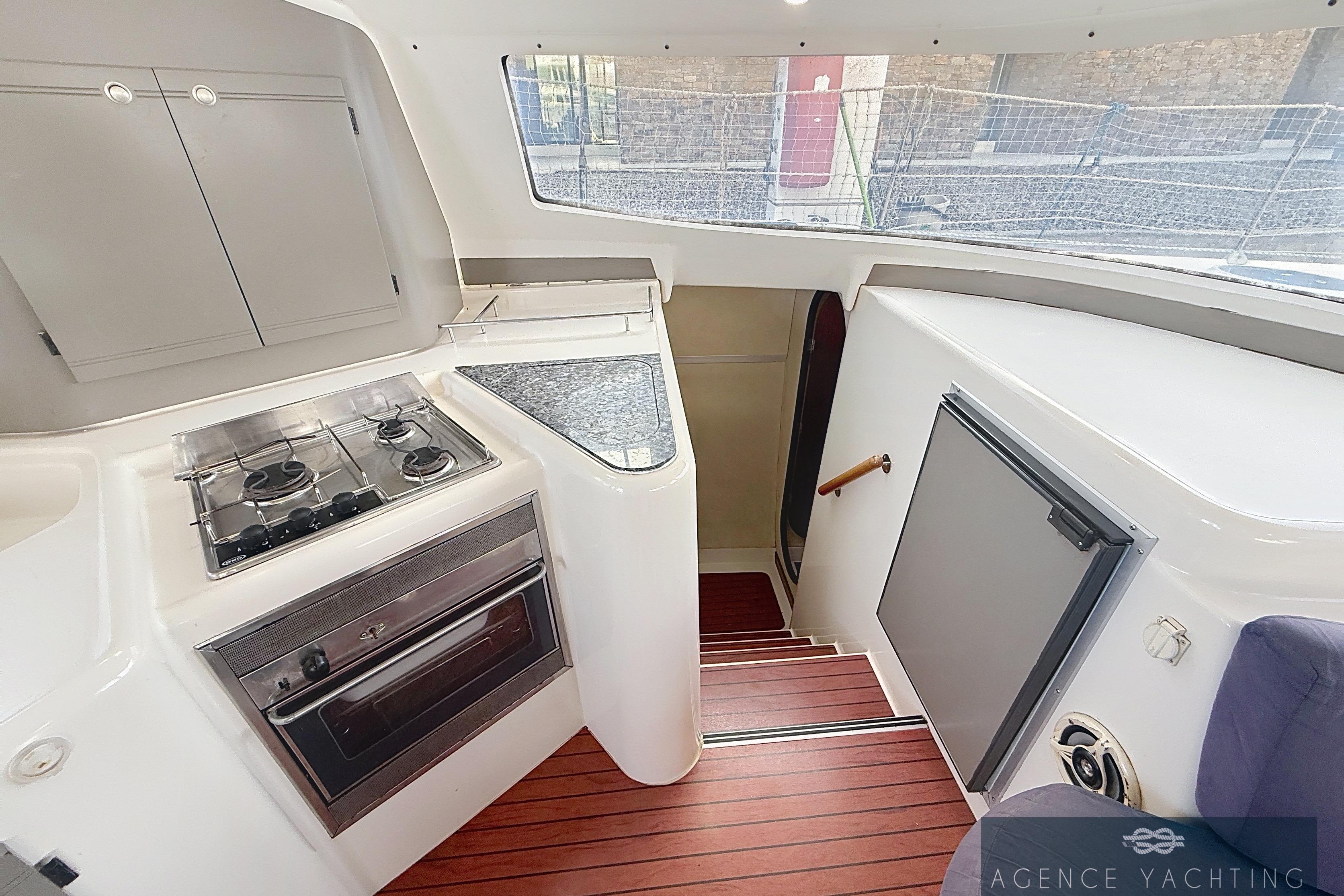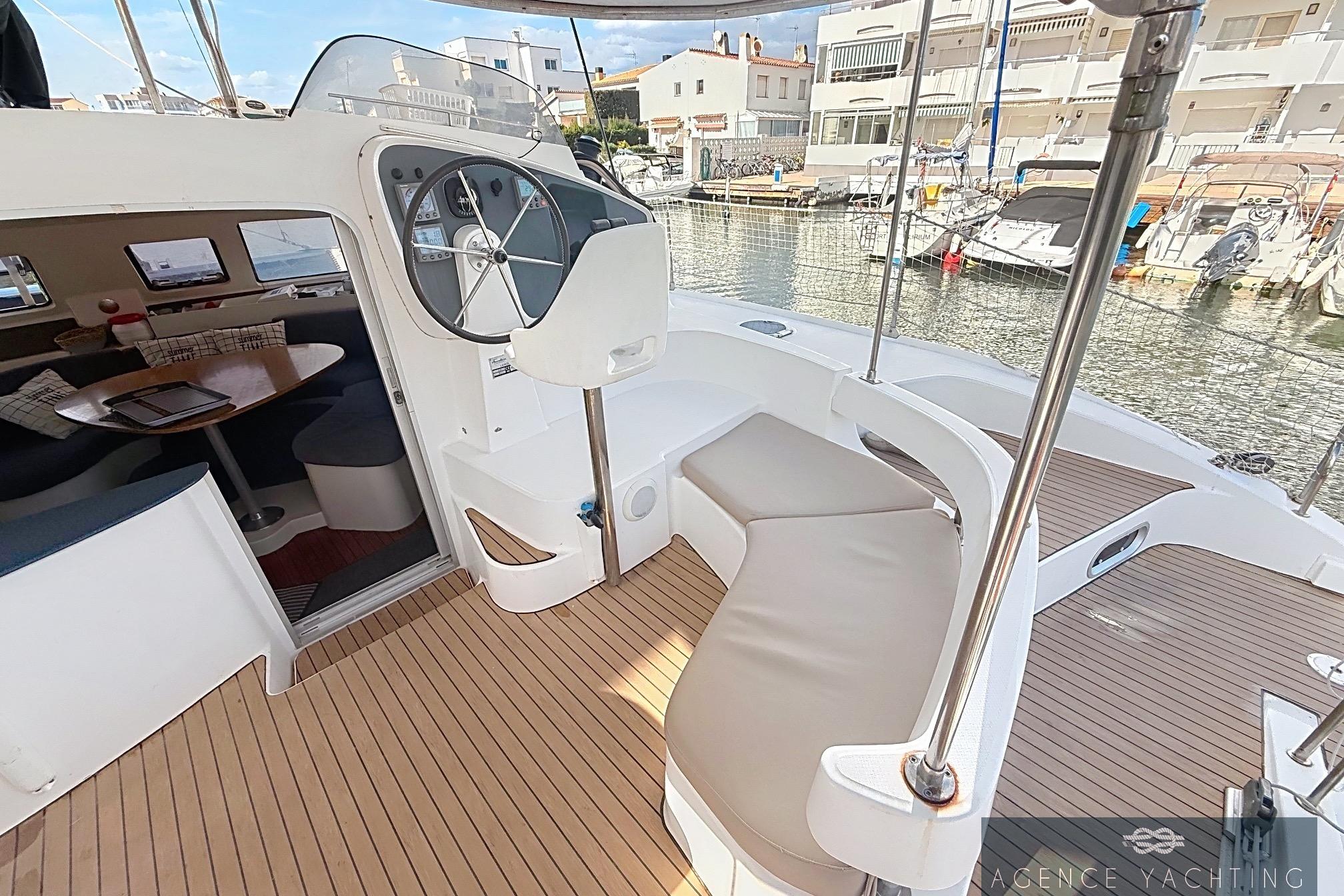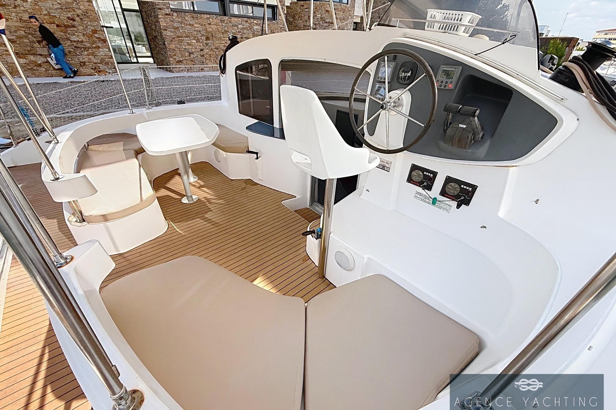 Son cockpit convivial, parfaitement protégé, se prolonge par un carré lumineux et une cuisine fonctionnelle tournée vers l’extérieur.