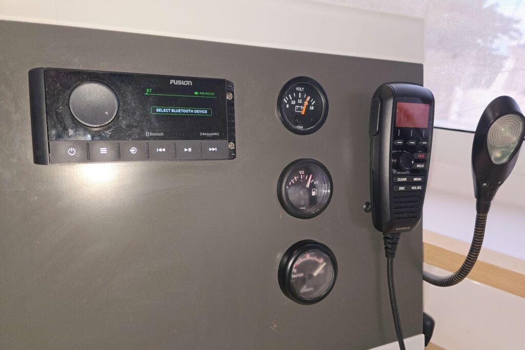 Nav station with sound system, VHF, Garmin chartplotter, and other controls, in floor storage, in coffee table storage