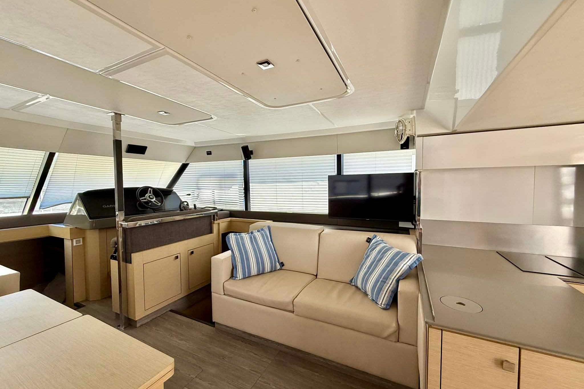 This new power catamaran has comfortable relaxation and reception spaces worthy of a second home. Savor memorable moments with family and friends on her enormous flybridge, designed with a sunbathing lounge, a galley and a real terrace or pool overlooking the sea. You will adore her saloon, a large open area with a terrace, spacious lounge and galley opening directly onto the cockpit, where you can enjoy outdoor activities all day long.