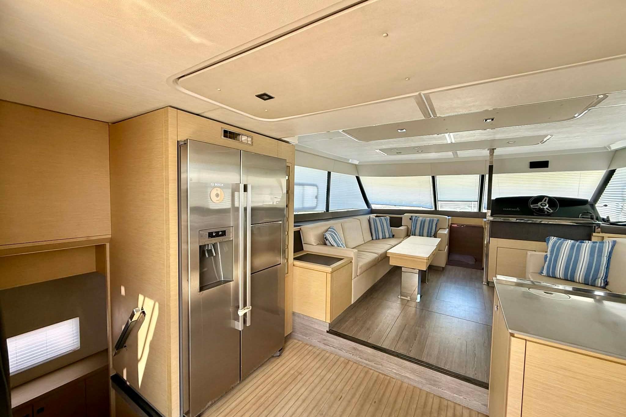 Step aboard and you'll find yourself in a beautifully appointed and well-lit salon. The open floor plan provides plenty of space for entertaining, while large windows allow natural light to flood the space. The aft deck features the extremely popular, full-beam hydraulic swim platform and faux teak on the platform, aft deck and cockpit and continues into the main level of the galley/salon. The fully equipped galley is perfect for preparing meals and features modern appliances and plenty of storage space.