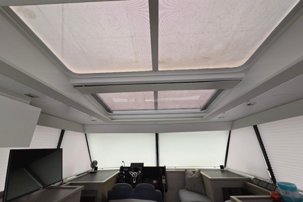 Her large expanses of glass at the front and overhead and the single-level open-plan layout make this yacht a true delight on the water.