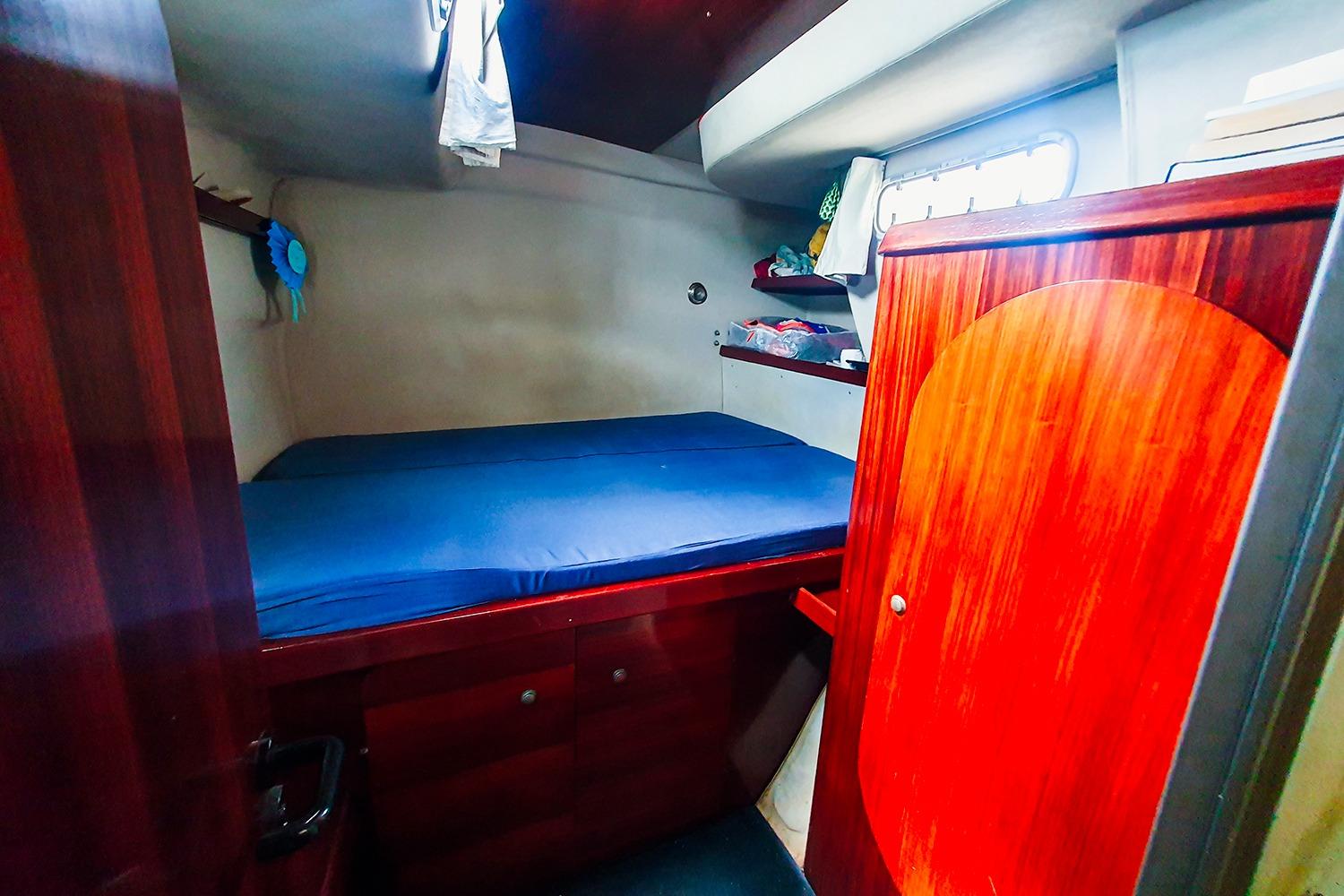 Il s’agit d’une version 4 cabines, équipée d’une grand-voile, d’un foc et d’un gennaker, offrant un jeu de voiles adapté aussi bien à la croisière qu’à des navigations plus dynamiques.