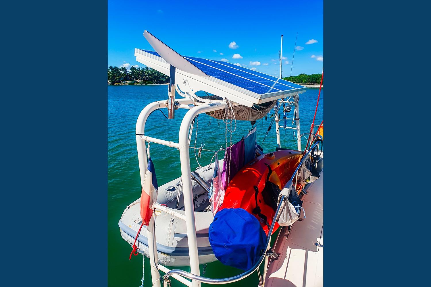 Concernant l’autonomie pour la vie à bord, il dispose d’un lave-linge 4 kg, d’un dessalinisateur produisant 50 litres par heure, de trois panneaux solaires totalisant 420 W, ainsi que d’un système Starlink permettant un accès Internet haut débit.