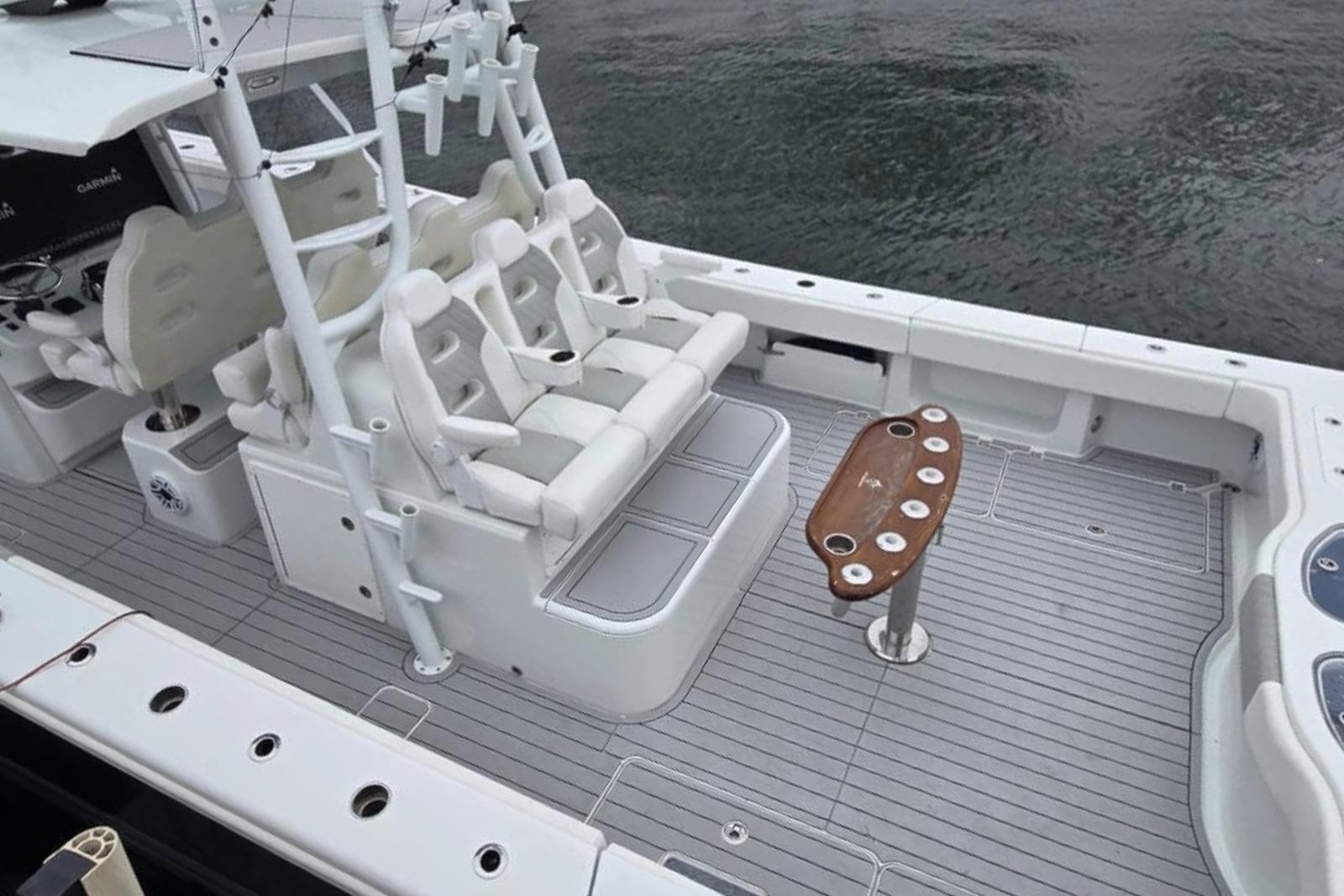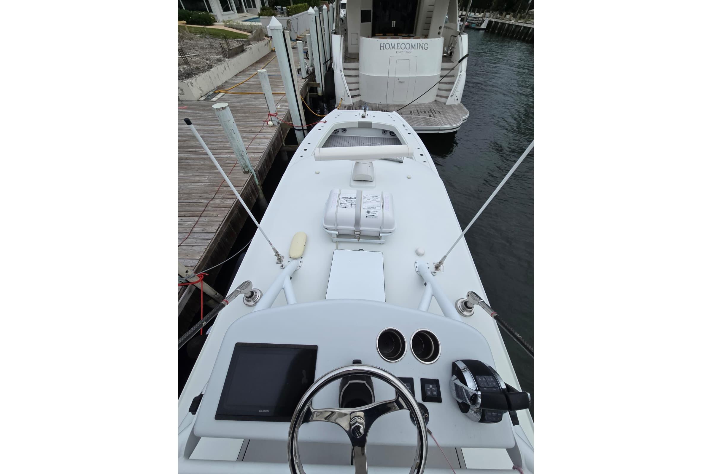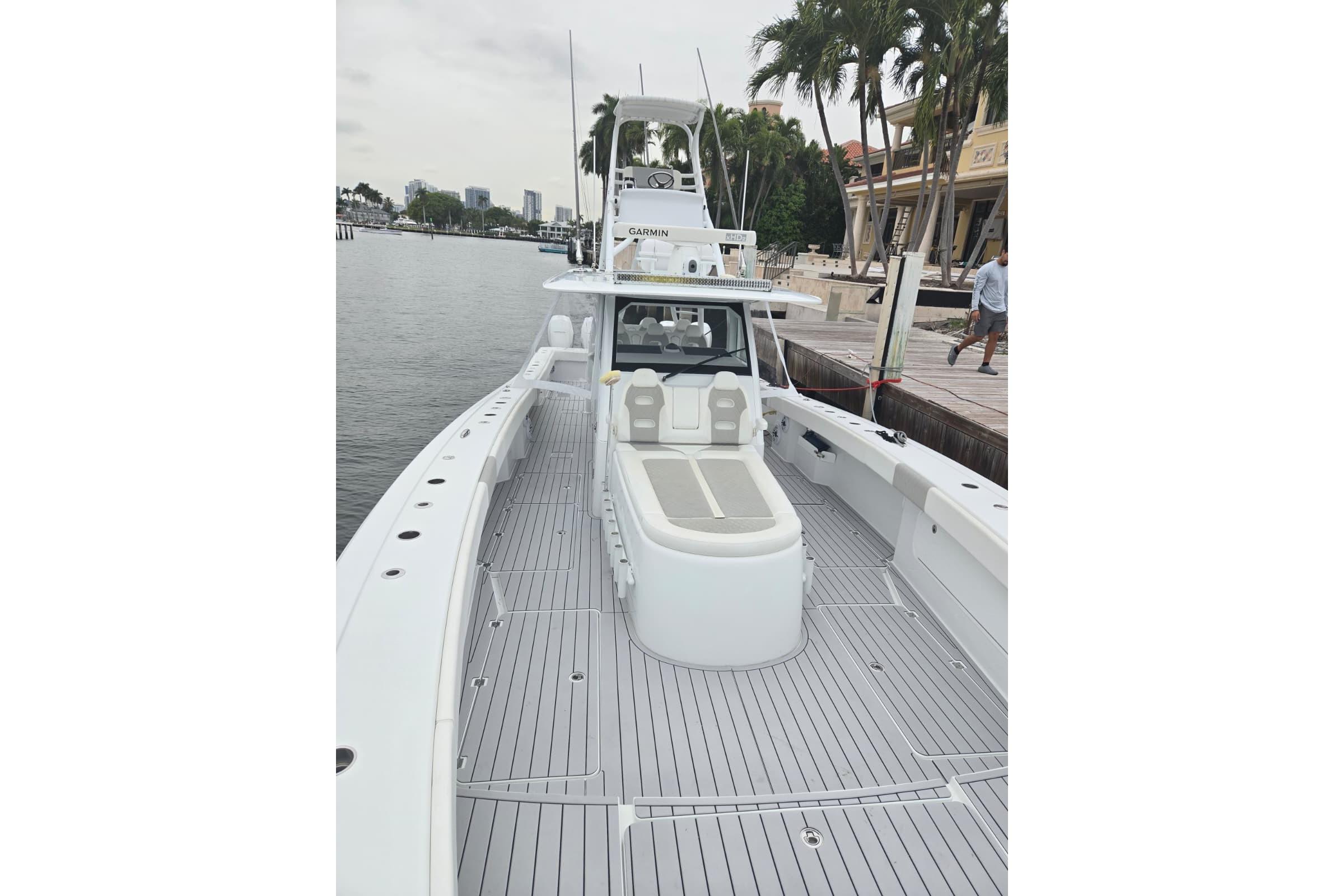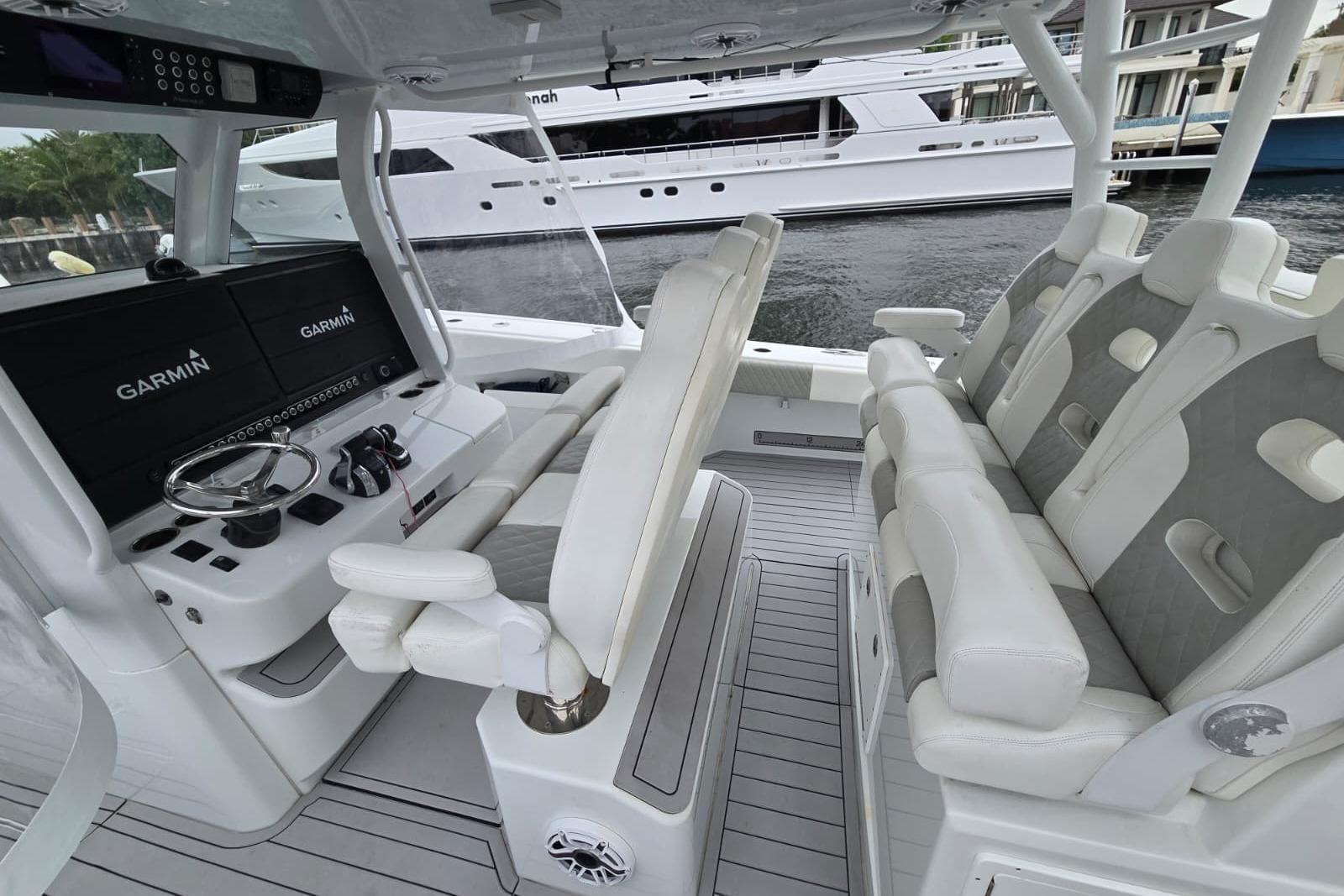You’ll appreciate the range: 1,025 gallons of fuel gives you over 750 nautical miles, so extended runs are no problem. Electronics are top-notch, with big Garmin displays, integrated autopilot, and Starlink satellite internet to keep you connected wherever you roam. Safety’s covered too, with an included hardtop mounted life raft onboard.