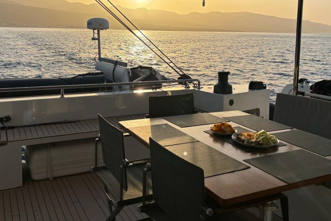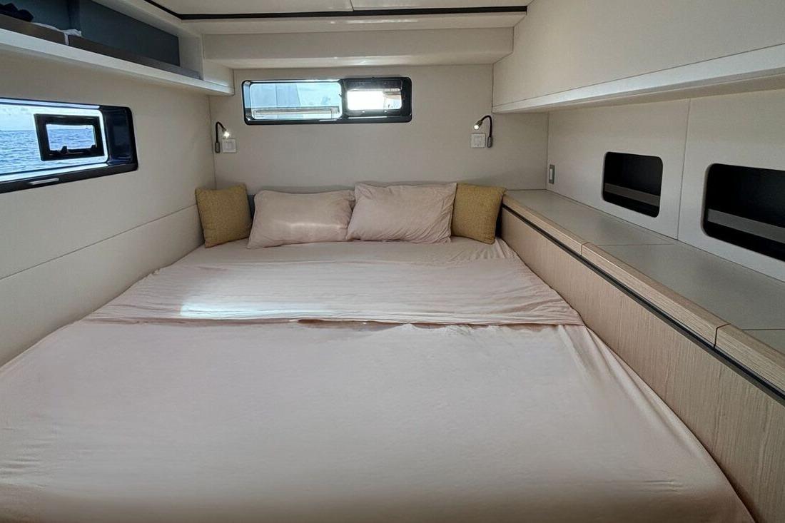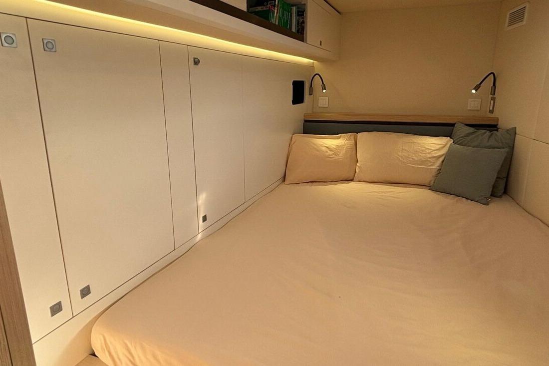 Comfort on board is simply remarkable: 4 guest cabins accommodating up to 8 guests, one crew cabin, a fully equipped galley, 50,000 BTU WEBASTO air conditioning, independent heating system, and a high-end FOCAL audio system...