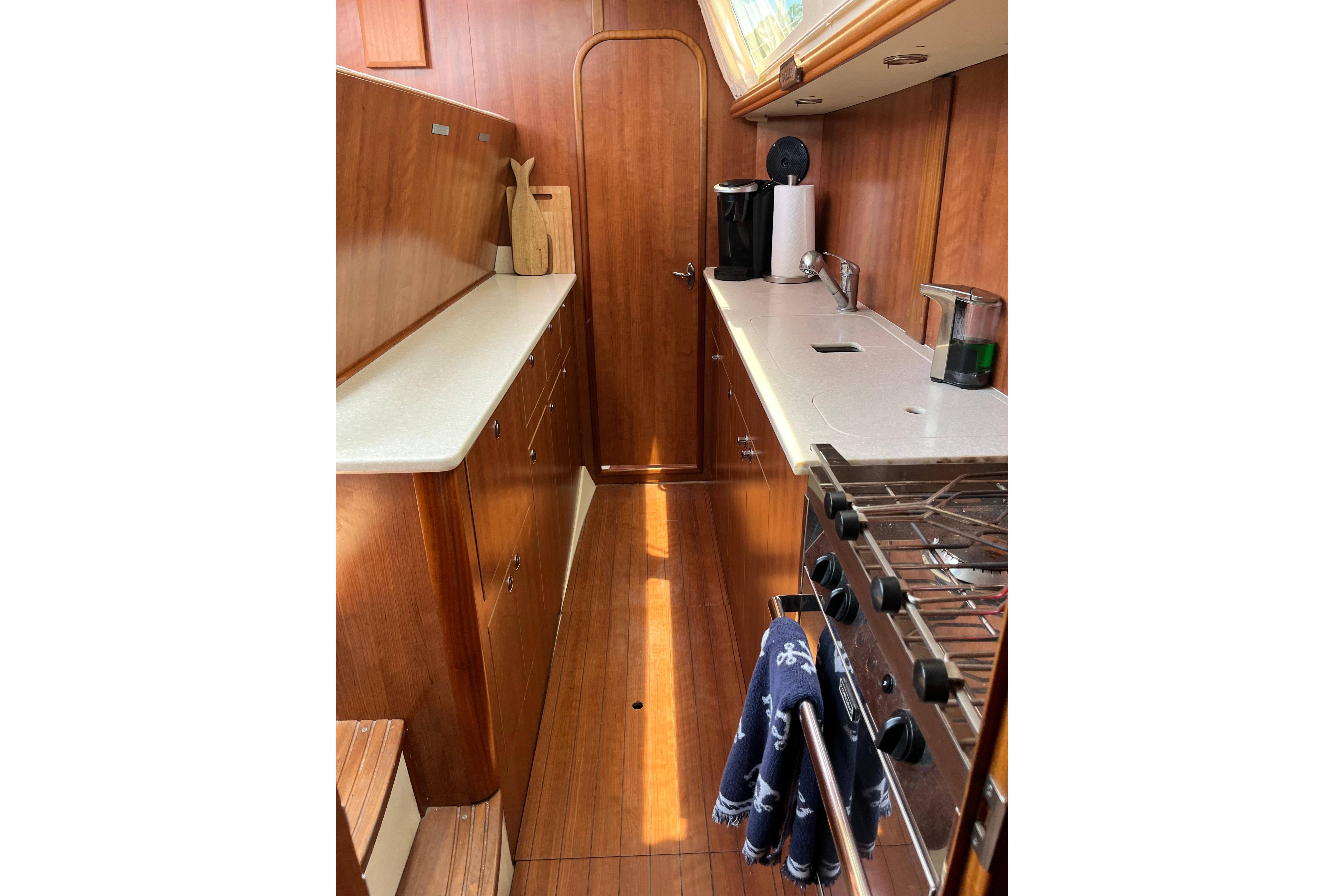 The galley down gives privacy to the chef as well as plenty of prep space. The deep, double wide sinks have Corian covers to match the countertop.