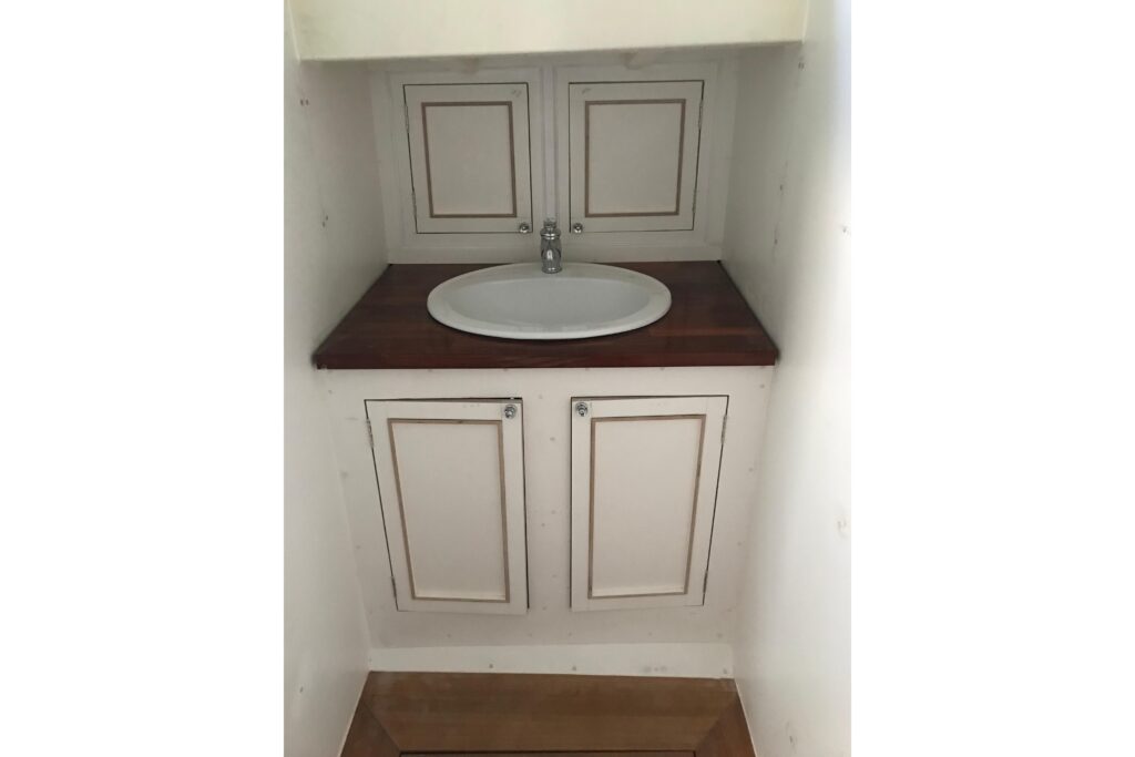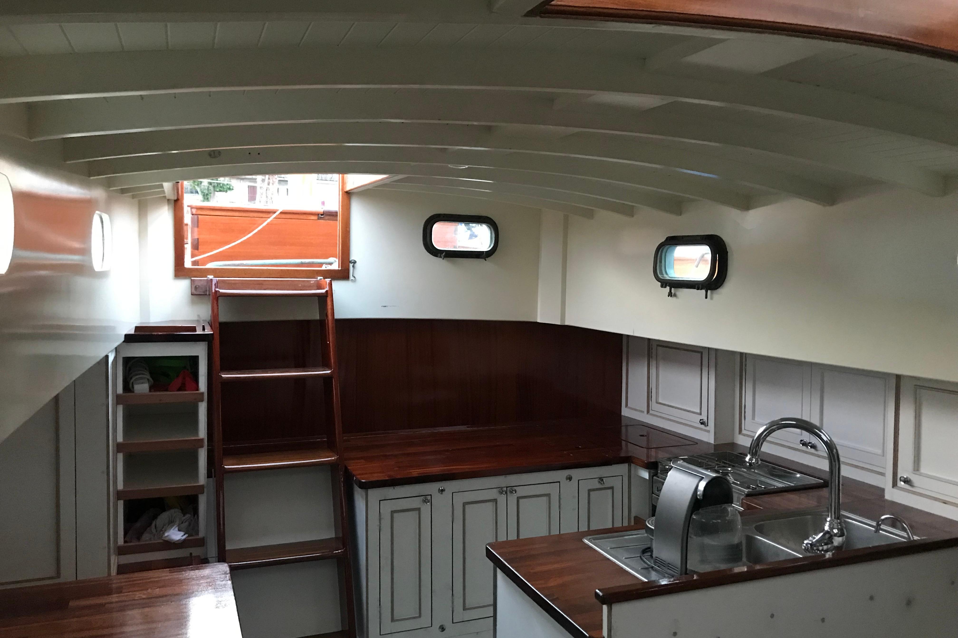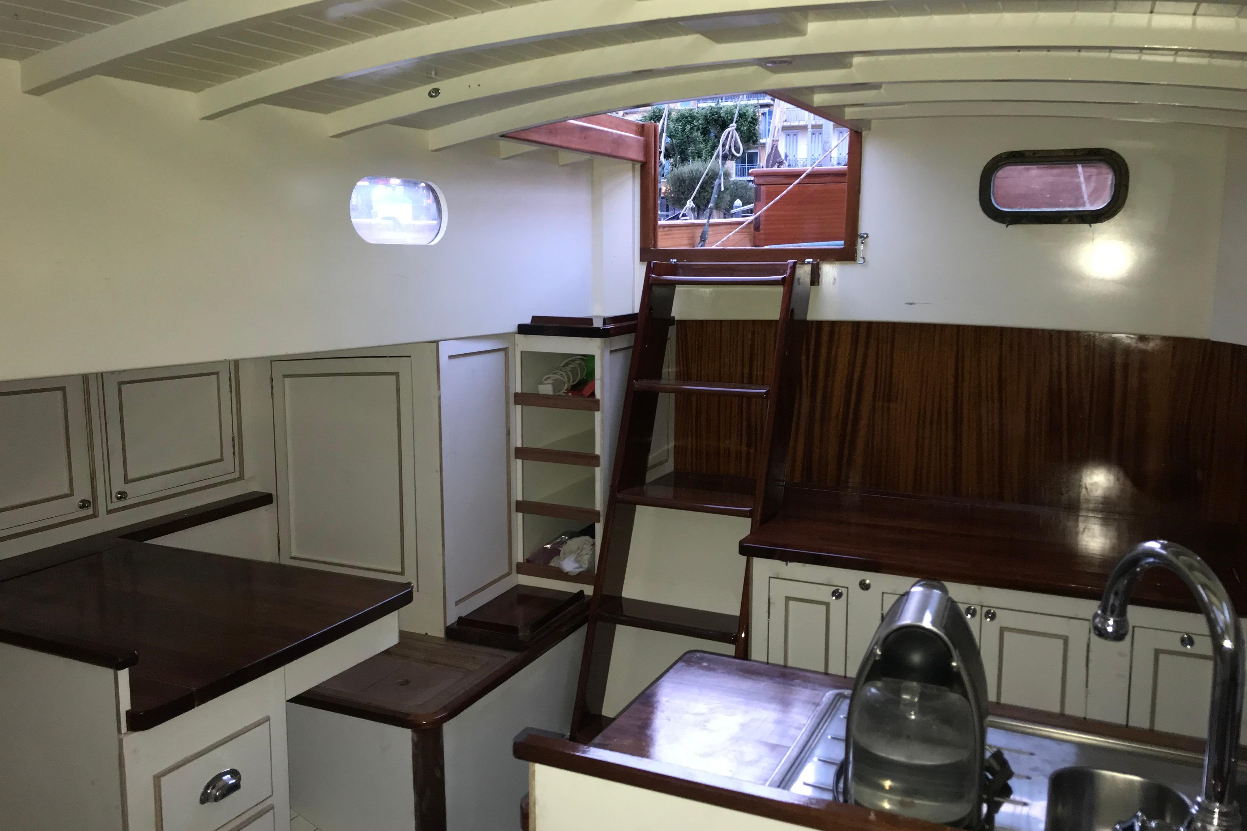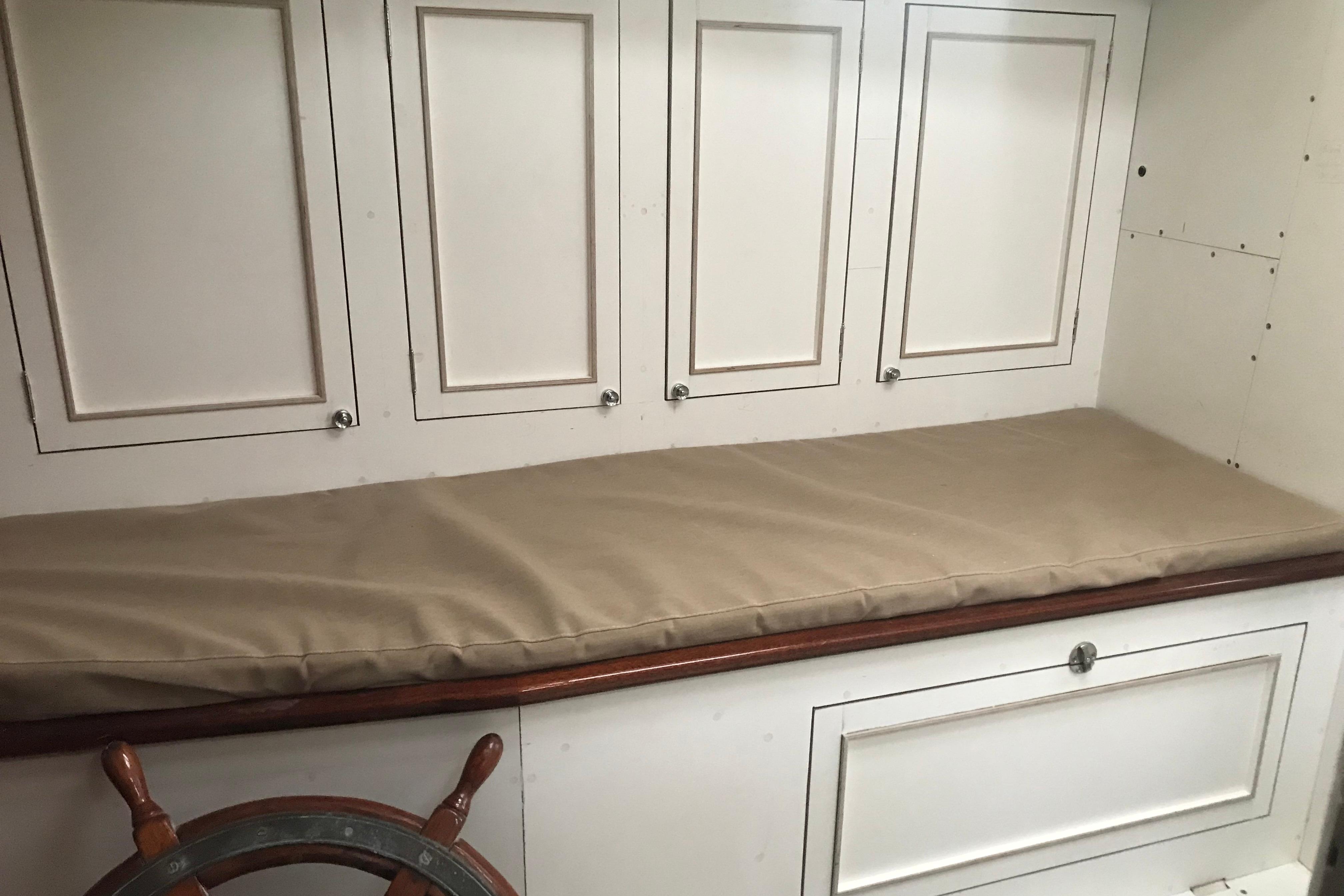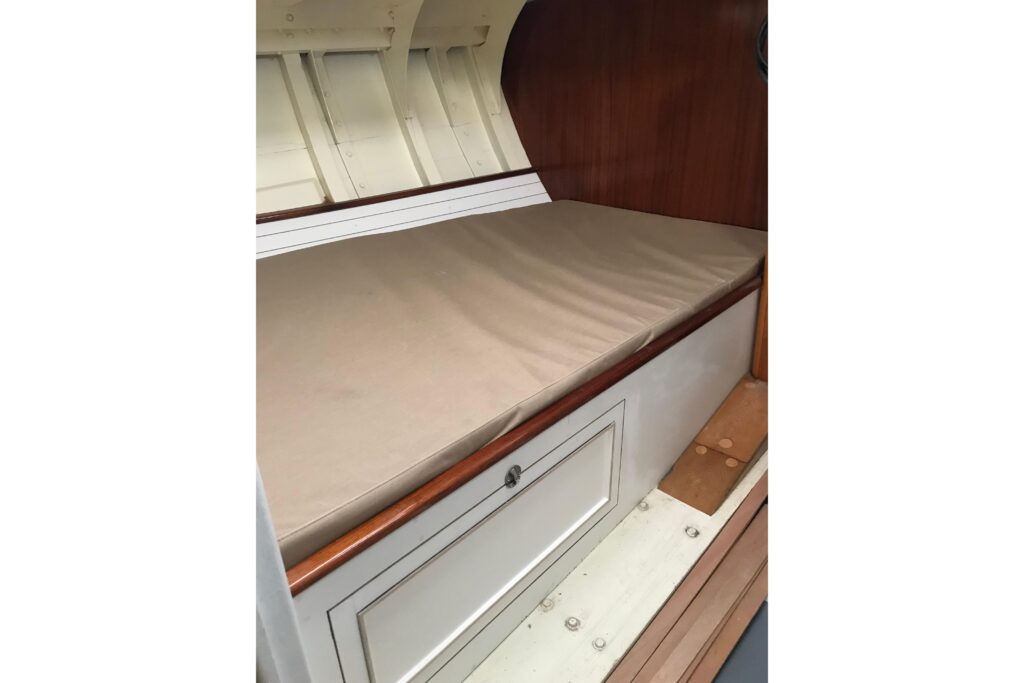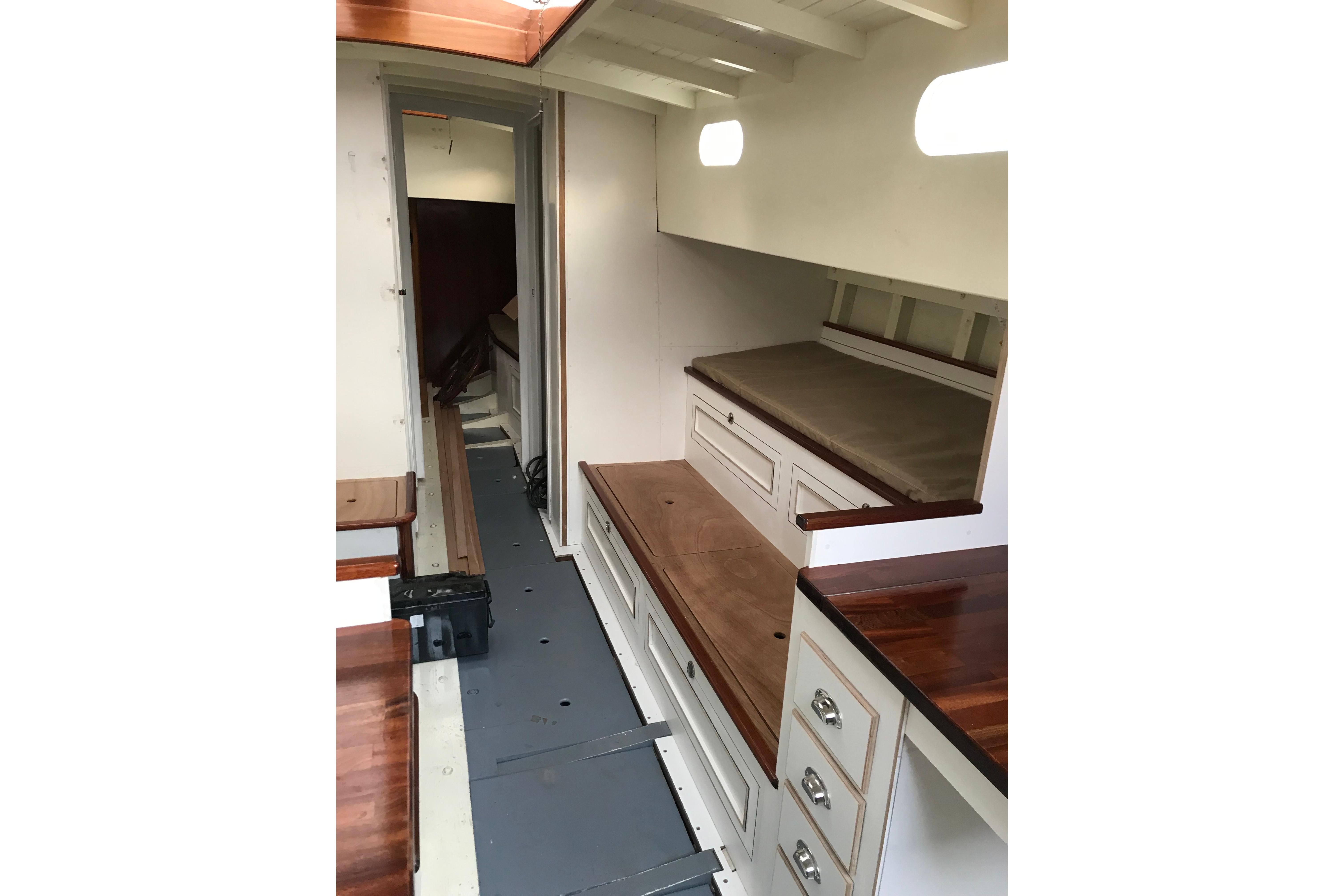 The interior has been progressively outfitted since 2014 and is now completed. The salon, two pilot berths, chart table and galley furniture are in place. The salon has new cushions and pilot berths have new matresses. The master stateroom forward (queen double to port and single bunk to starboard with new mattresses) and bathroom with large shower and sink. A separate head is to starboard.