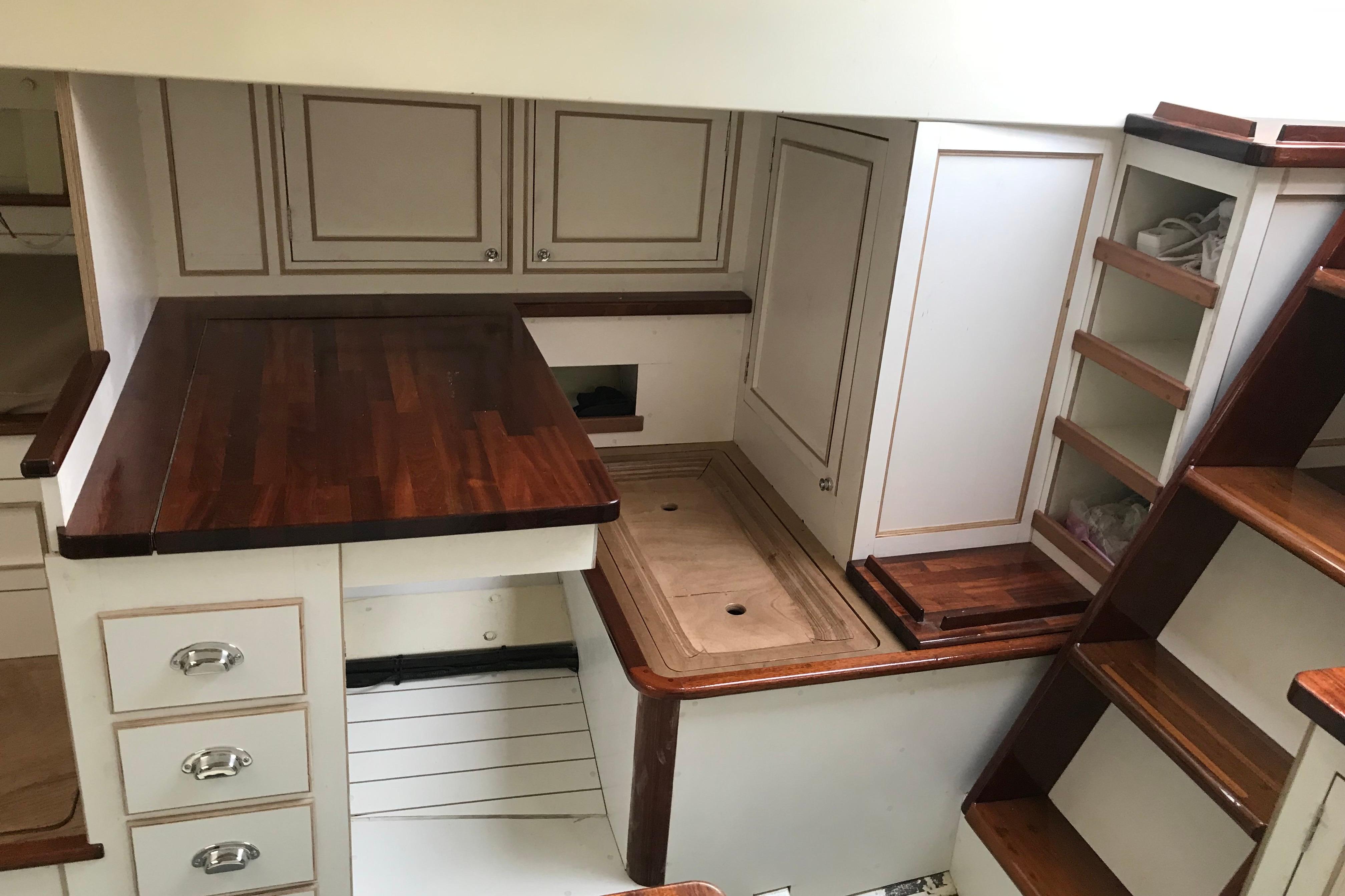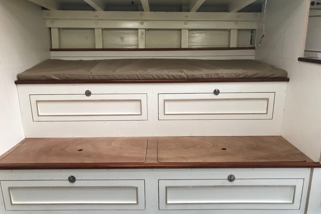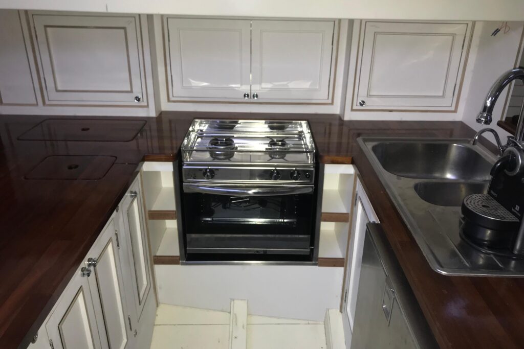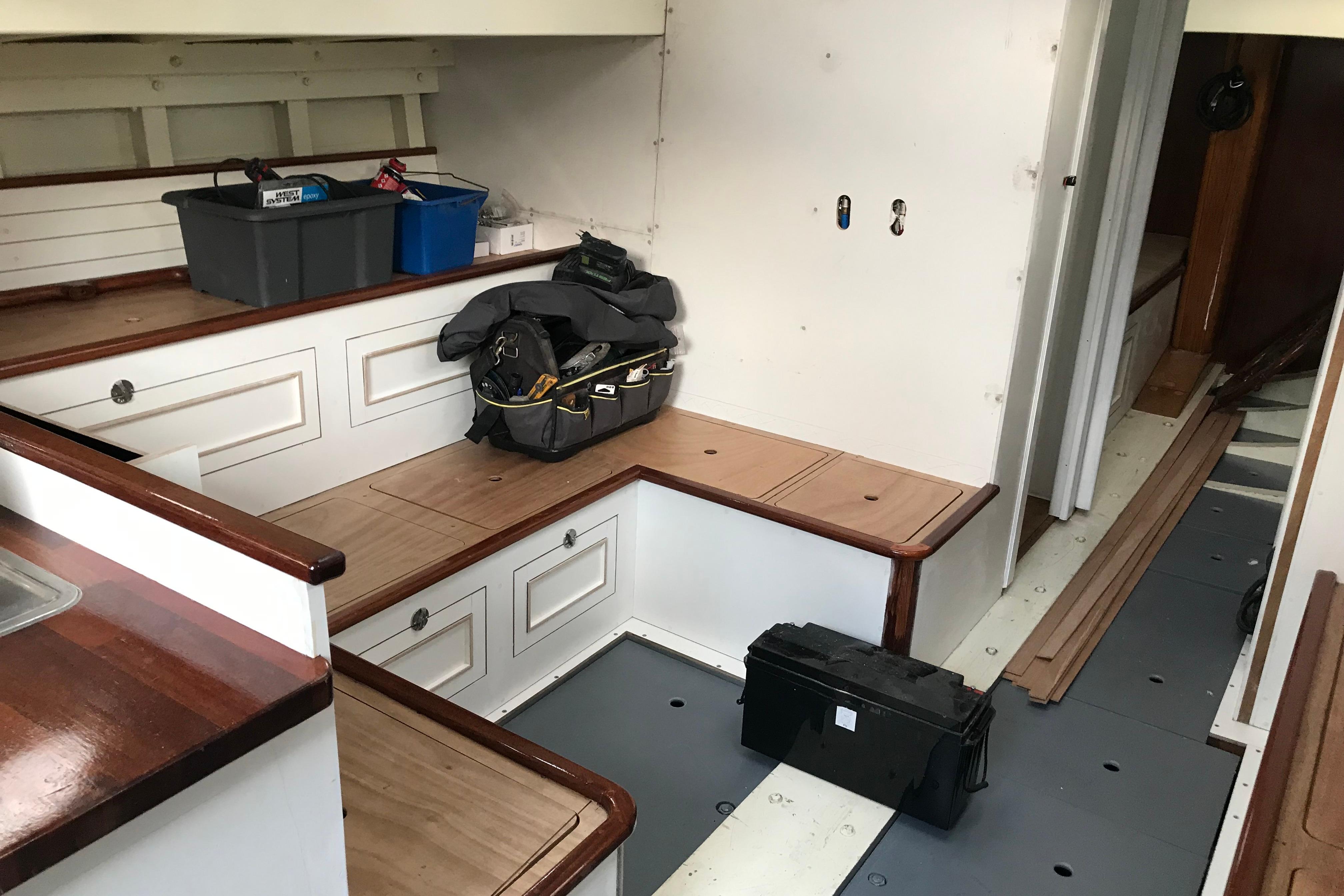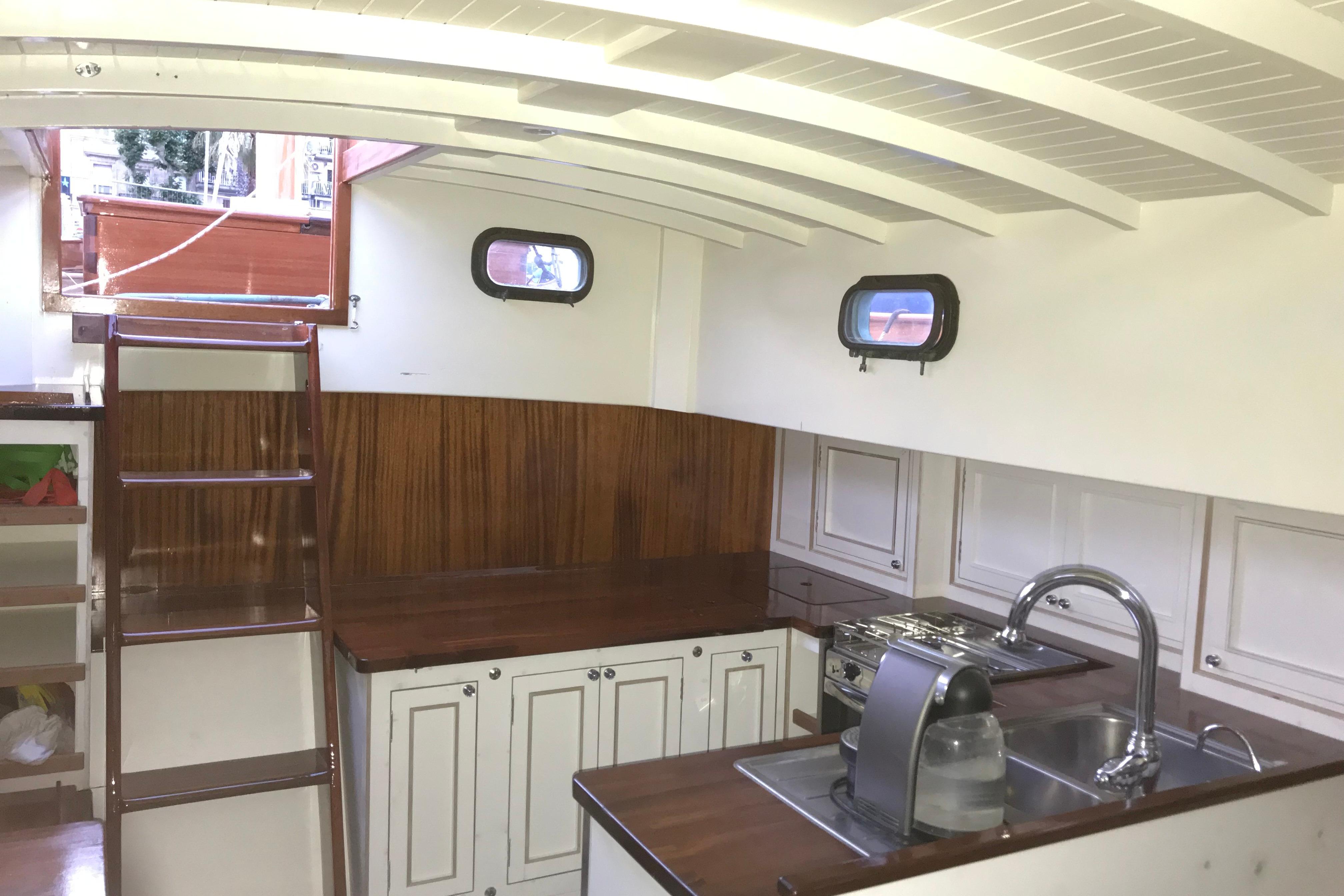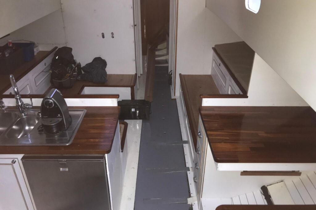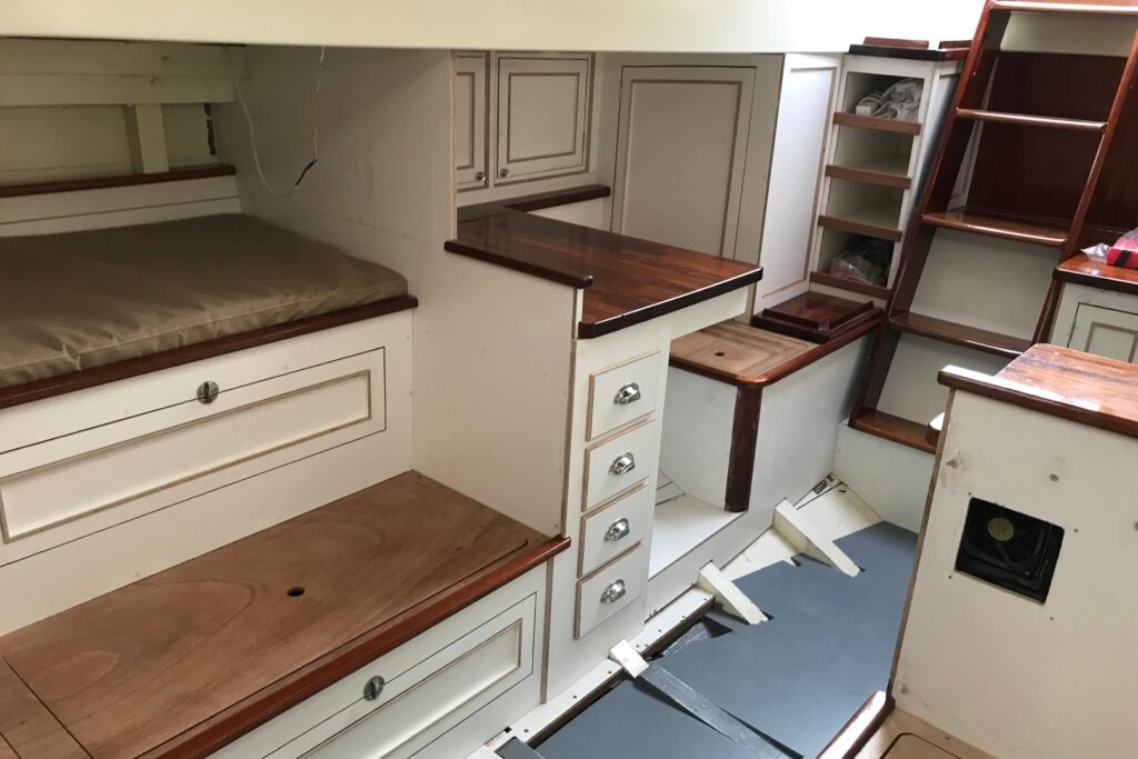 The interior has been progressively outfitted since 2014 and is now completed. The salon, two pilot berths, chart table and galley furniture are in place. The salon has new cushions and pilot berths have new matresses. The master stateroom forward (queen double to port and single bunk to starboard with new mattresses) and bathroom with large shower and sink. A separate head is to starboard.