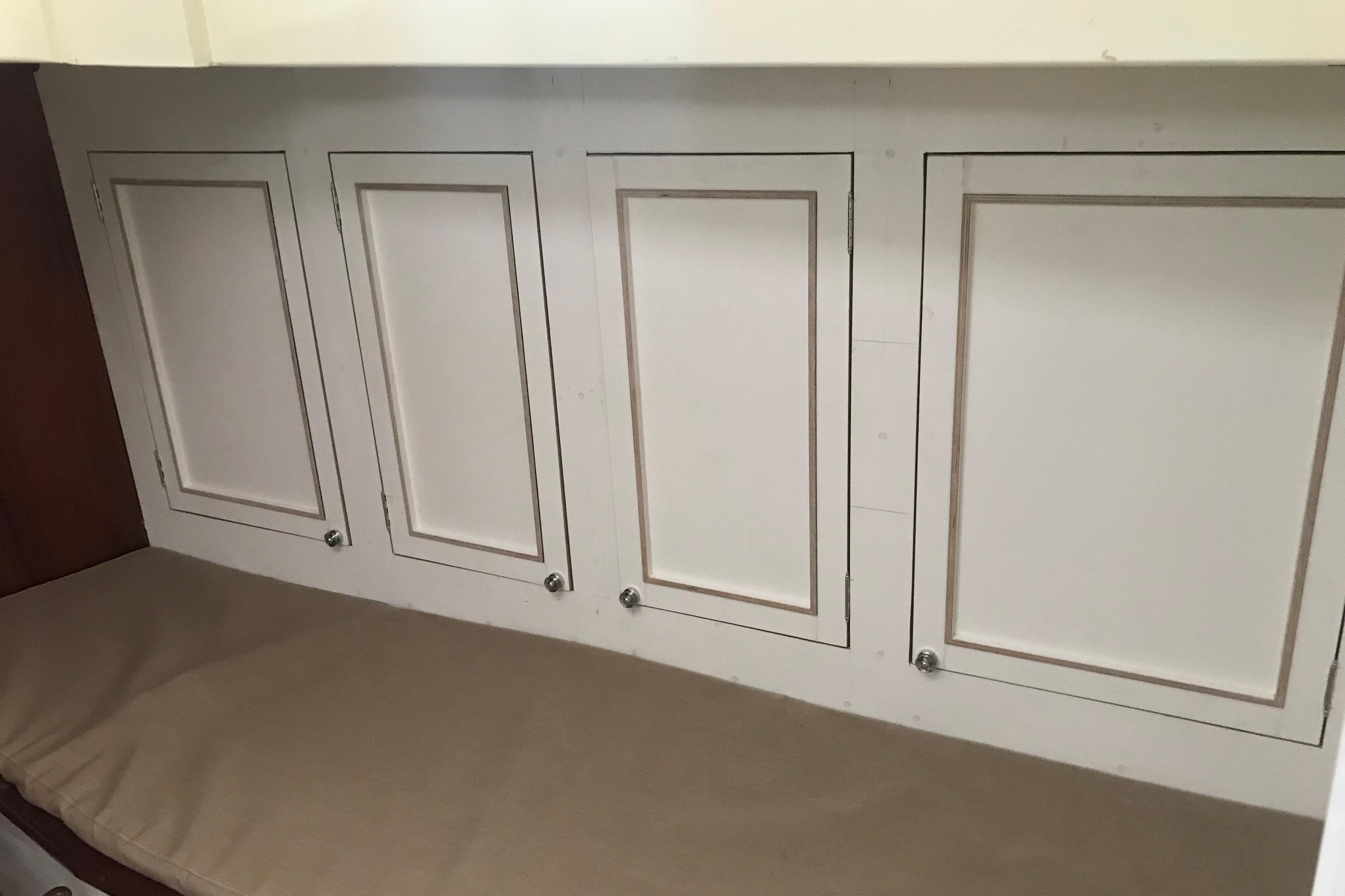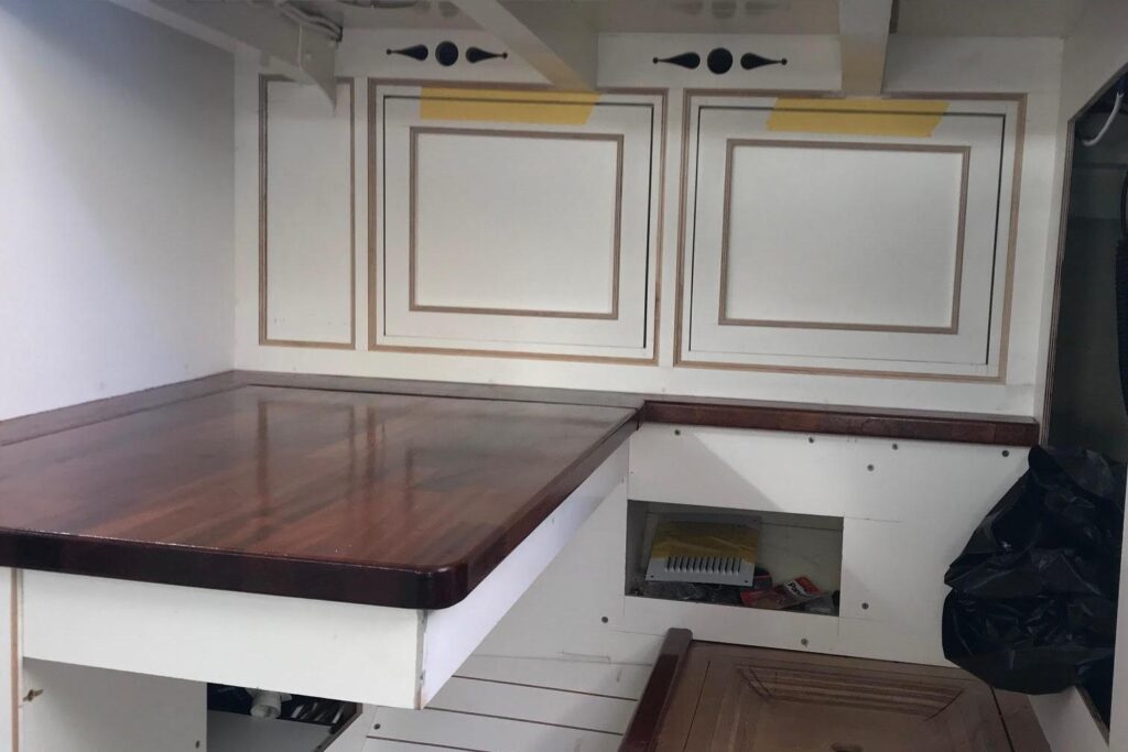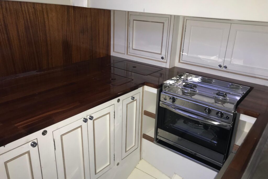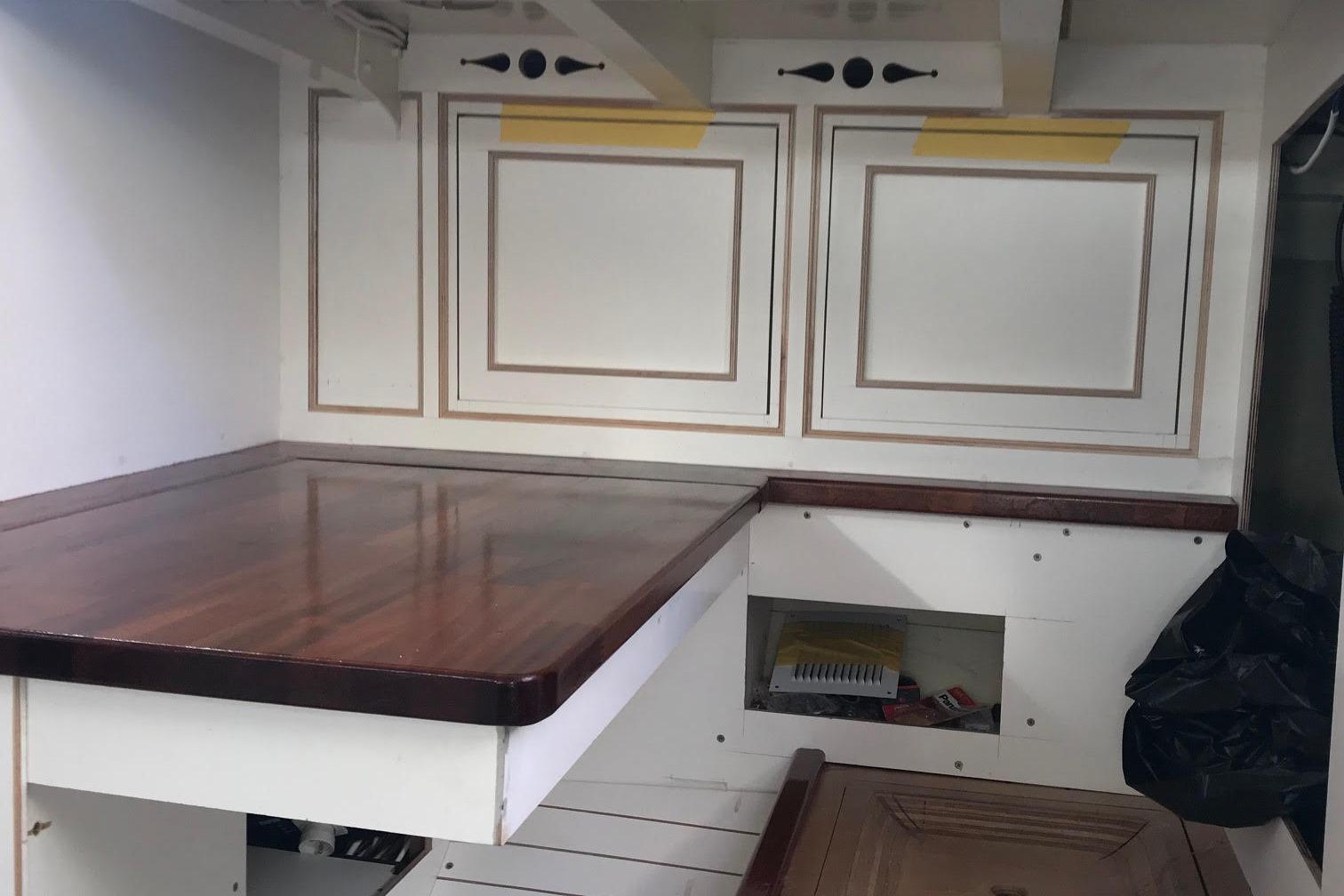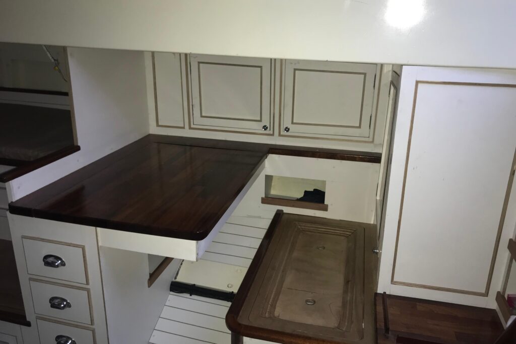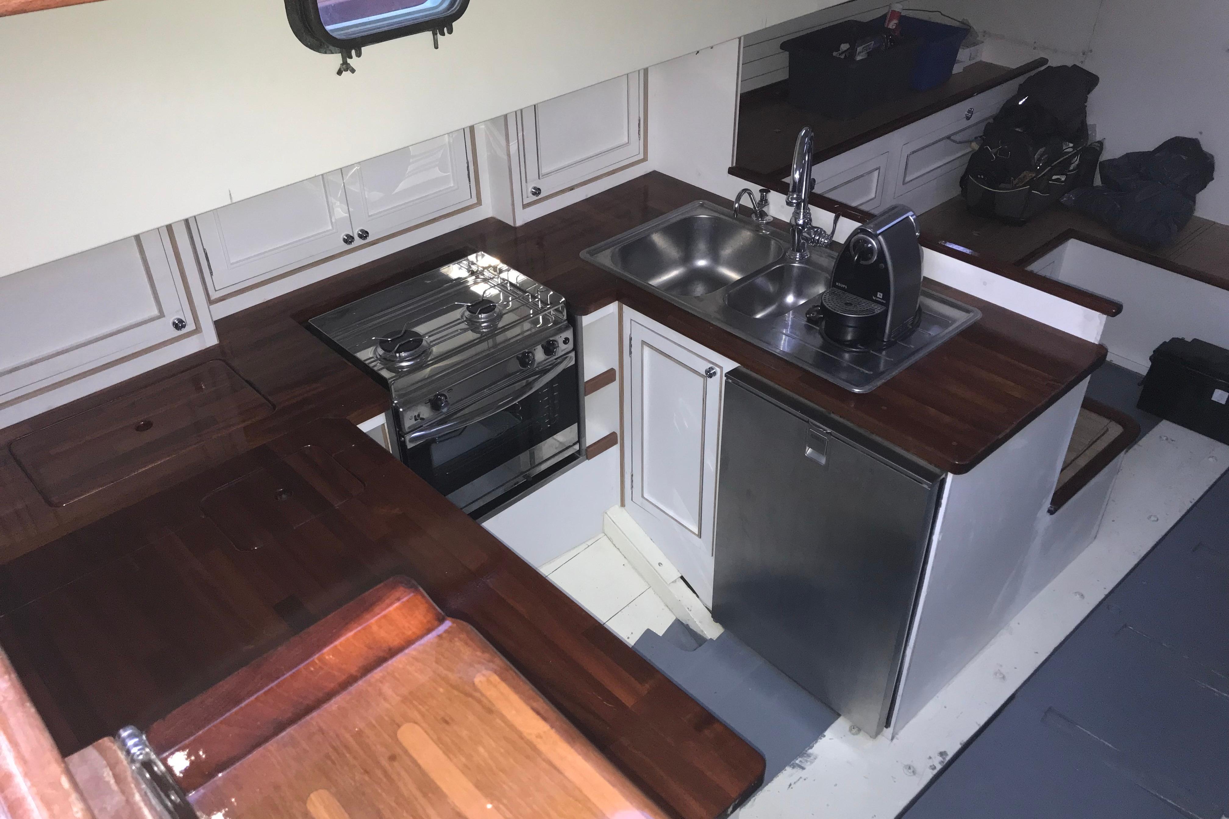 The interior has been progressively outfitted since 2014 and is now completed. The salon, two pilot berths, chart table and galley furniture are in place. The salon has new cushions and pilot berths have new matresses. The master stateroom forward (queen double to port and single bunk to starboard with new mattresses) and bathroom with large shower and sink. A separate head is to starboard.
