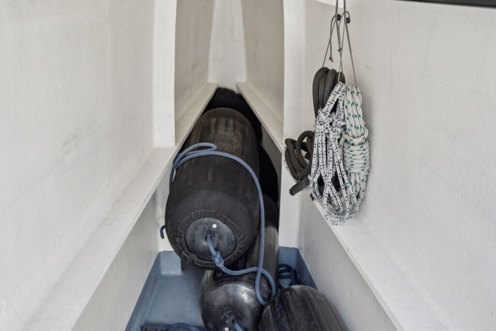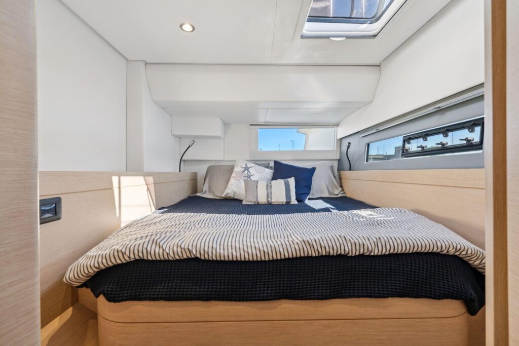 The longeron is crafted from carbon composite, and the forward crossbeam features a laminated carbon I-beam encased in a composite shell, ensuring exceptional rigidity and performance. For long-term reliability and to prevent moisture penetration, all thru-hulls and deck fittings are installed in solid laminate. For safety at sea, both the forepeak and lazarette lockers are equipped with watertight bulkheads and crash boxes.