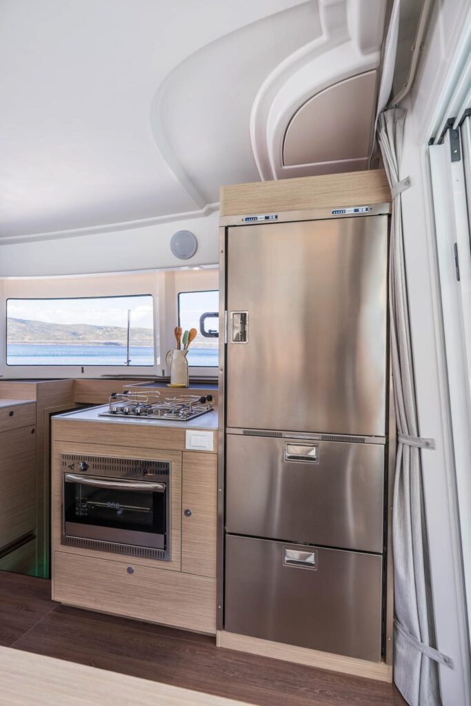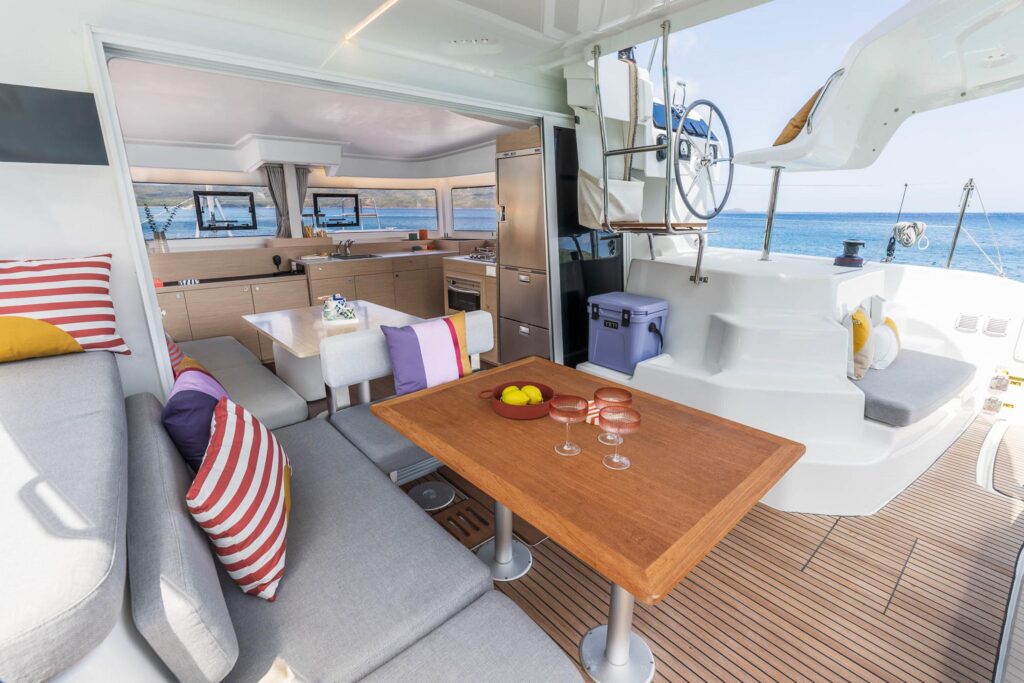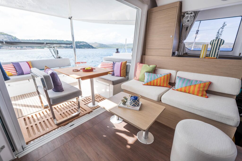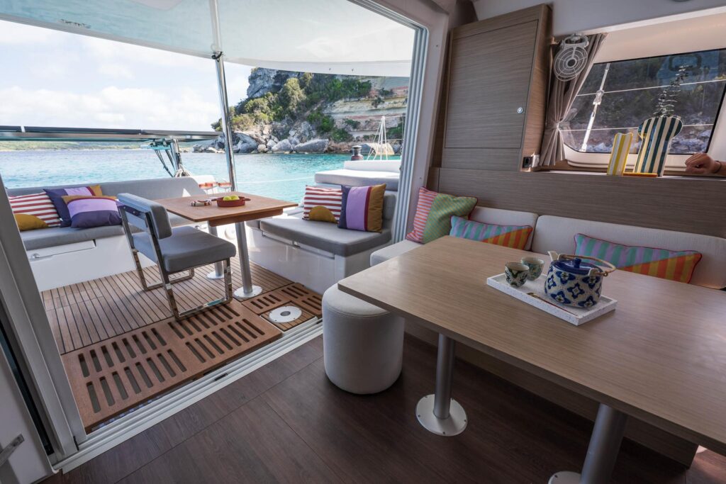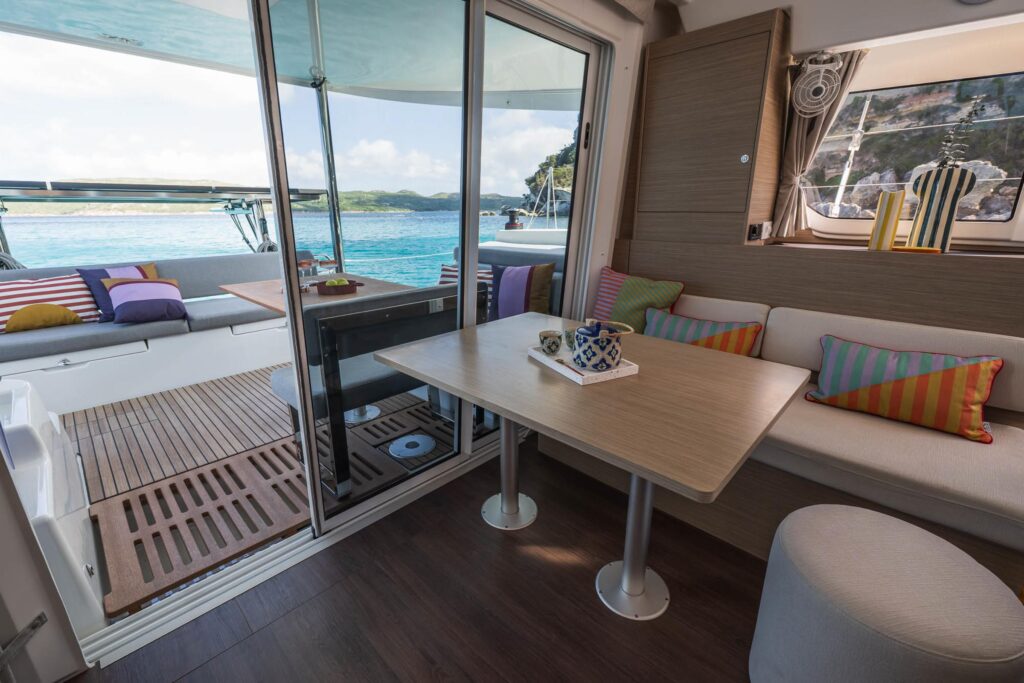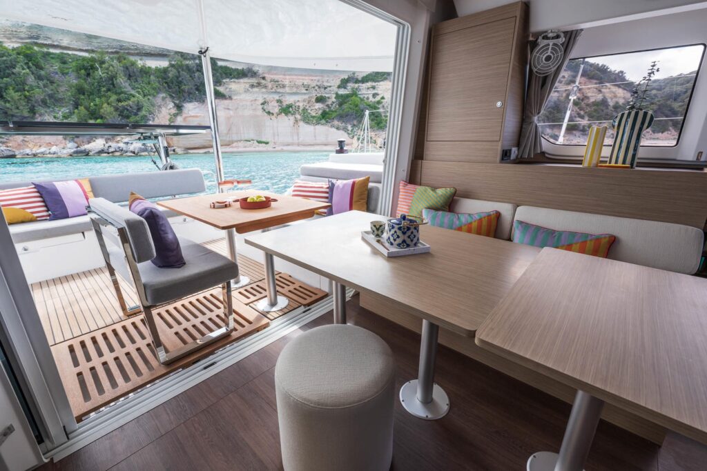 Designed to connect the interior and exterior, the Lagoon 38 features a sliding glass door, which opens to create a continuous living space between the saloon and cockpit.This modular design accommodates up to ten people, dining in a warm, inviting atmosphere.